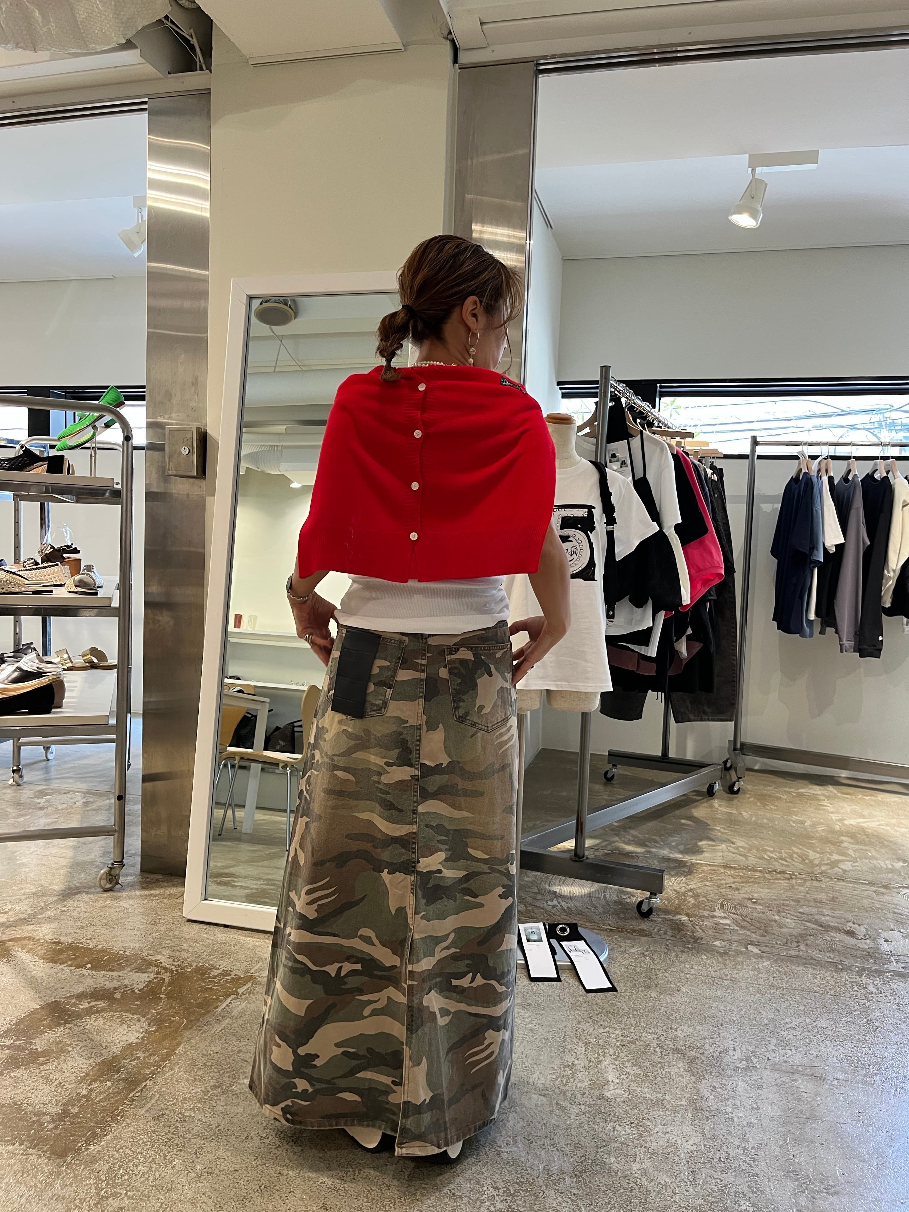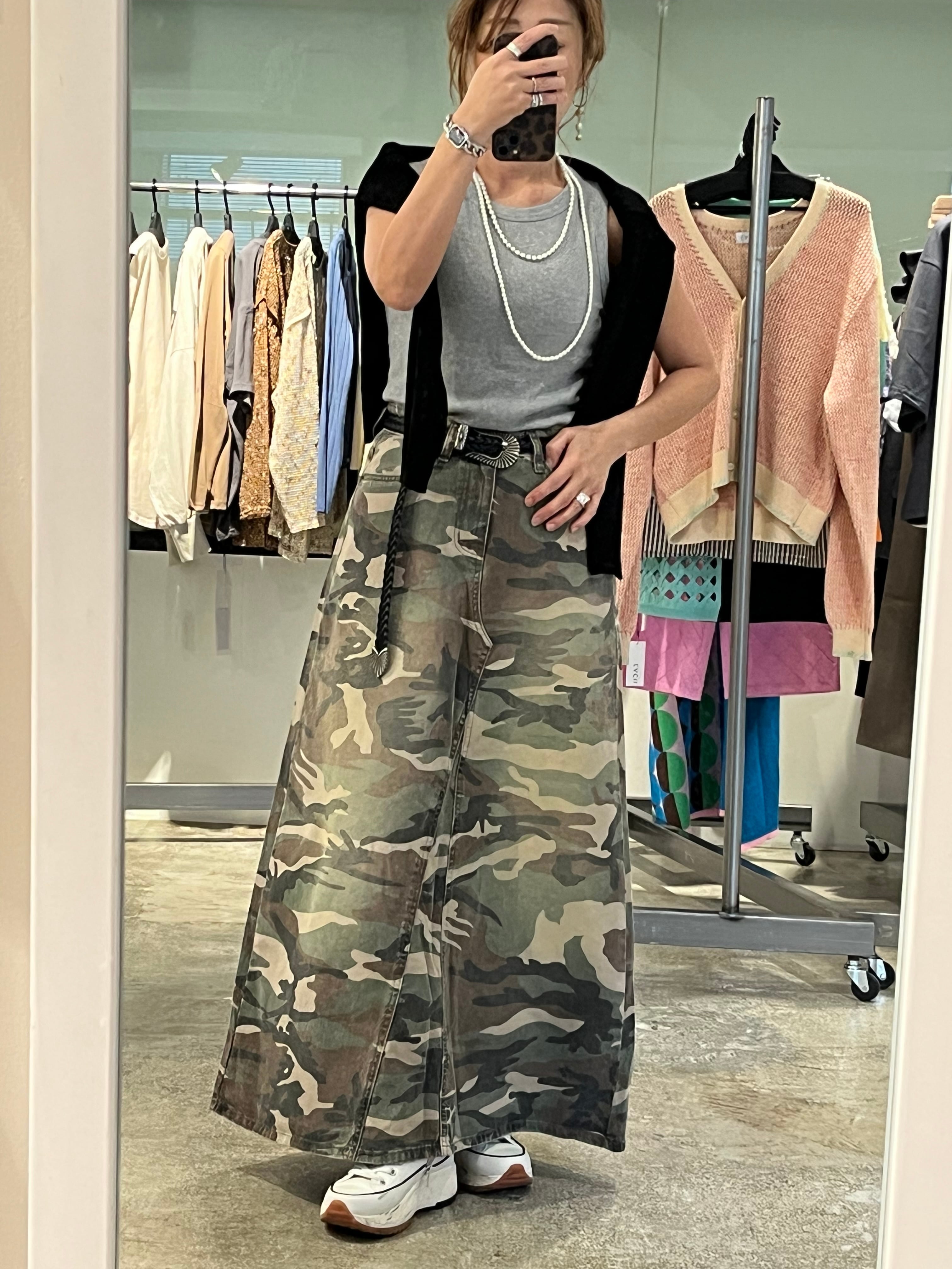 ビンテージ加工されたカモフラ柄が魅力のロングスカート。