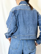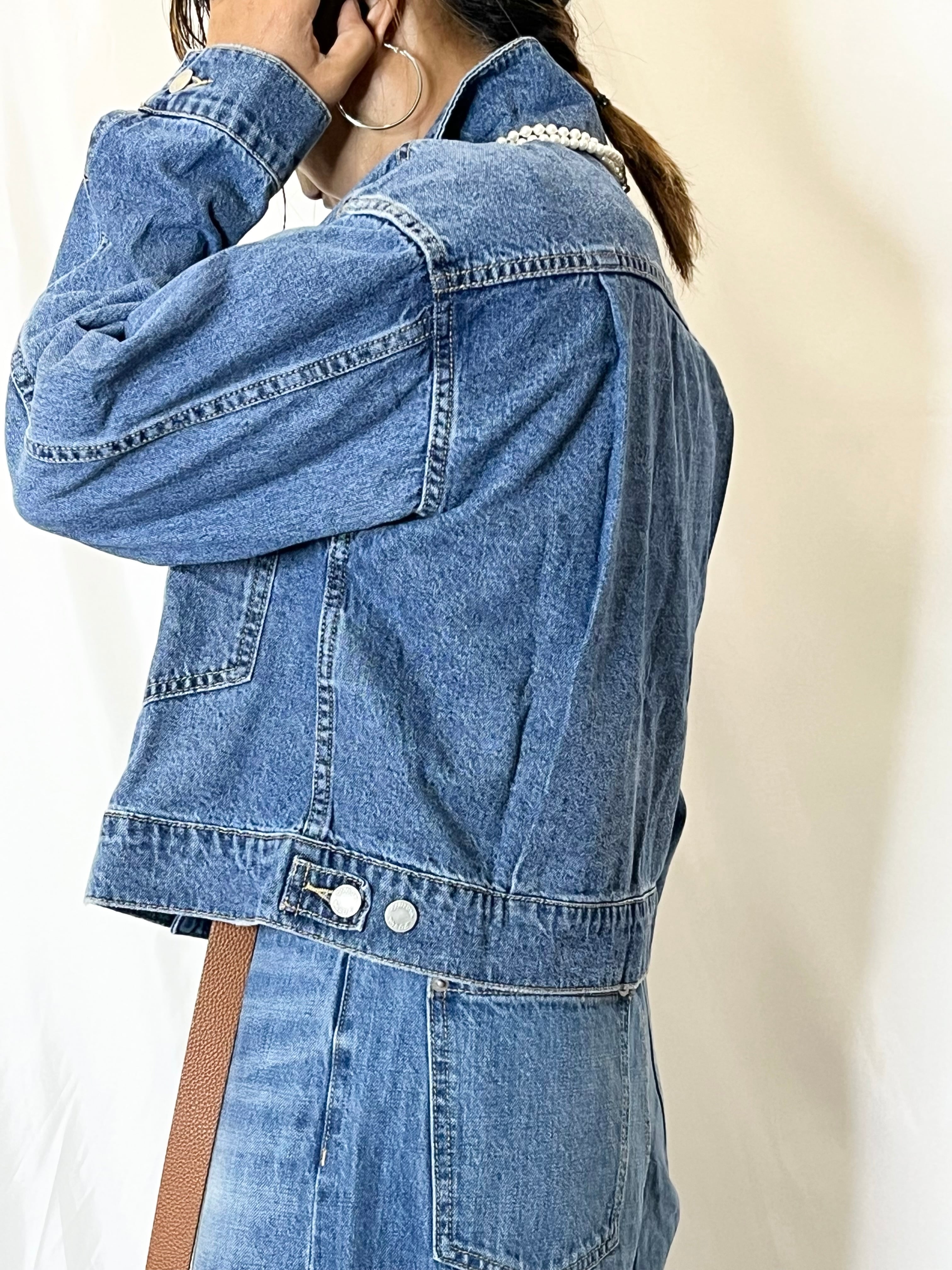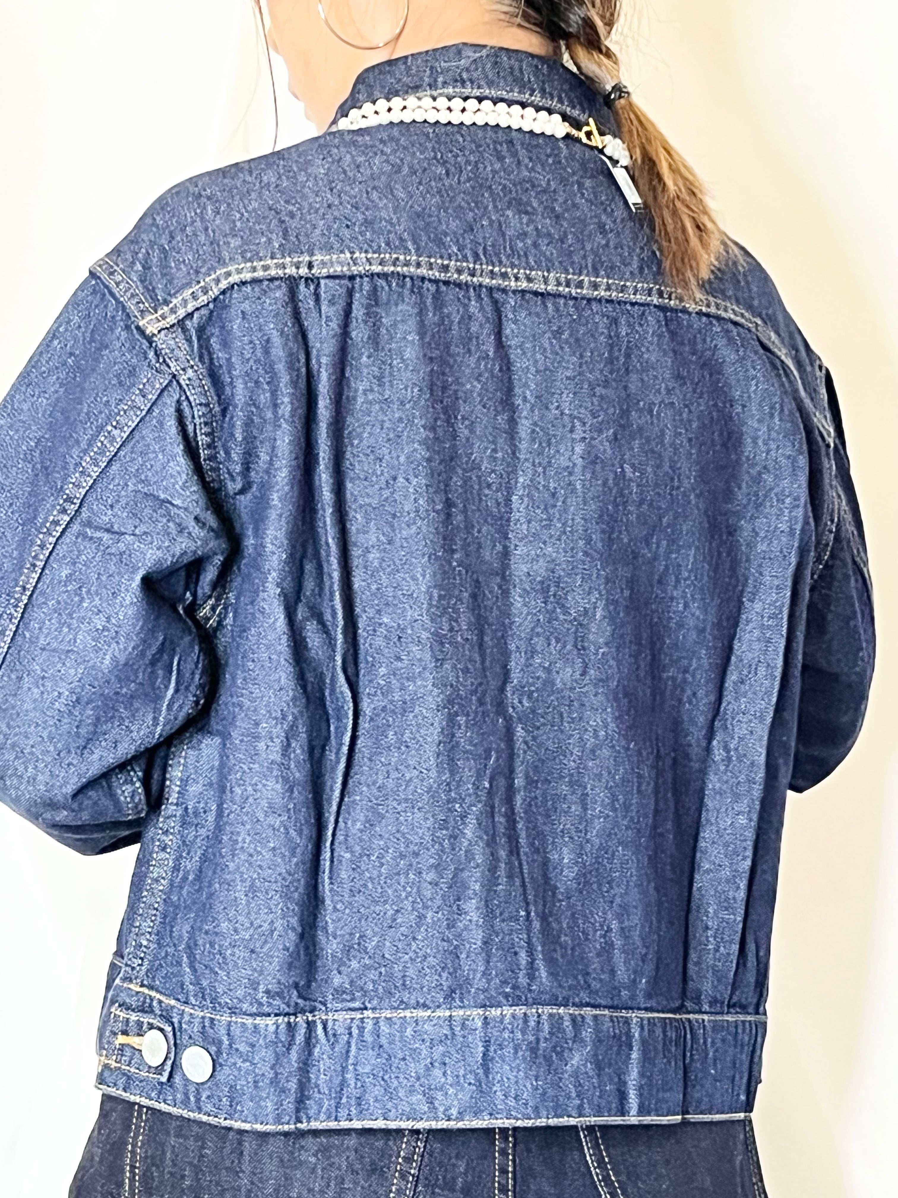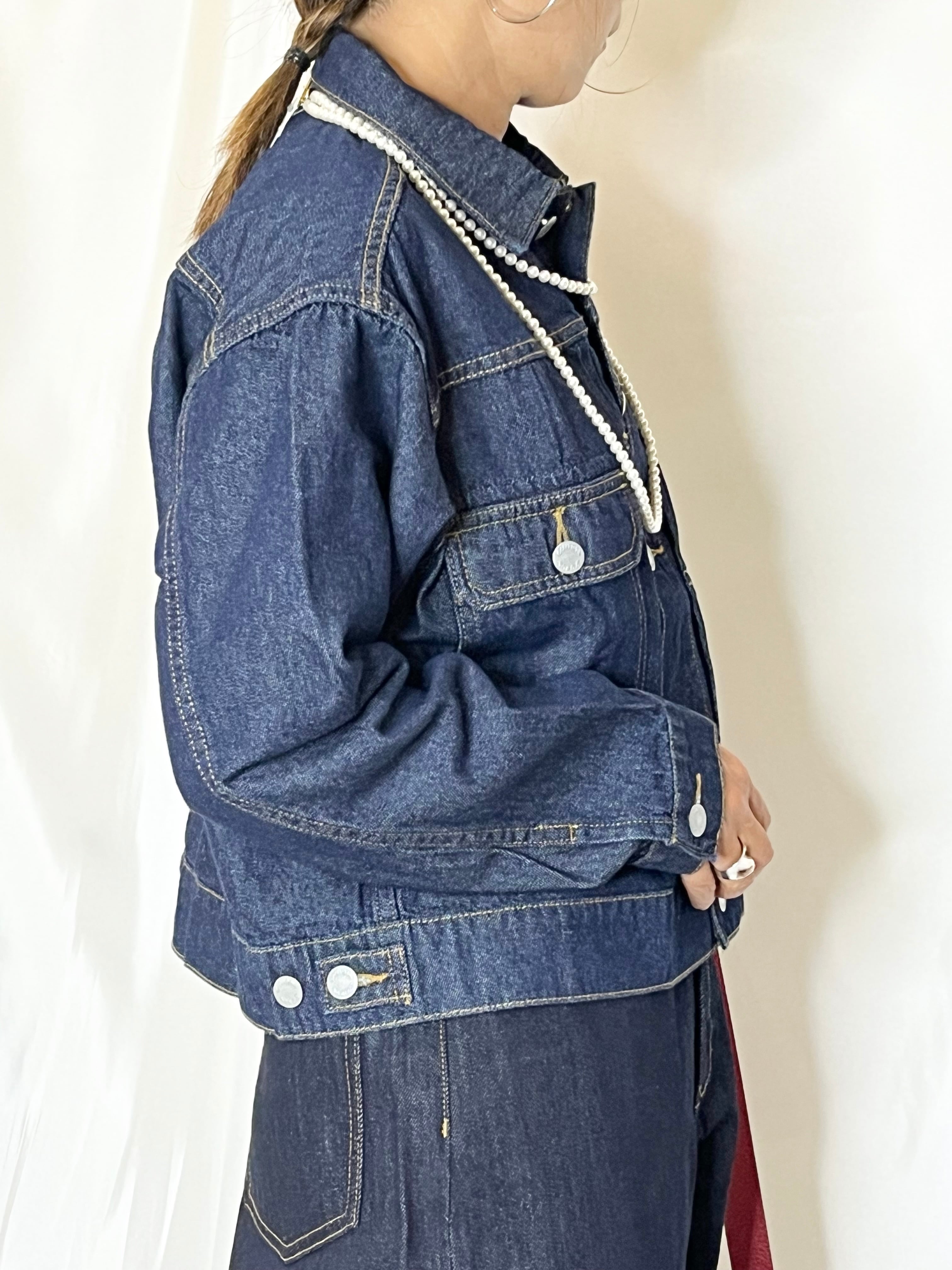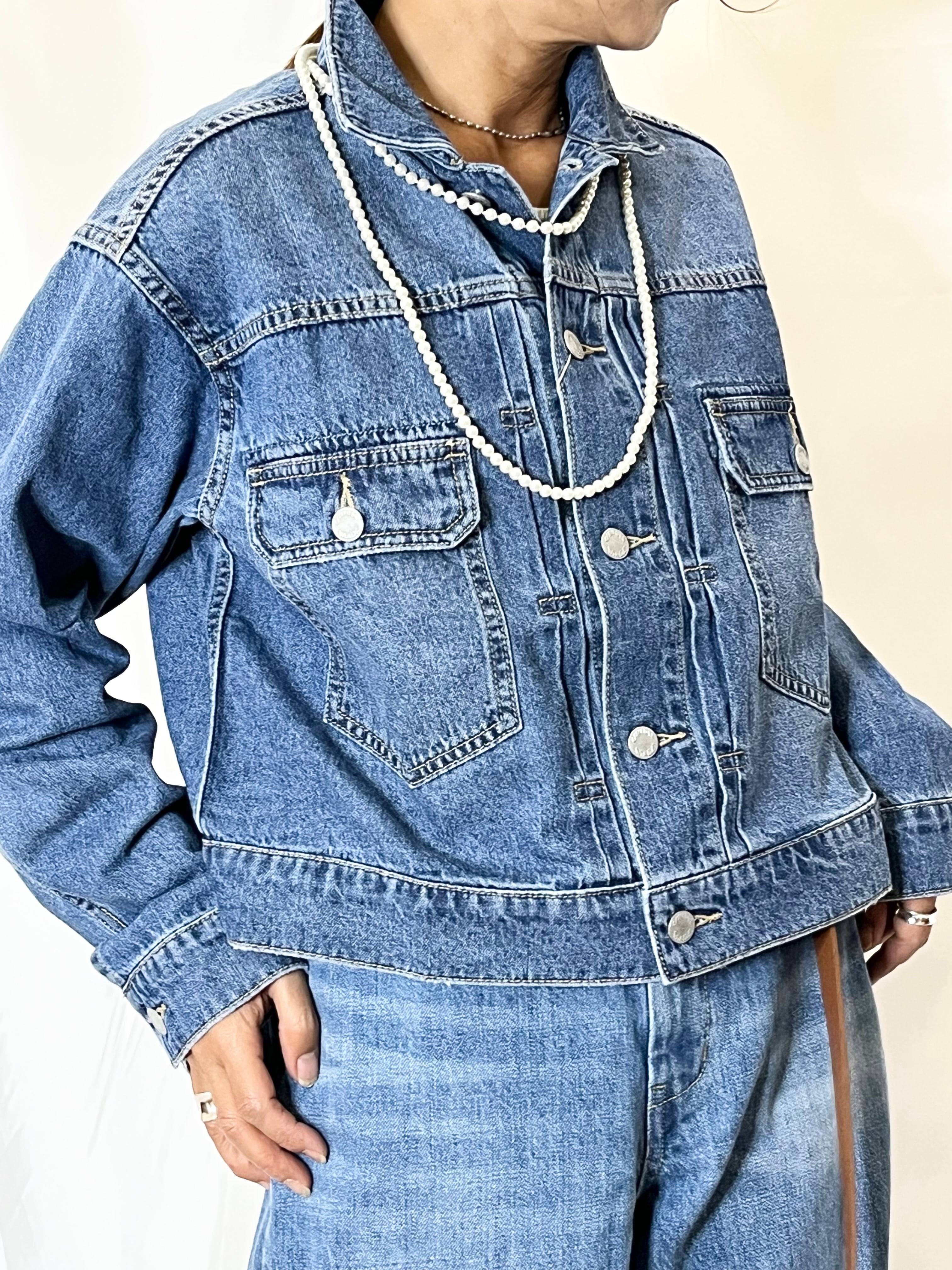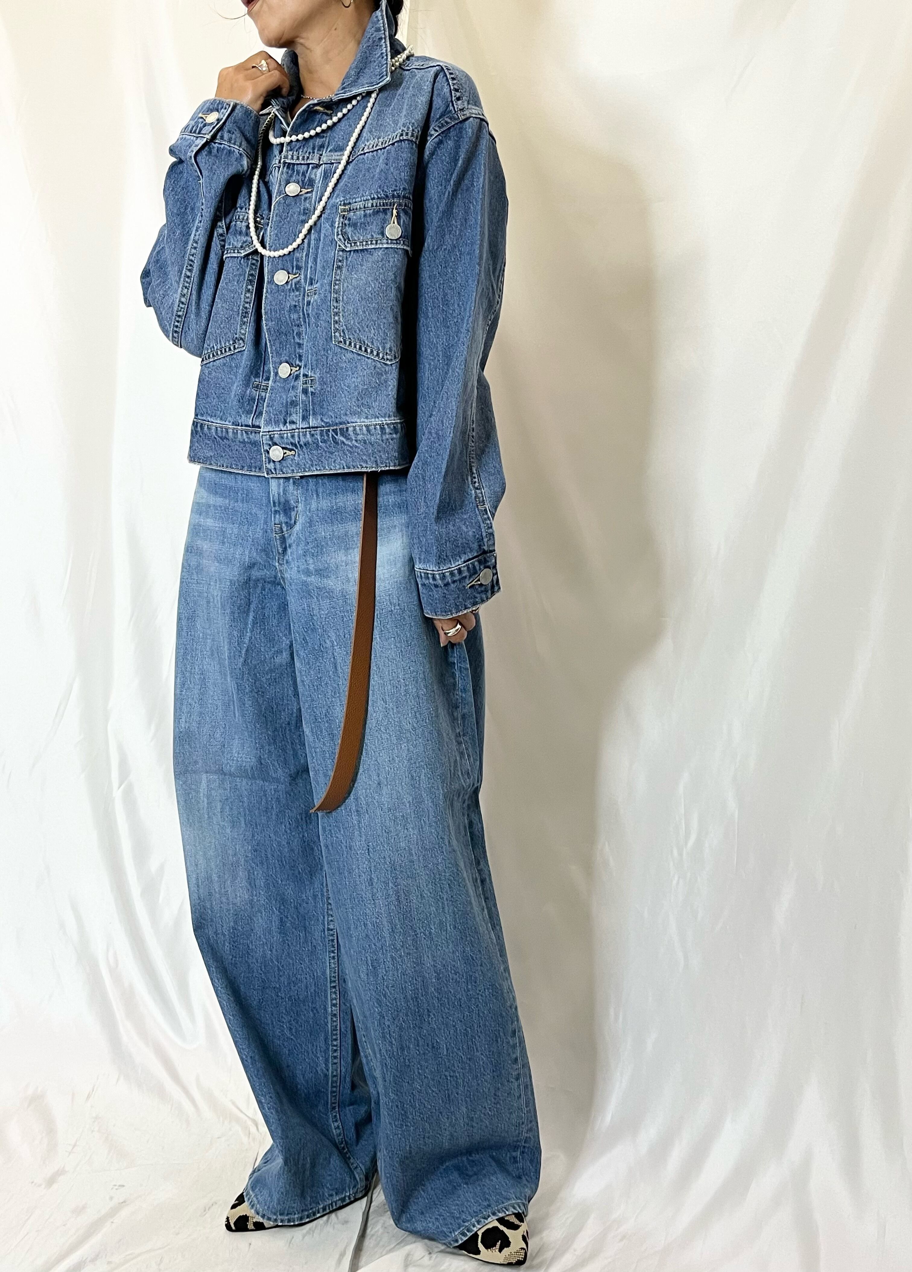 ショート&ワイドのボックスシルエット、フラップ付きポケット、胸周りのゆとりを確保するためのフロントプリーツ。