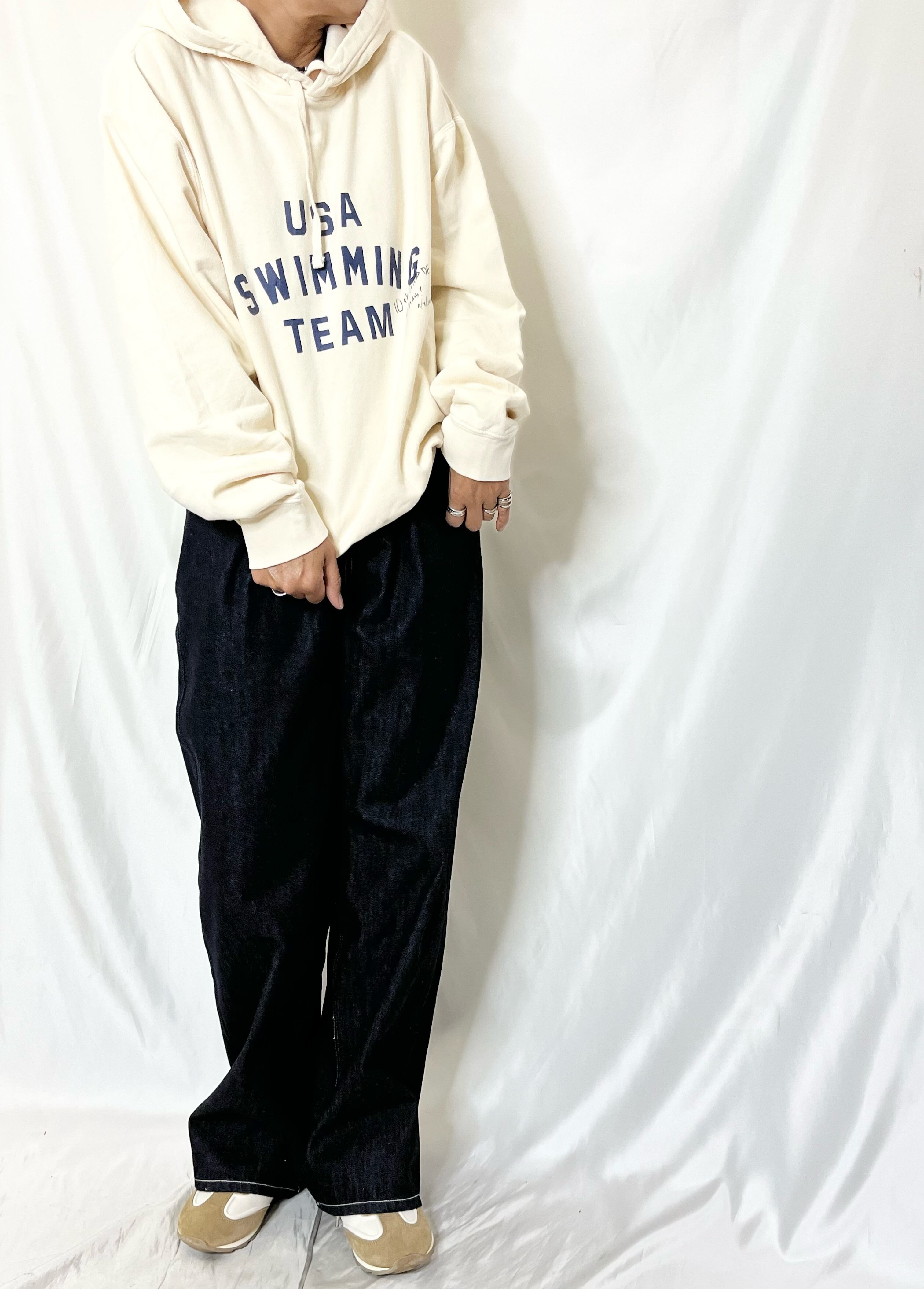ピグメント染め、プリント、製品洗いで加工感のある仕上がりに。
