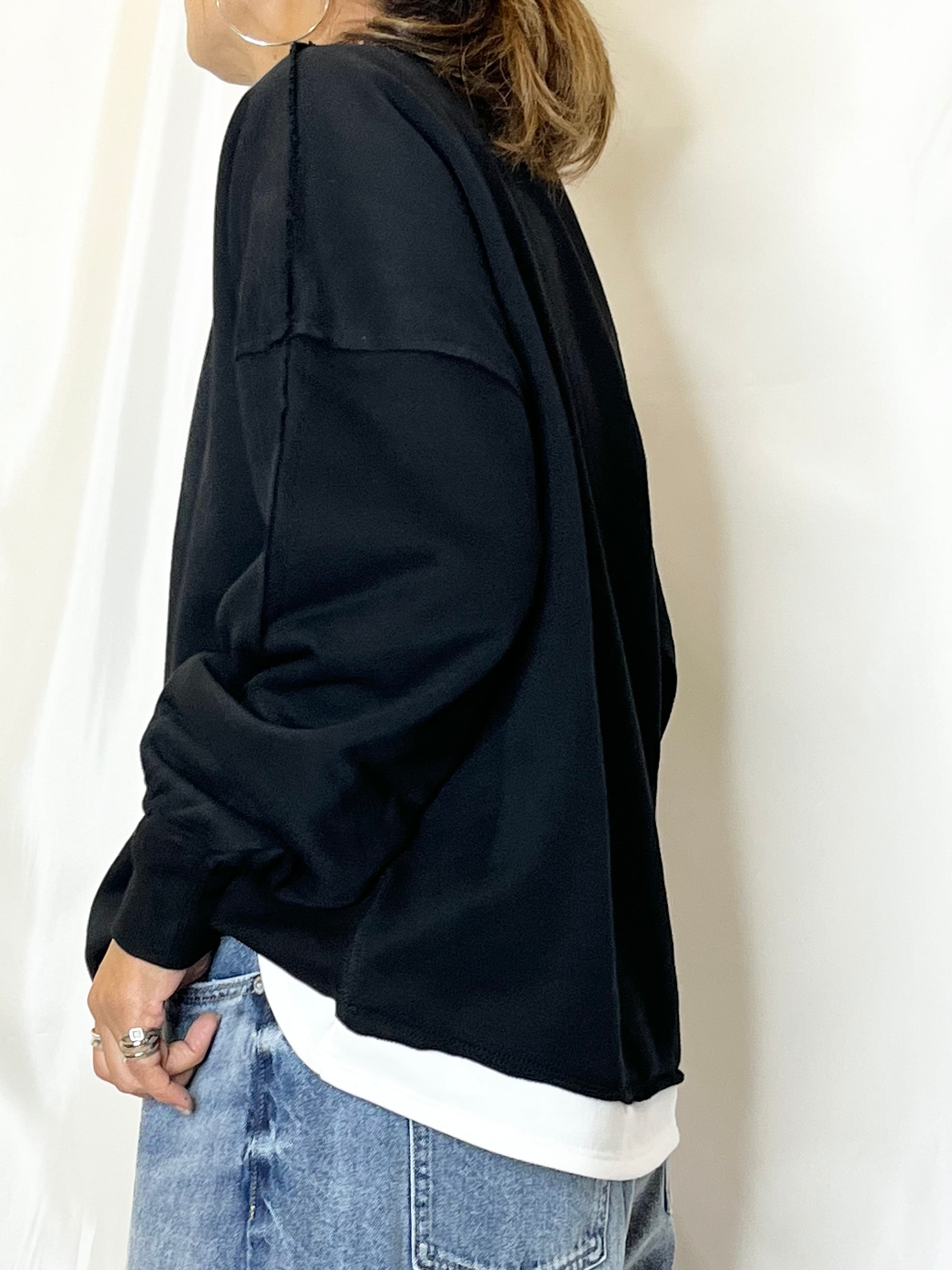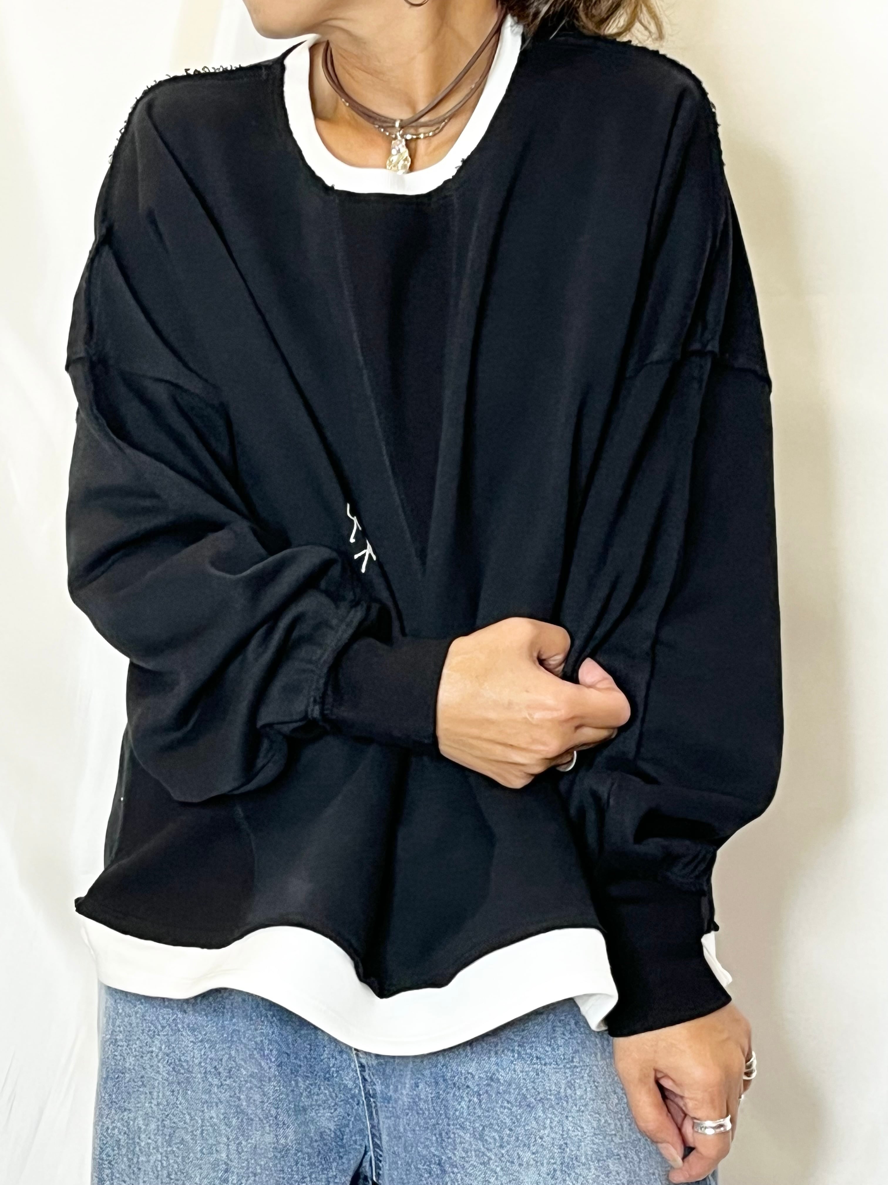 まるで重ね着しているかの様な配色切り替えが目を惹くデザイン。リブ使いで着心地もアップ!