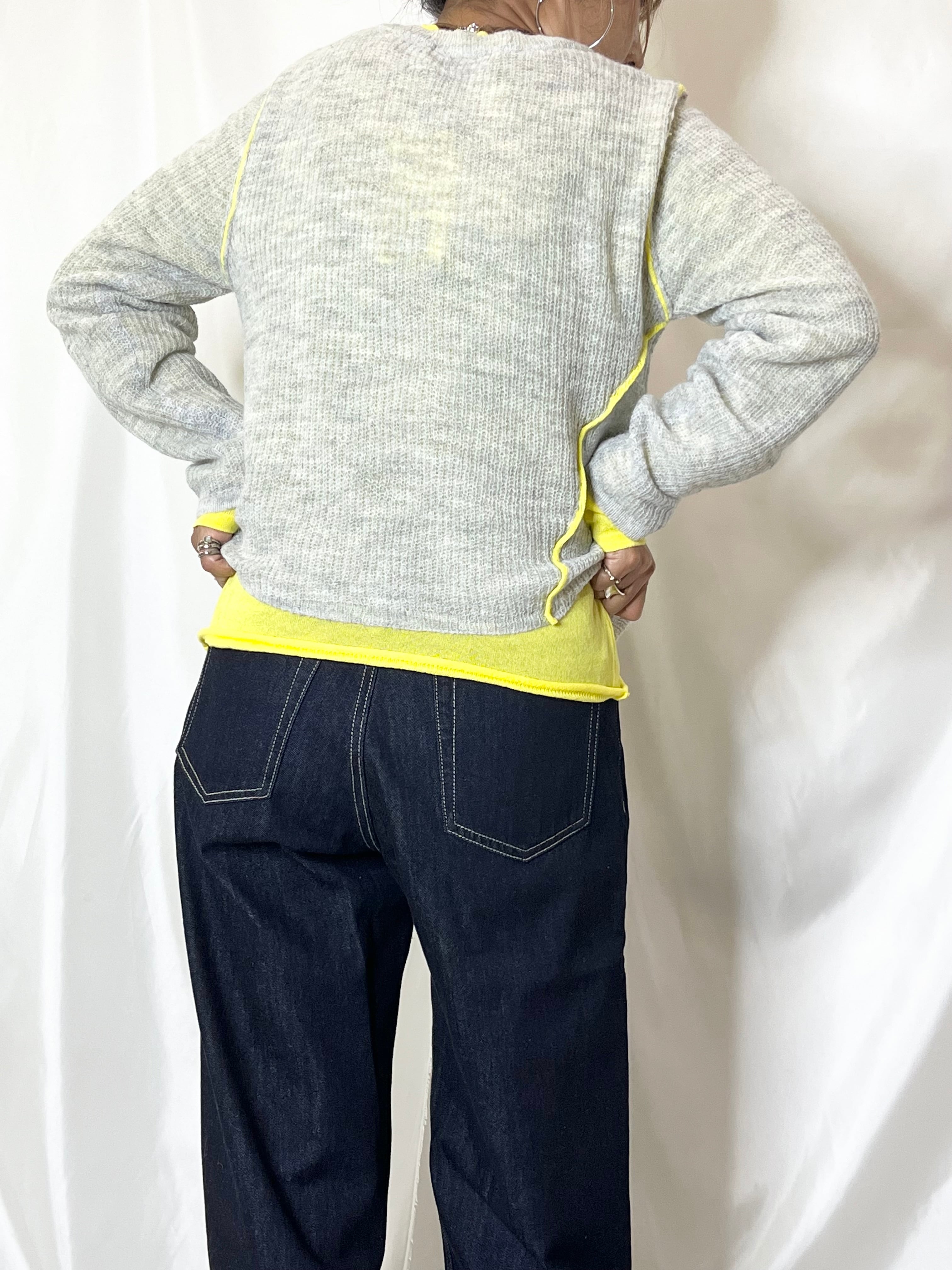 ツヤっとした質感が特徴の糸をハイゲージでインナーとして仕上げ、モヘアの糸をシアーに軽やかに重ねる事で重たくない印象に。