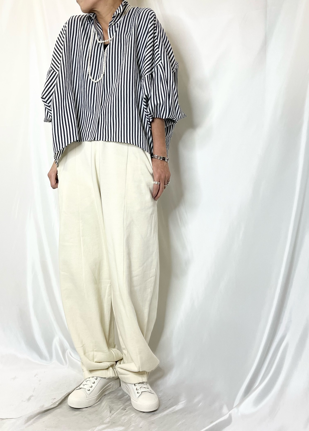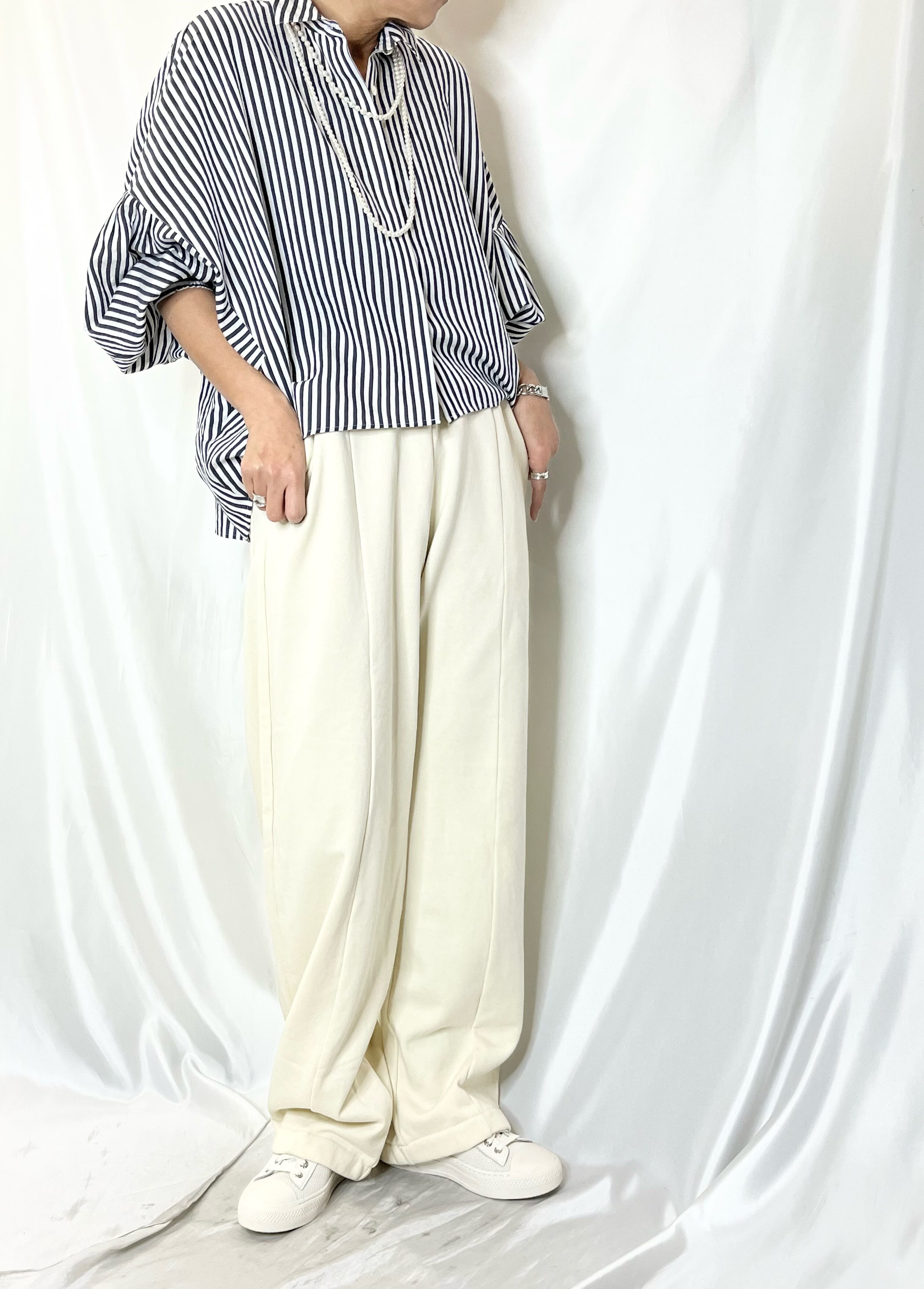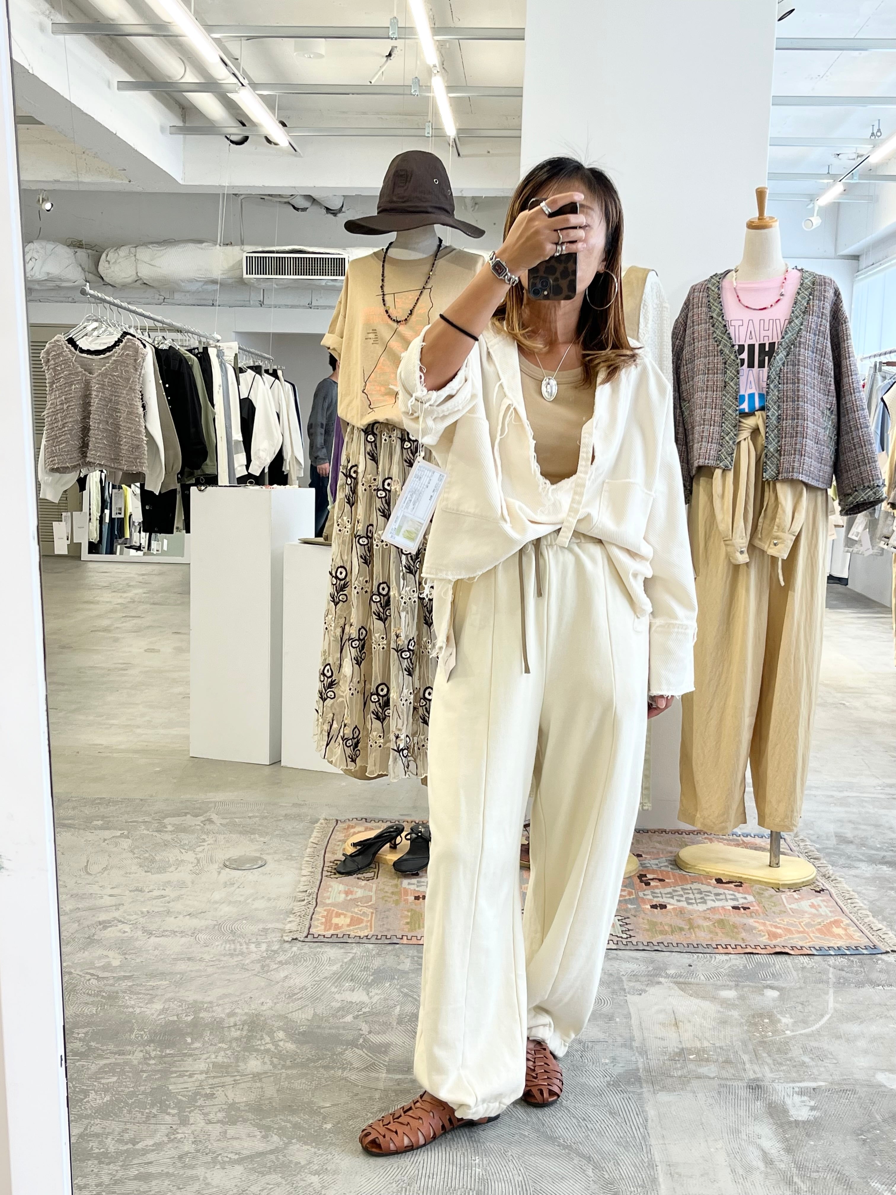 バルーンシルエットのスウェットPTは、脇ライン、前シームが丸みのあるパターン。