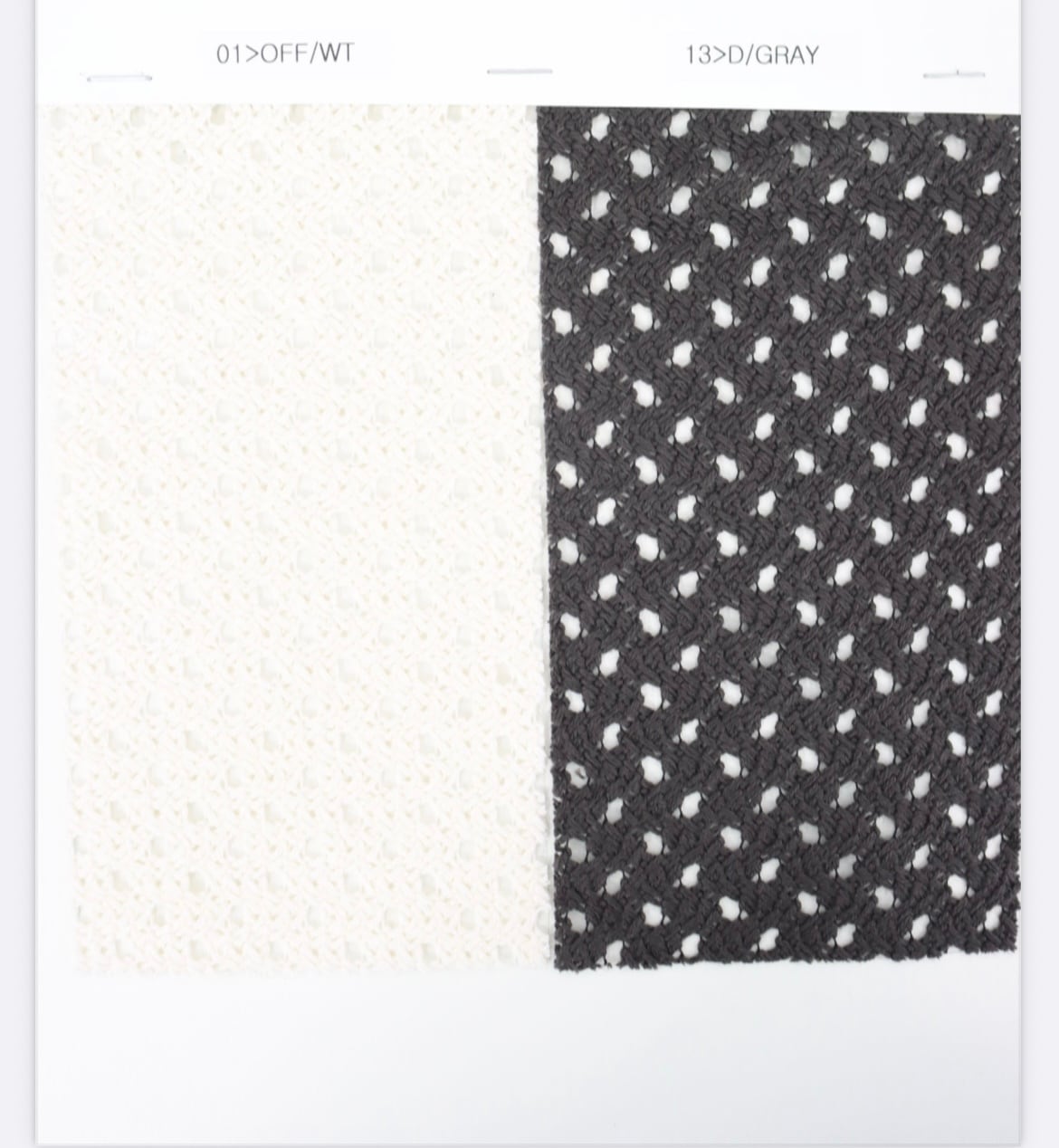 太番手の糸をバスケットのようにザックリと編み立てたような素材。ラッセル編みでニットに比べて型崩れしにくい特性があります。