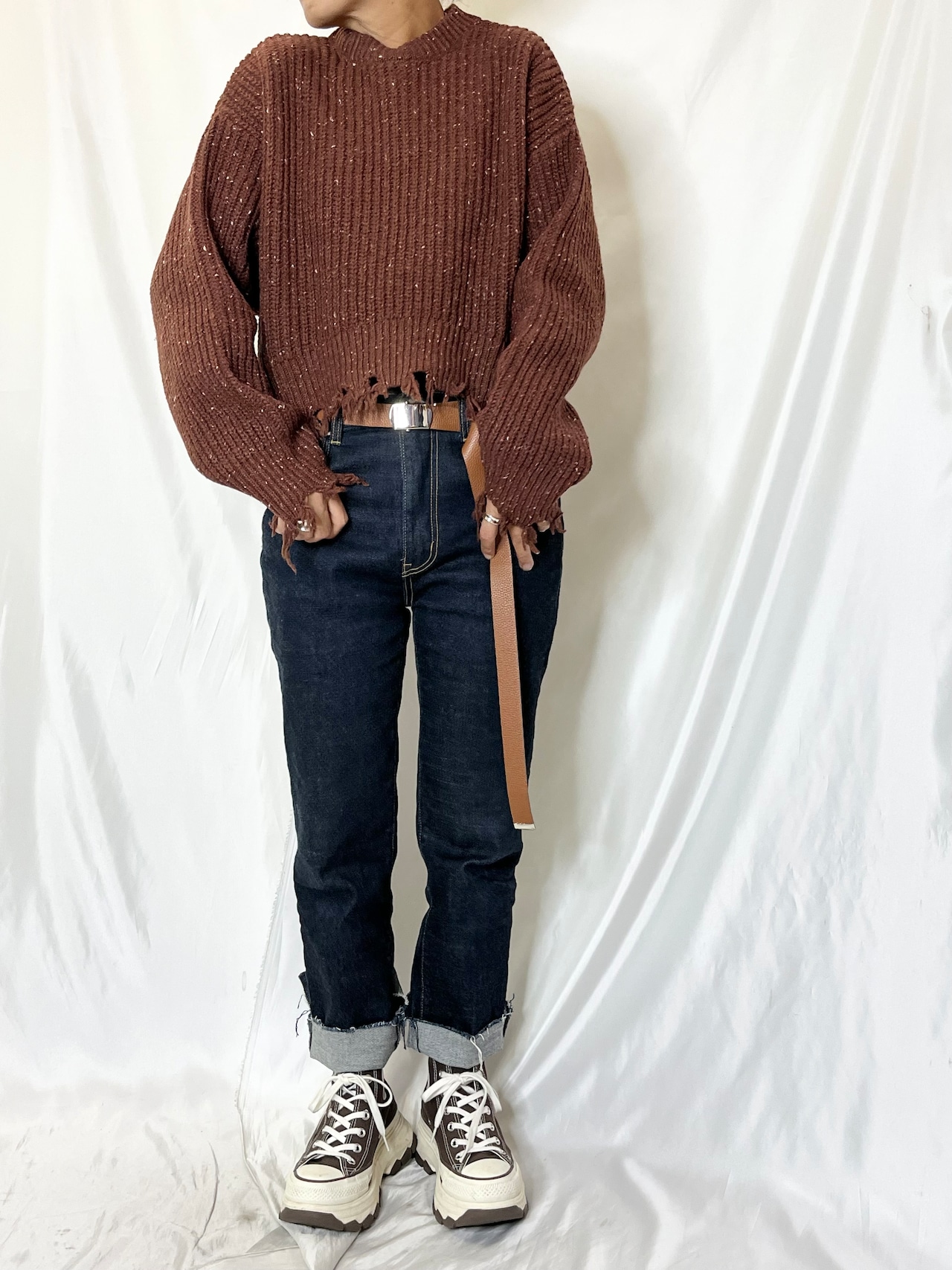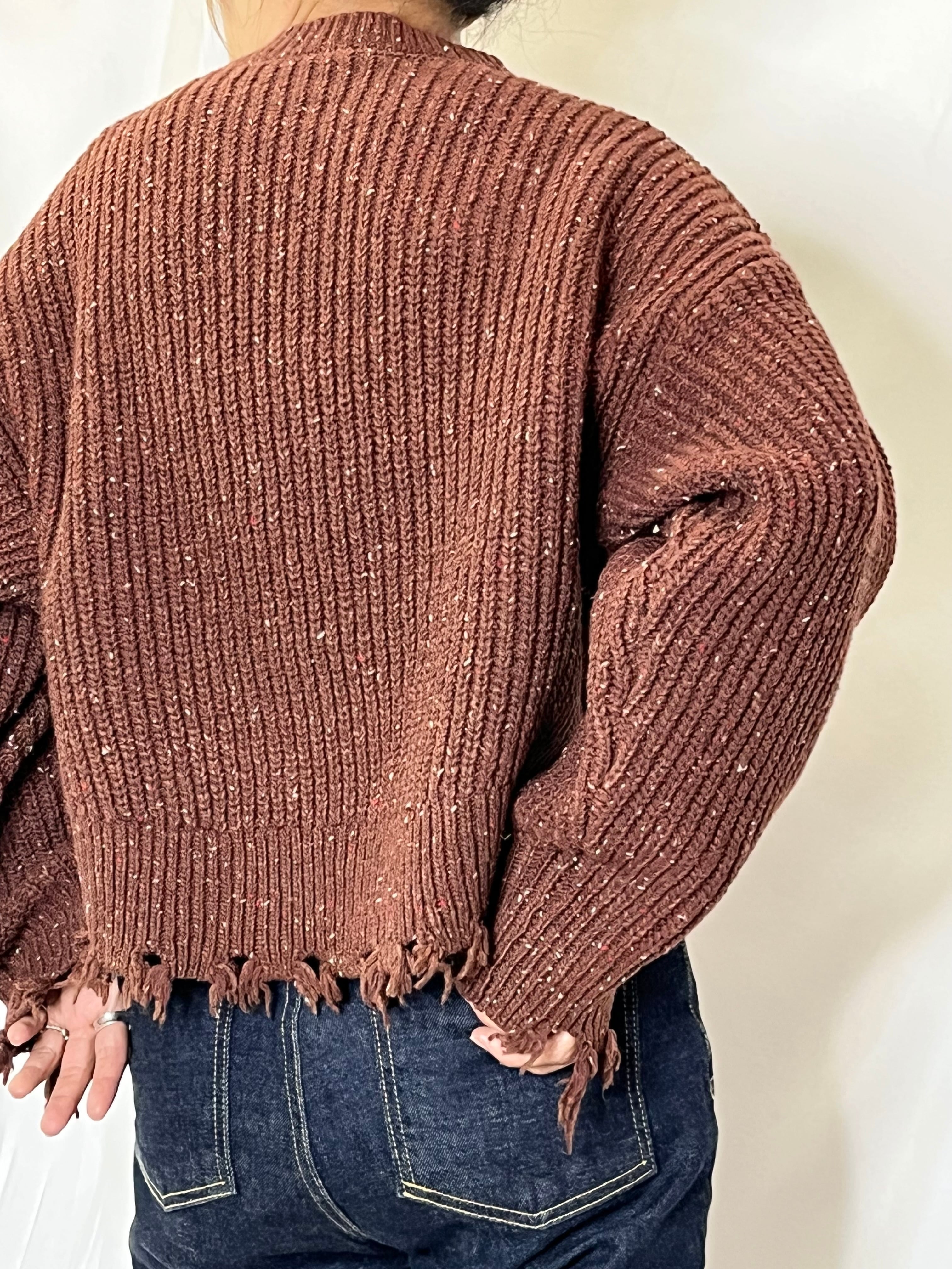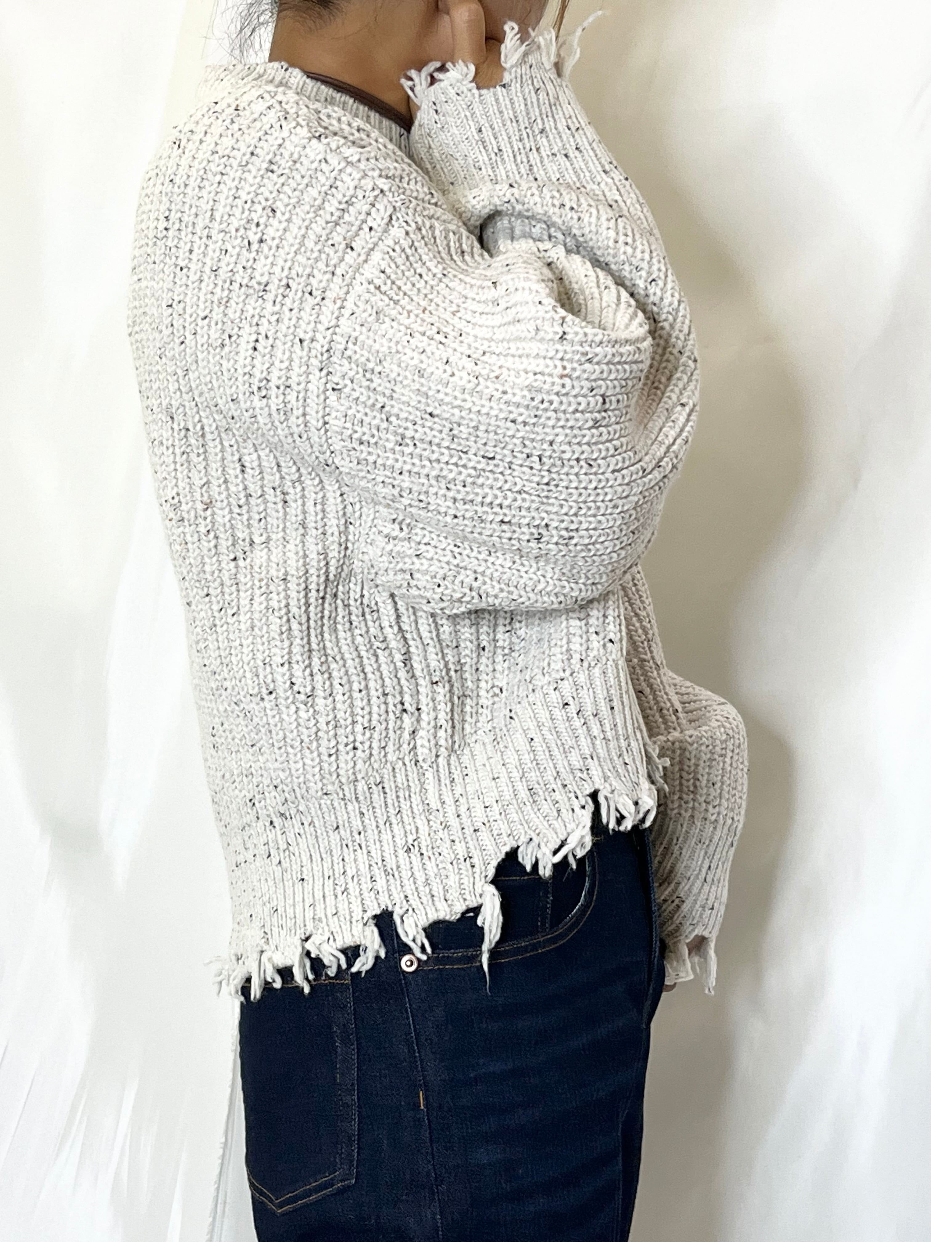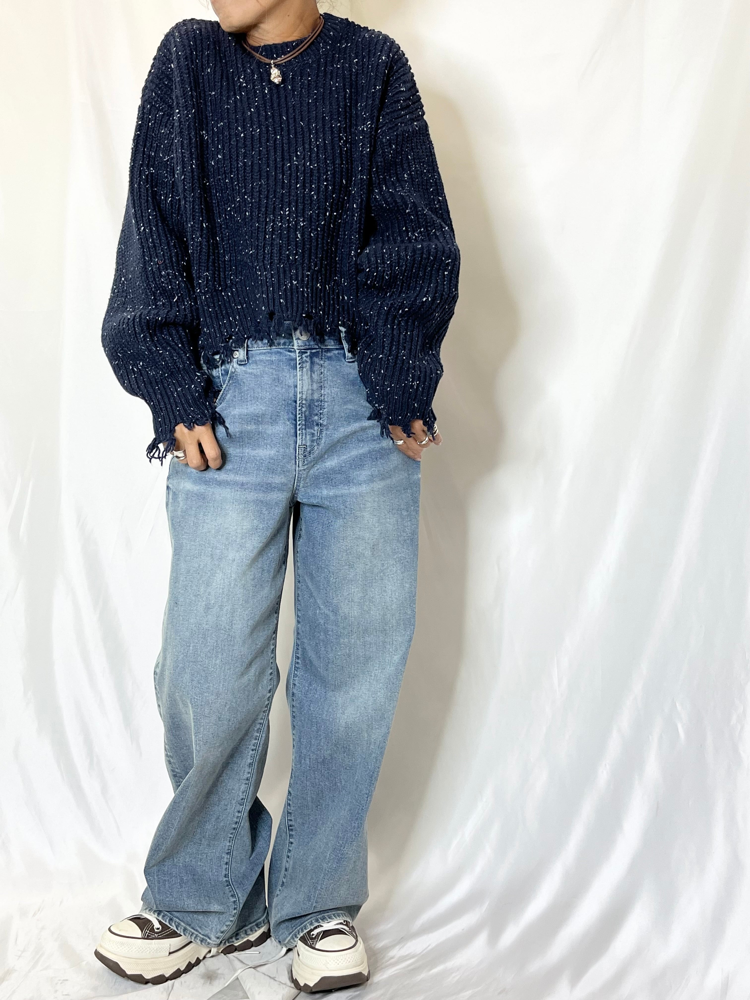 ショート丈にダメージデザインが可愛いネップヤーンニット。