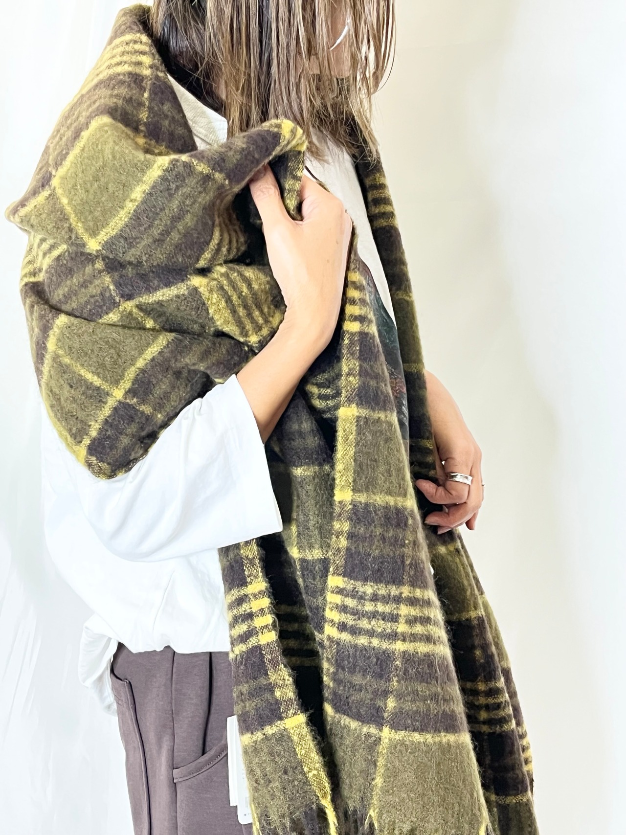 風合いの良いシャギーチェックの大判マフラー。