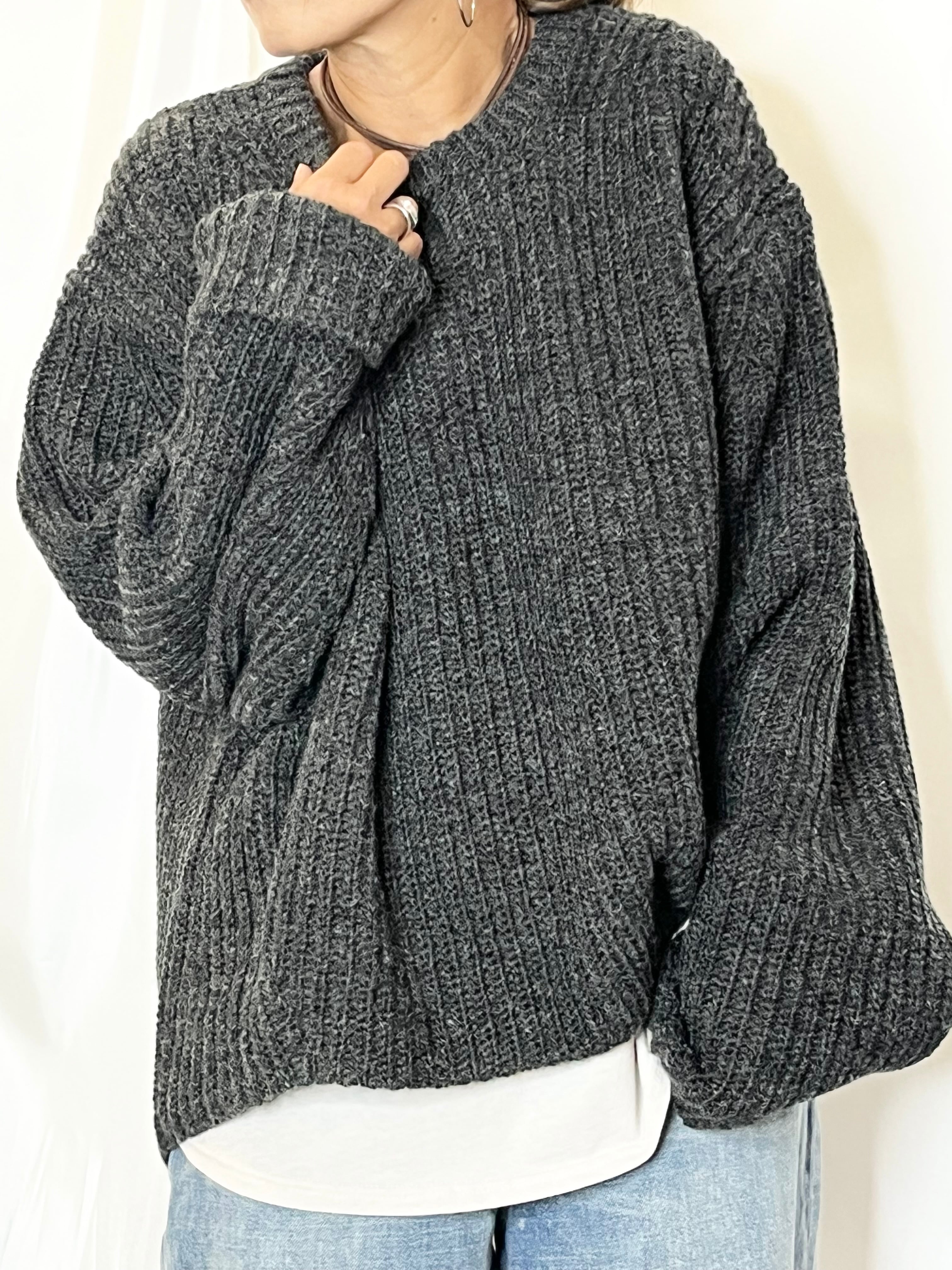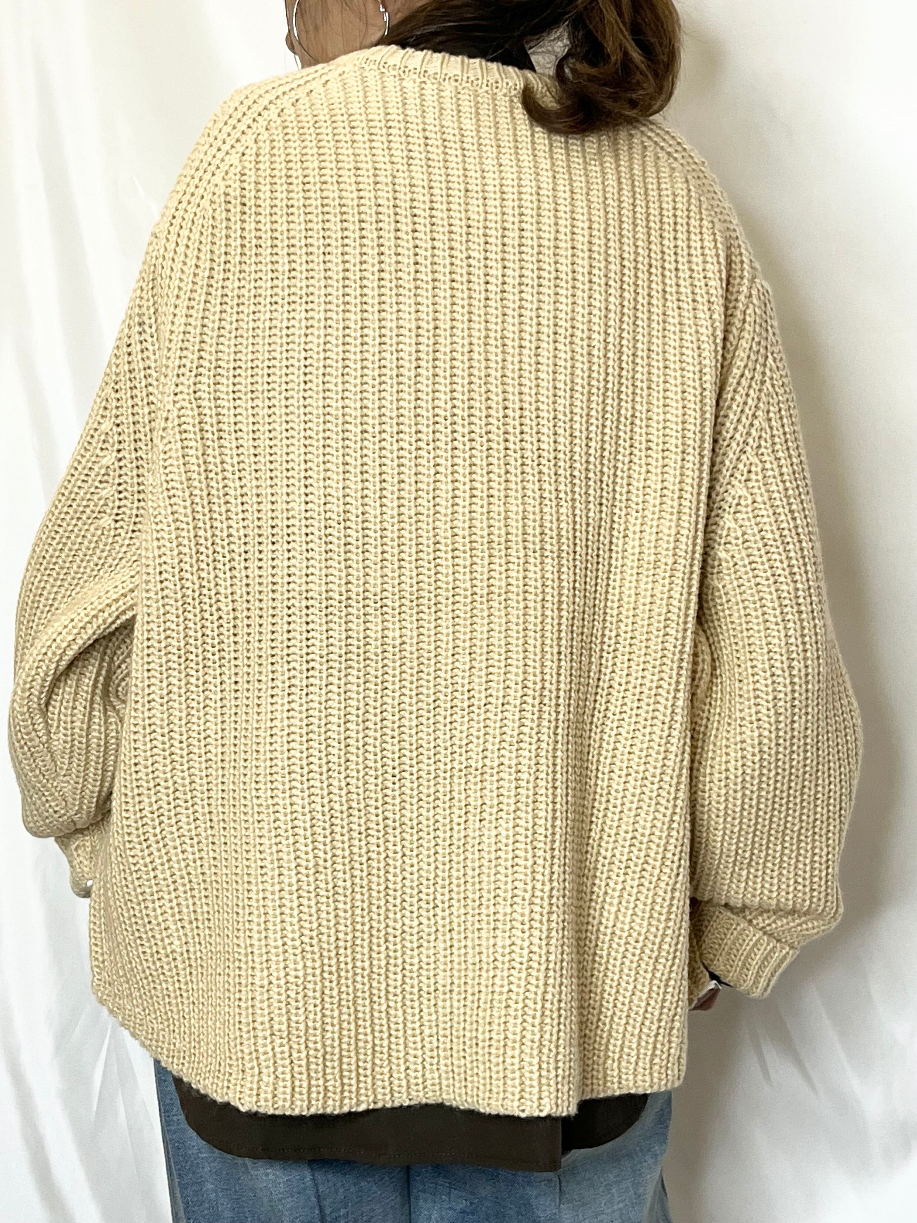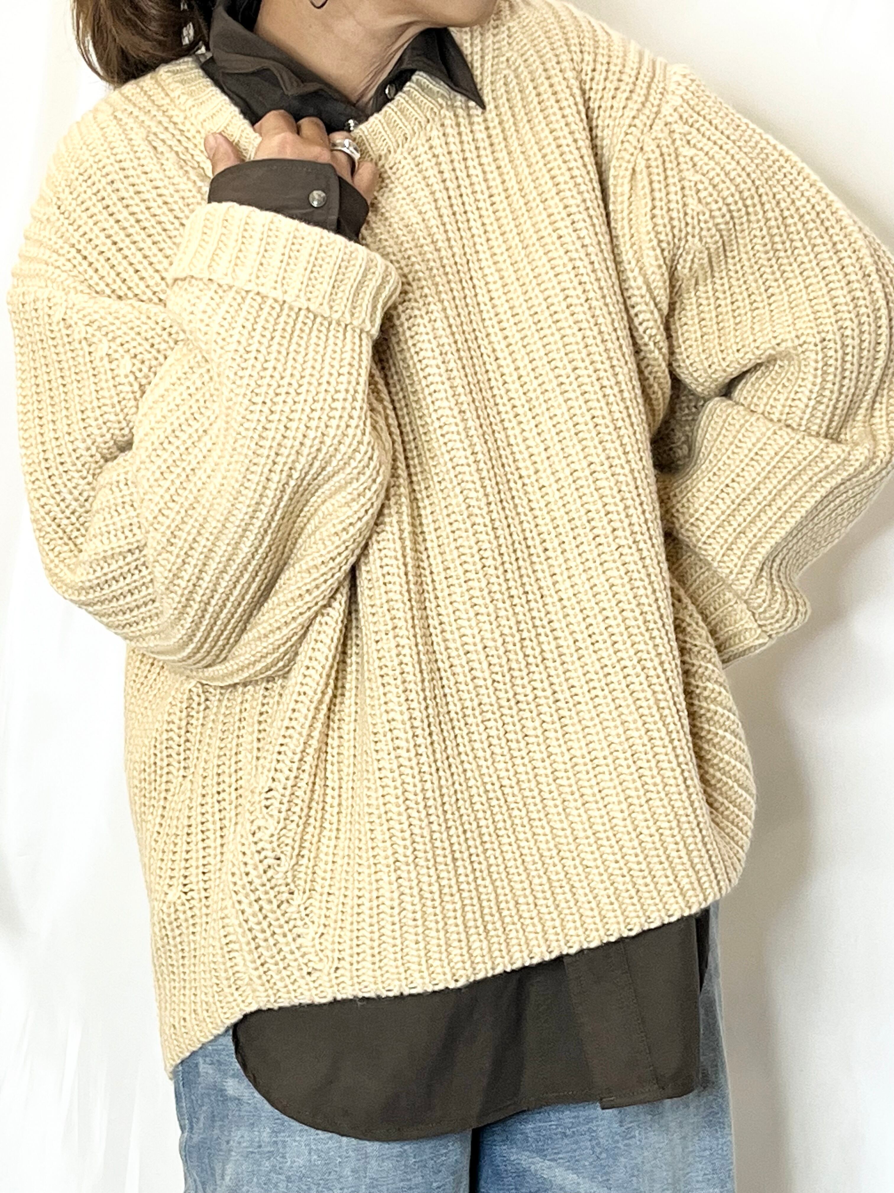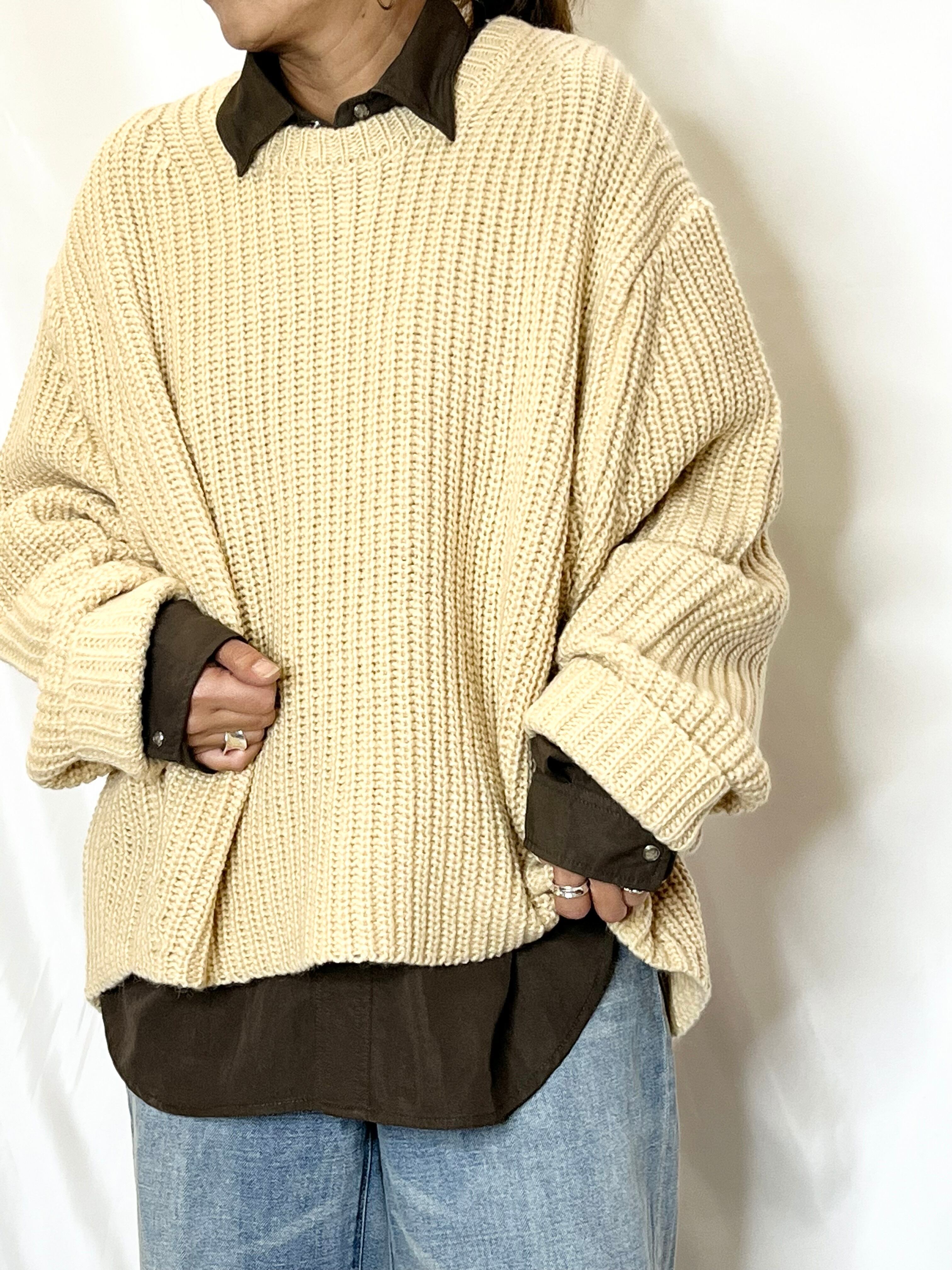 畦編みニットプルオーバー。