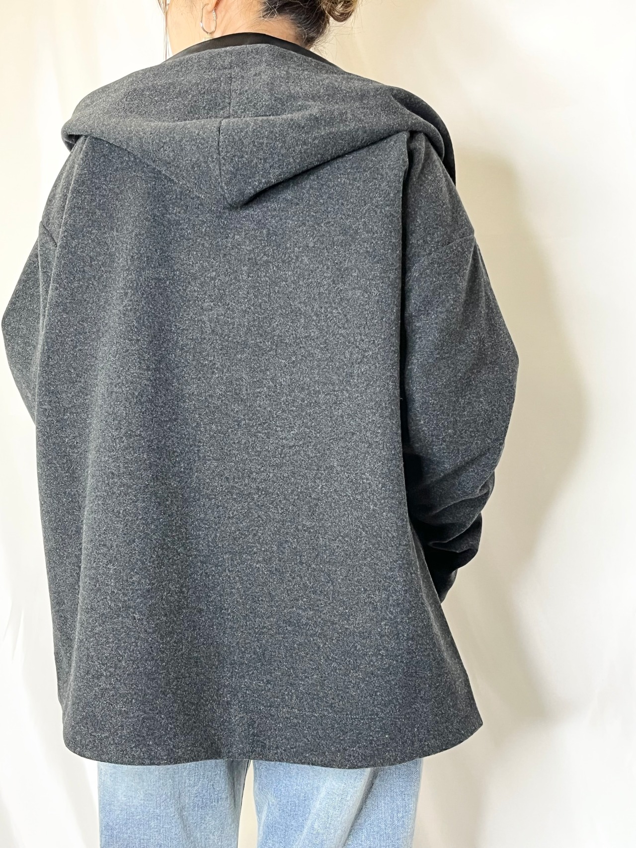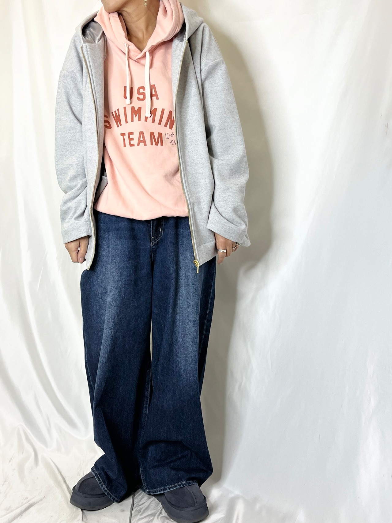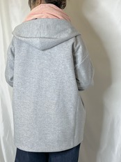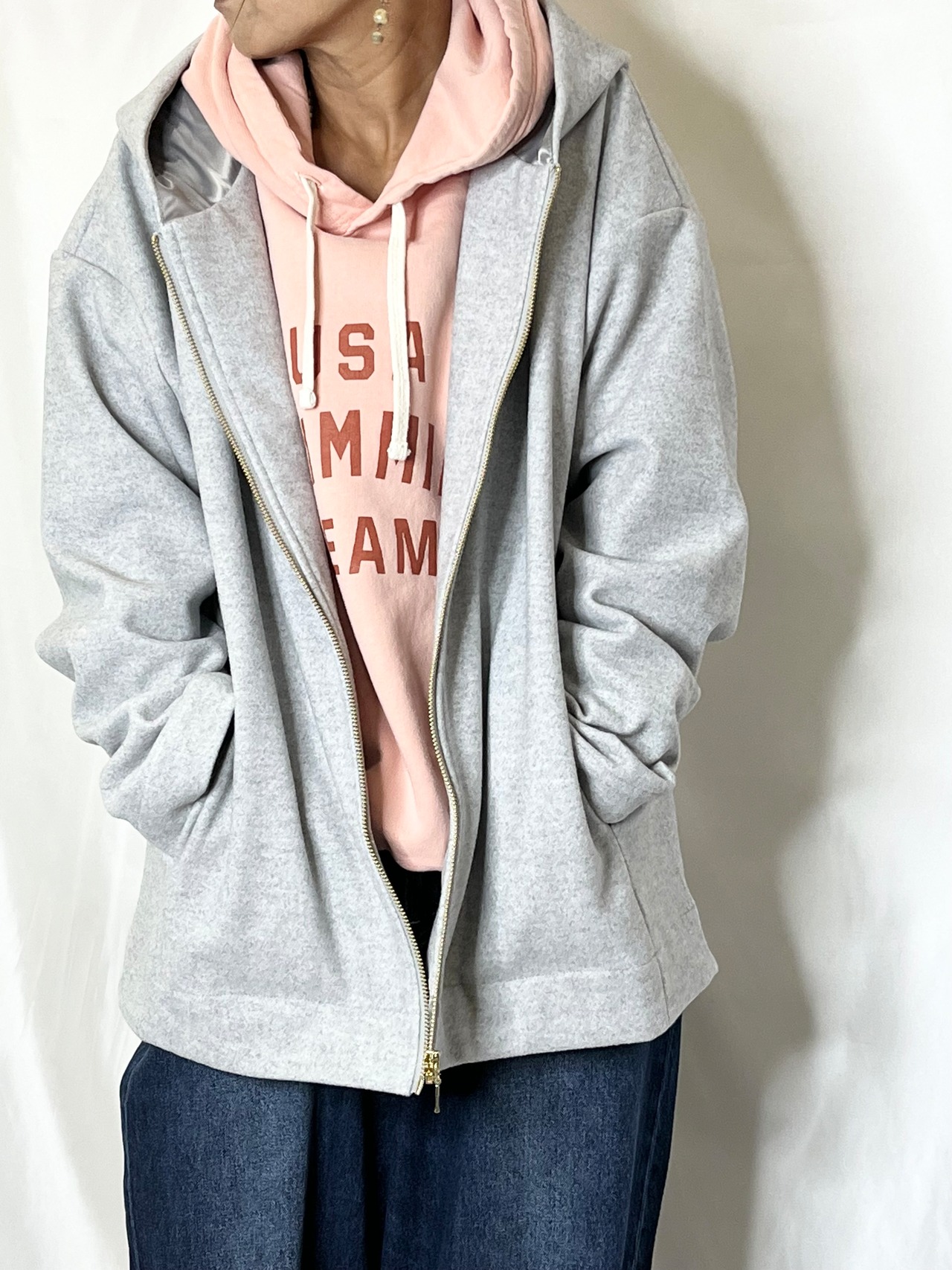 ゆったり身幅で前振りの立体的な切り替えラインでスッキリ見えし、ややコクーンシルエット!