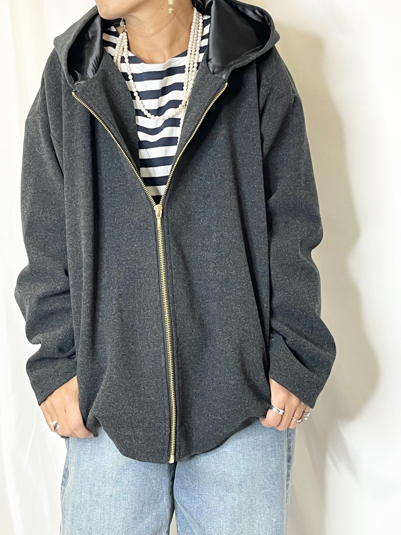 フードうらと裾裏をサテン生地に切り替えあり、シンプルながらも女性らしさのあるフード付きブルゾン。