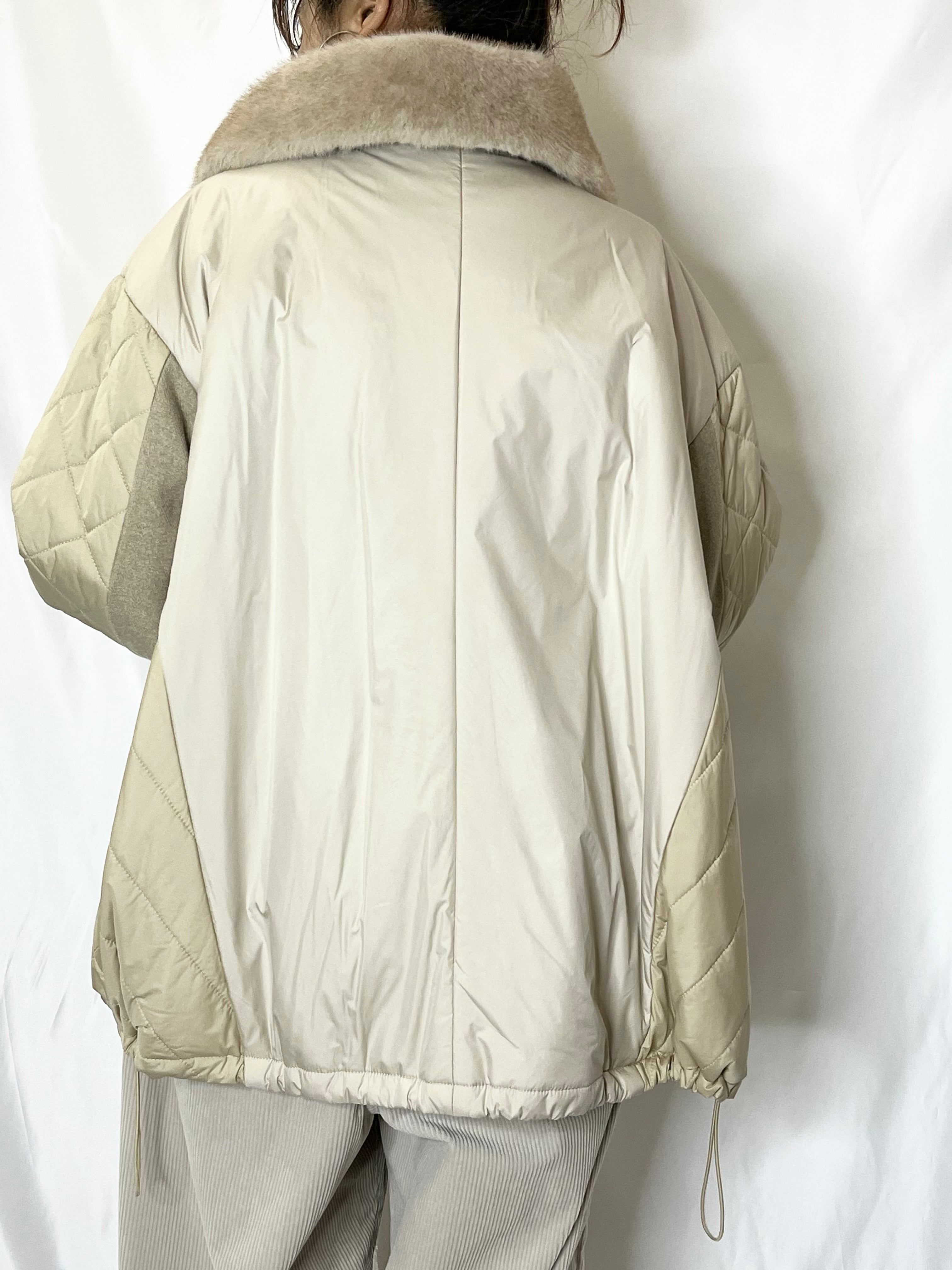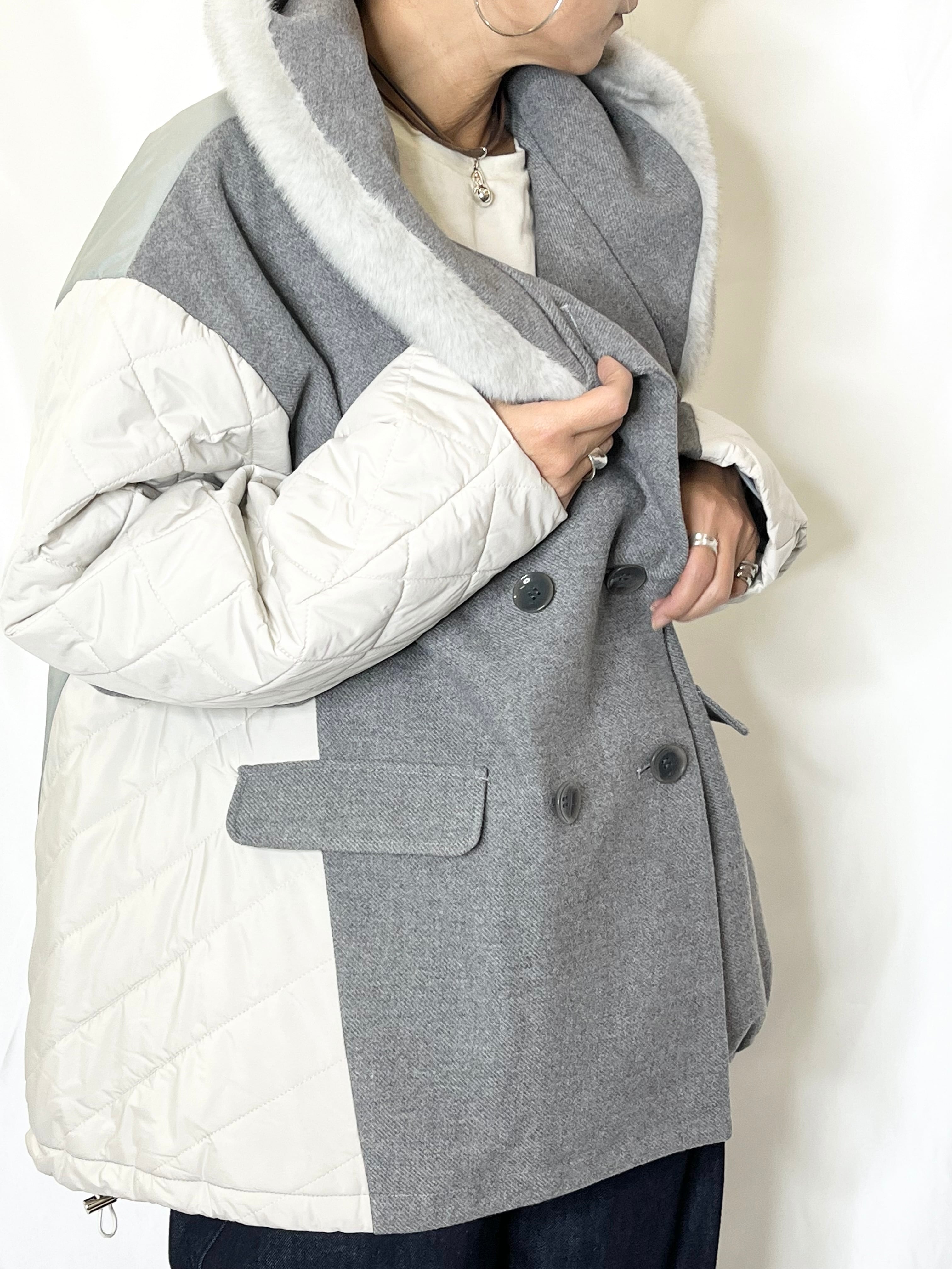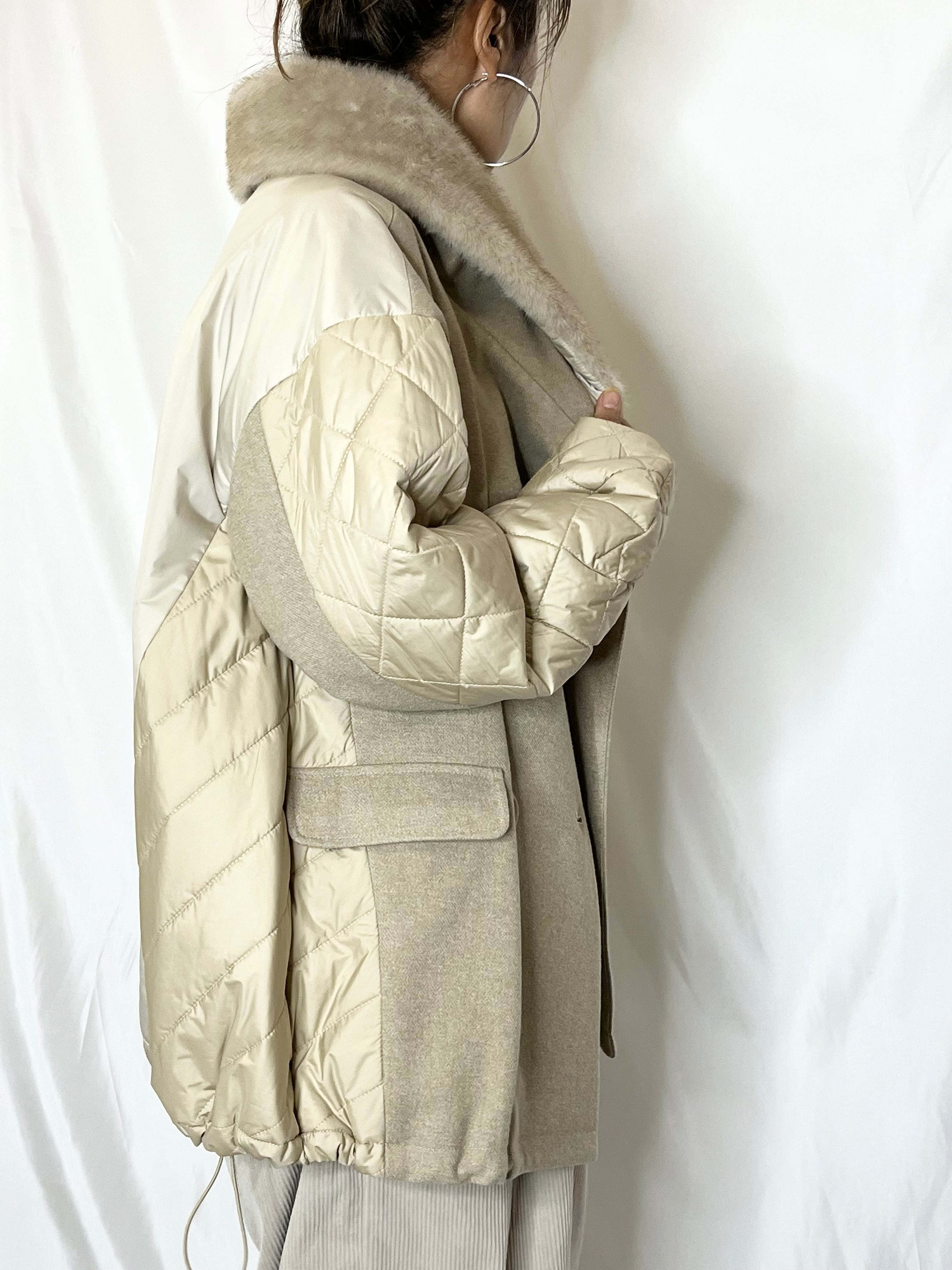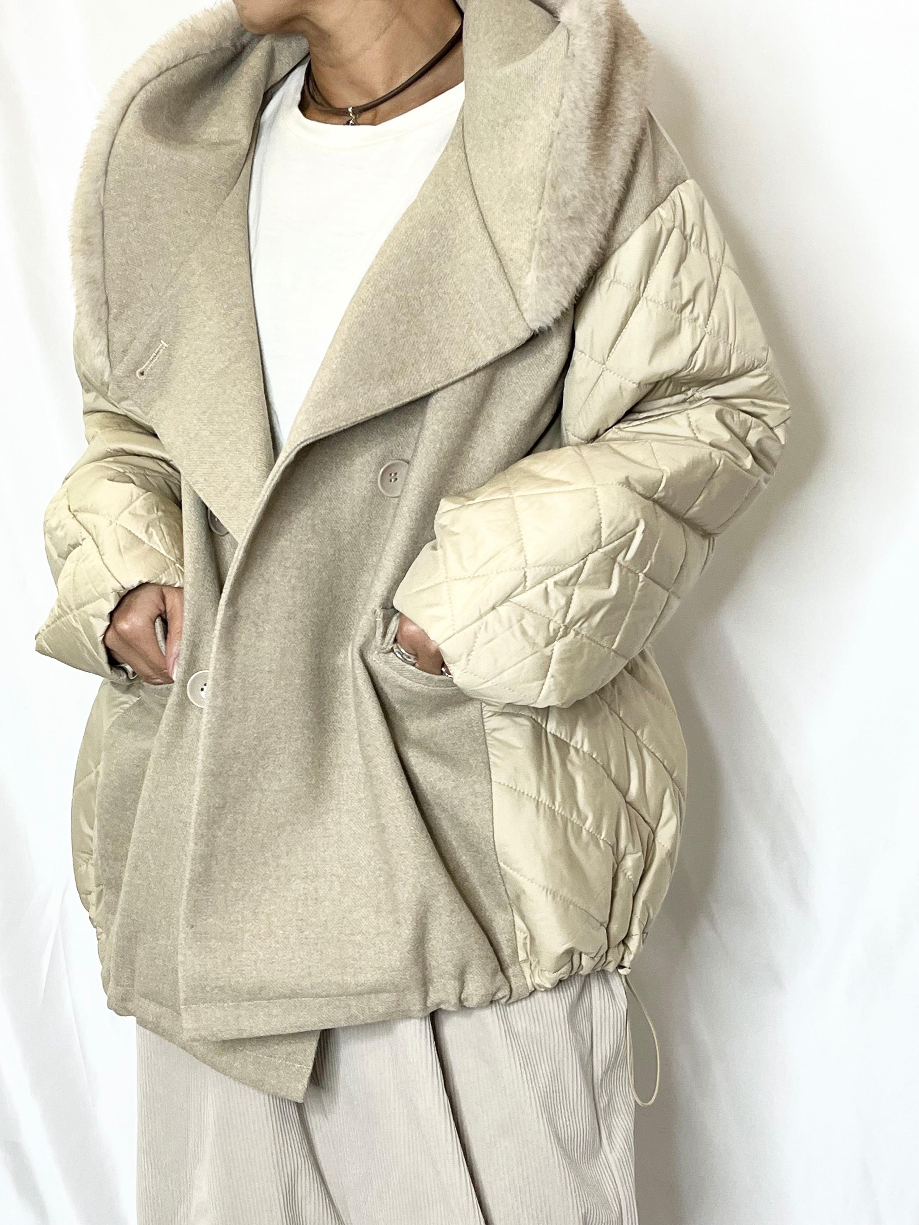 ウールライクな温かみのある素材にナイロン中綿の異素材で仕上げた軽量アウター。