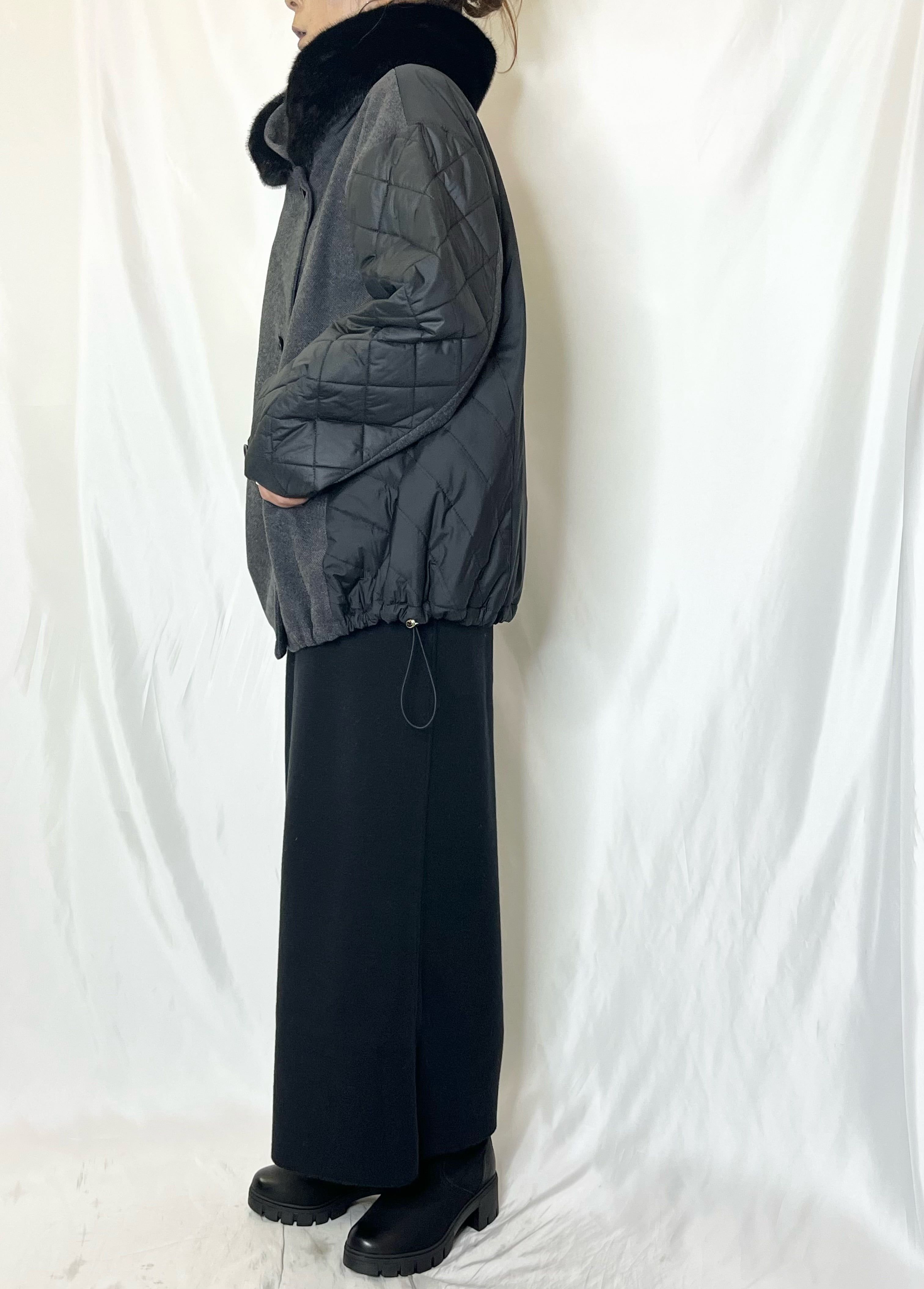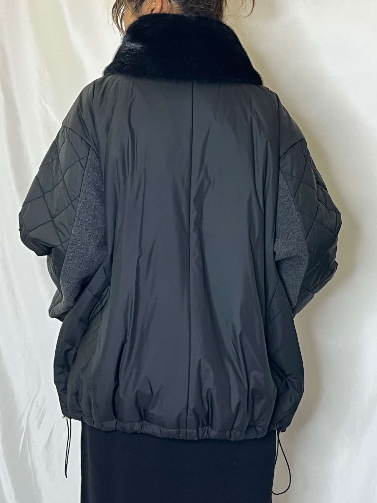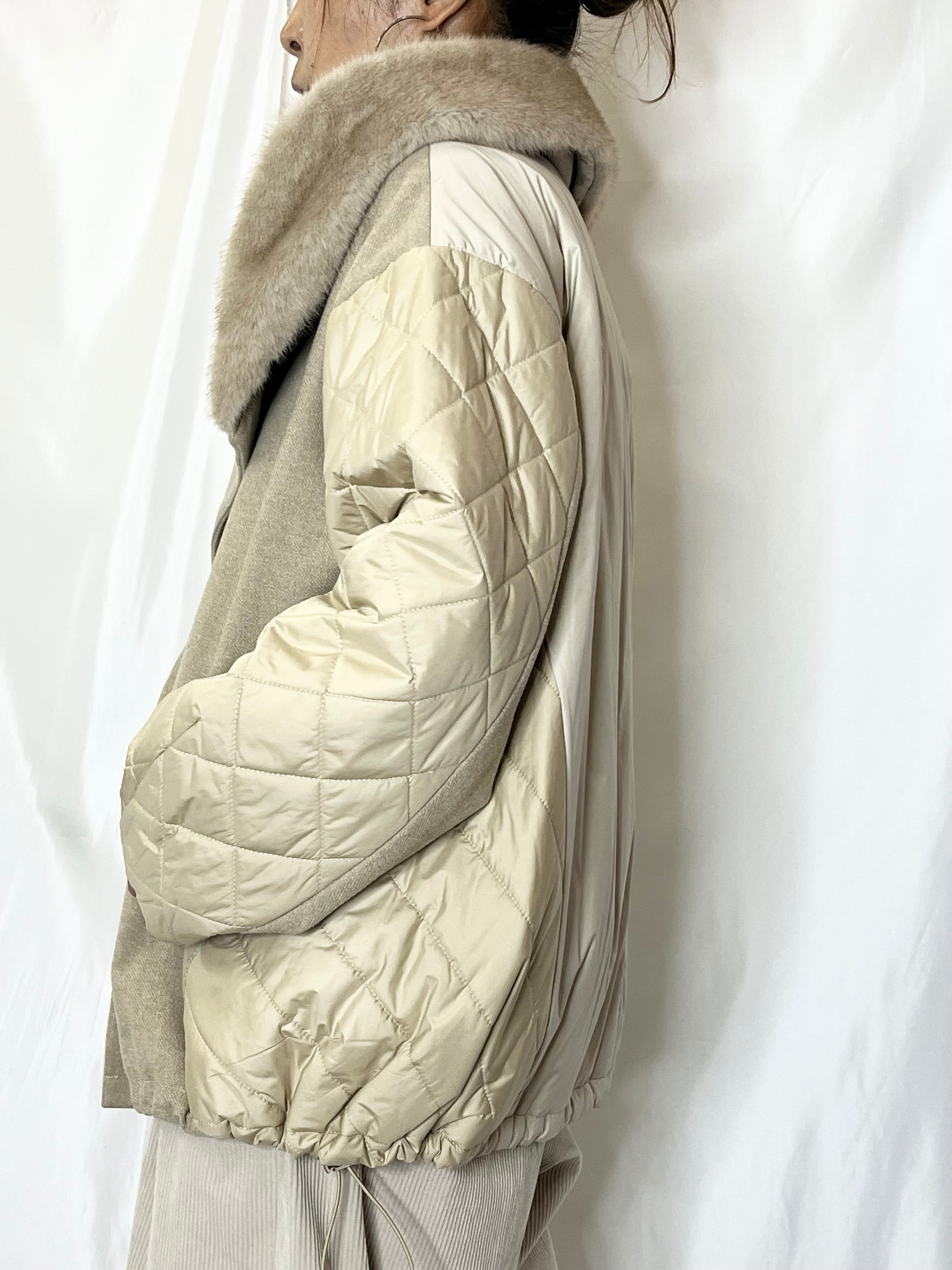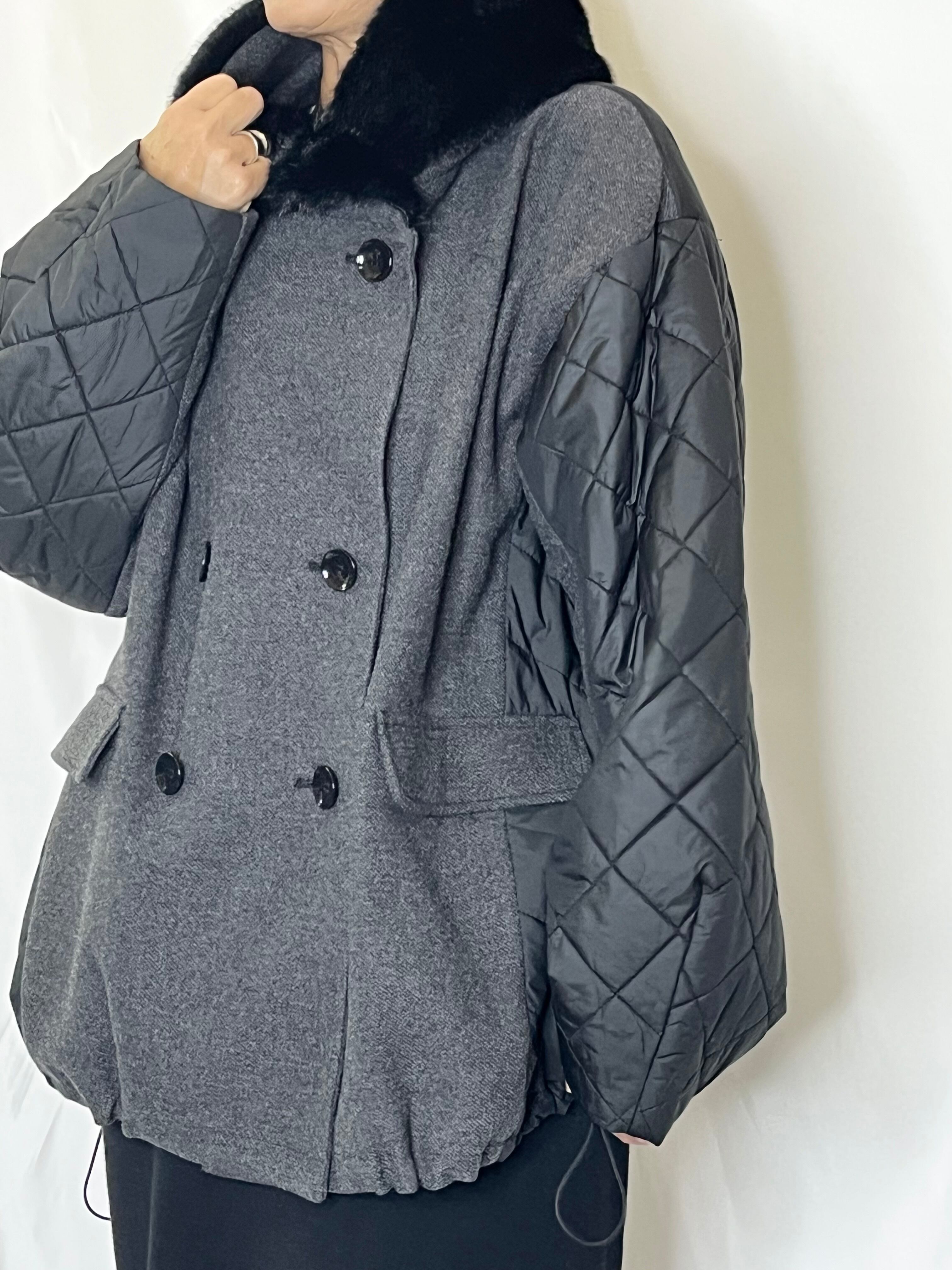 ウールライクな温かみのある素材にナイロン中綿の異素材で仕上げた軽量アウター。