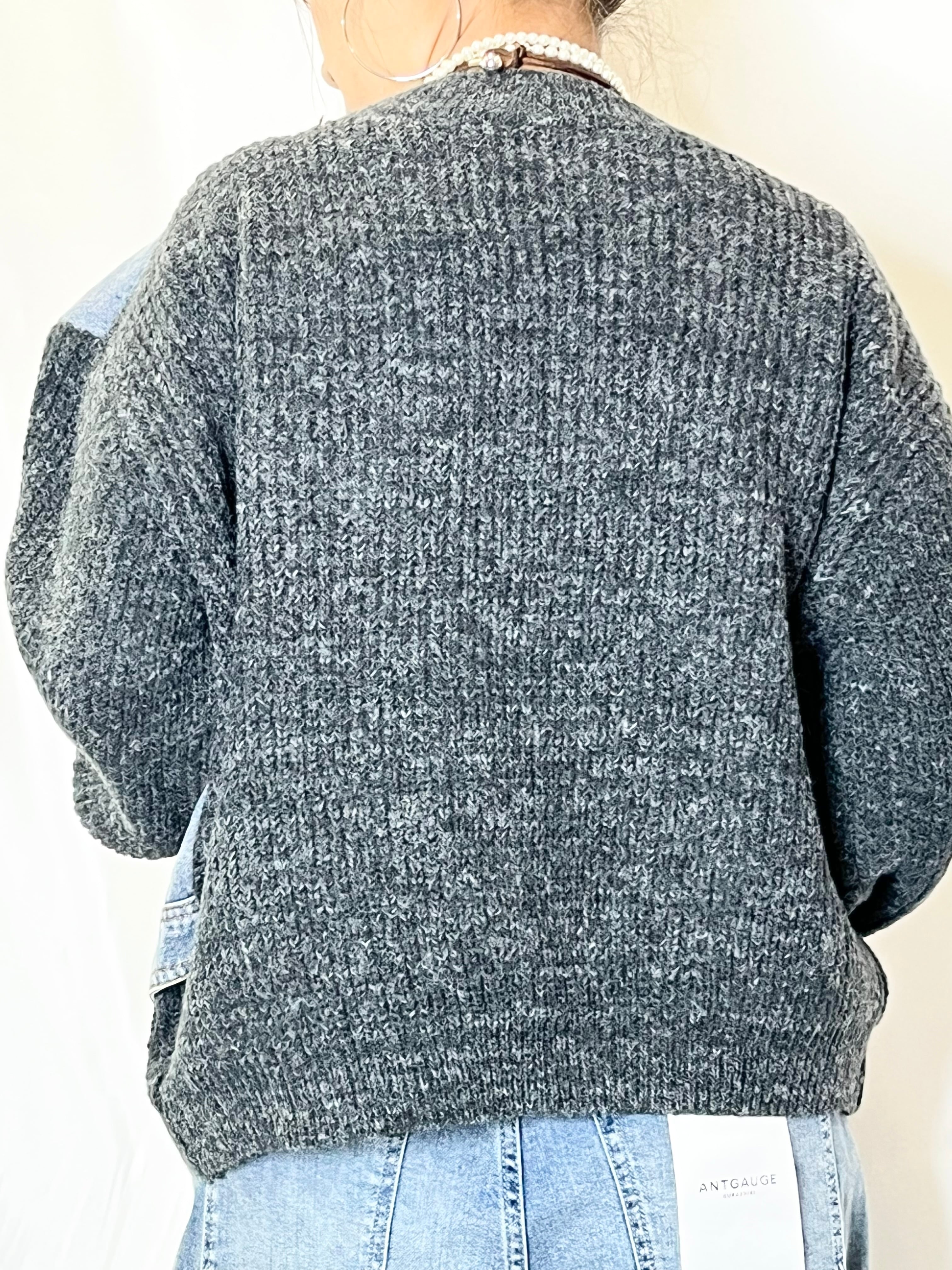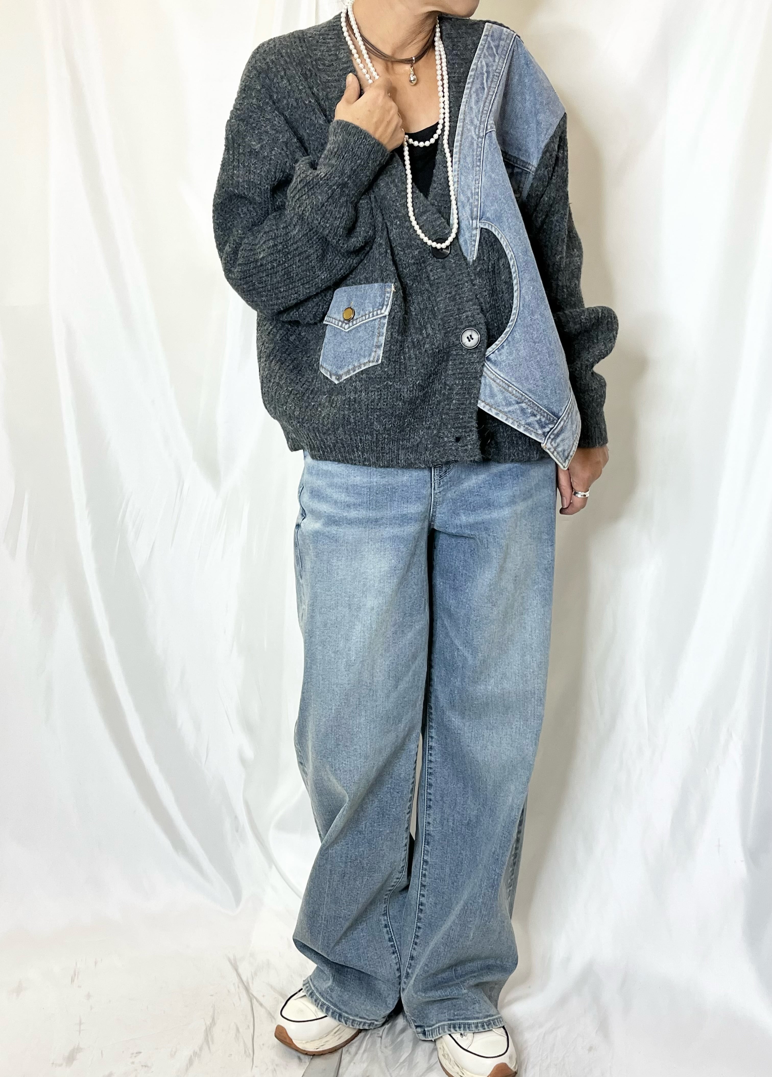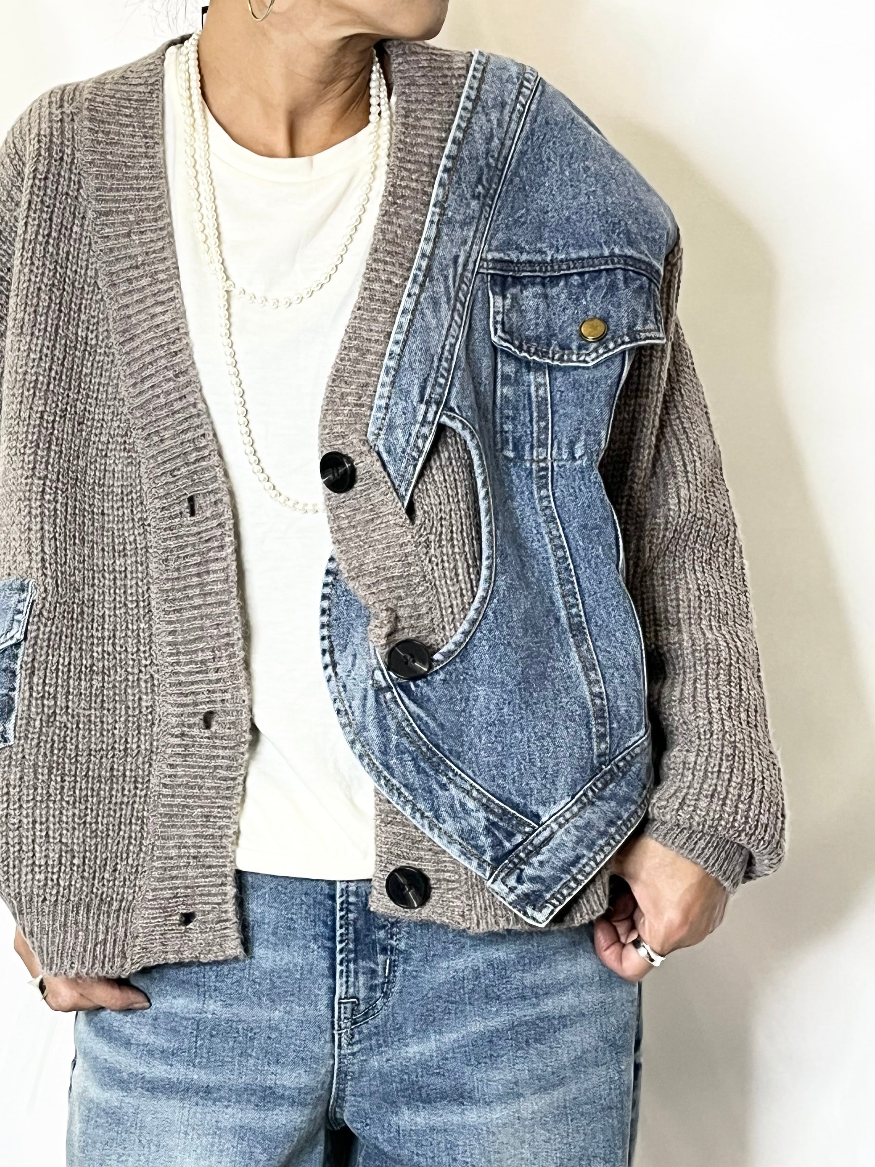 ざっくりニットとデニムがドッキングしたコンパクトなサイズ感のニットカーデ。