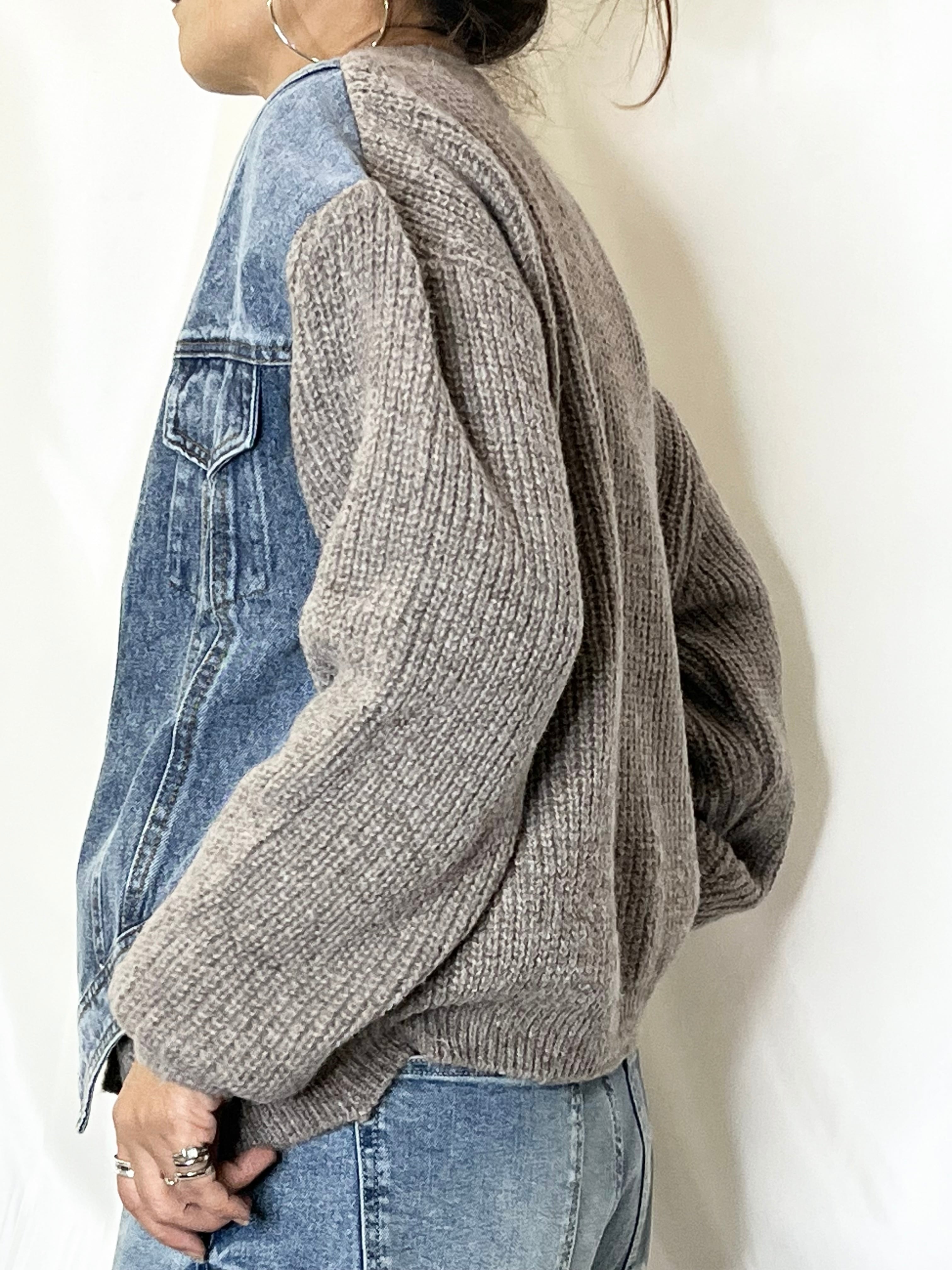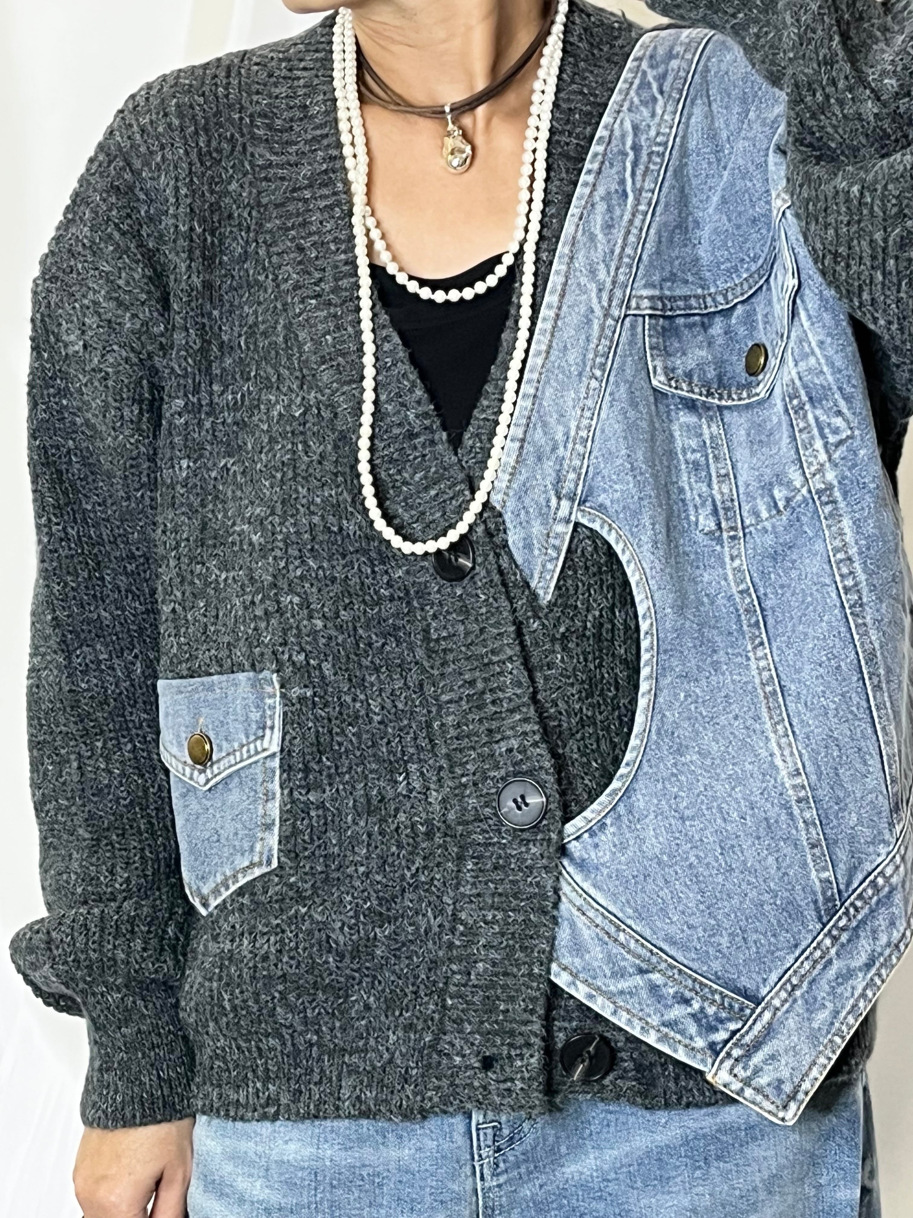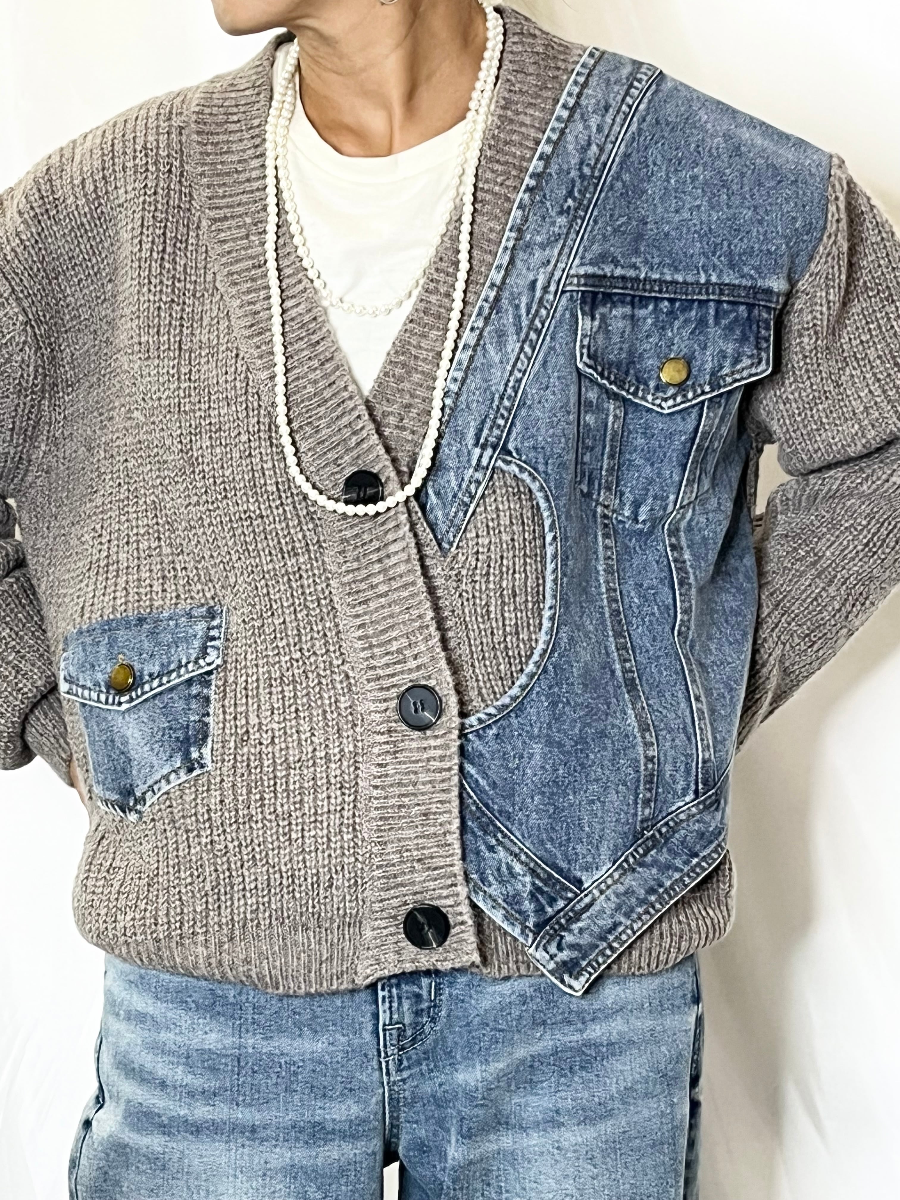 ざっくりニットとデニムがドッキングしたコンパクトなサイズ感のニットカーデ。