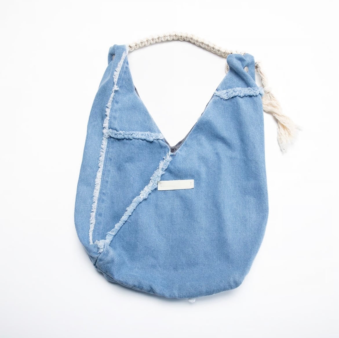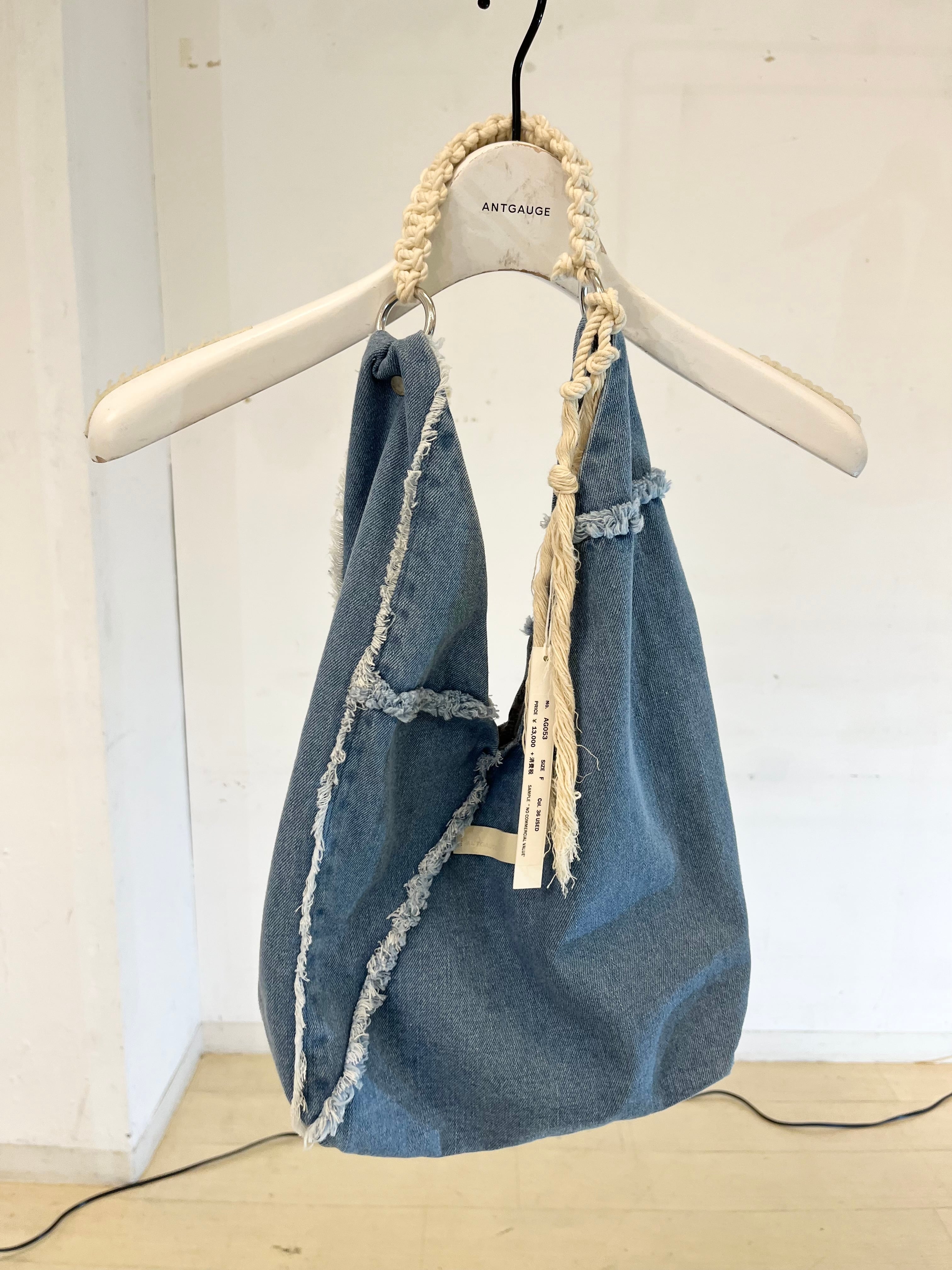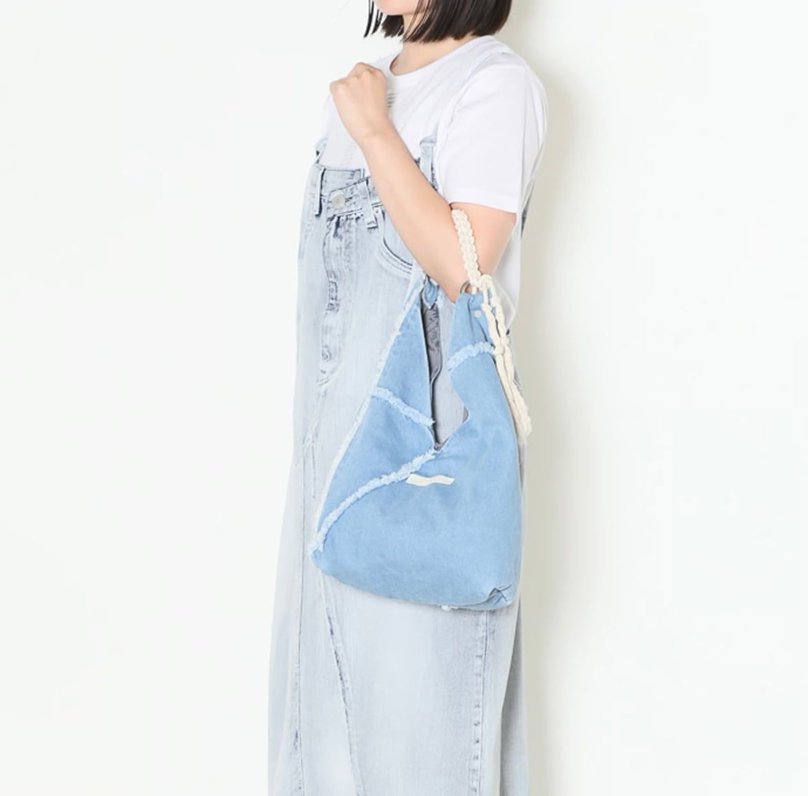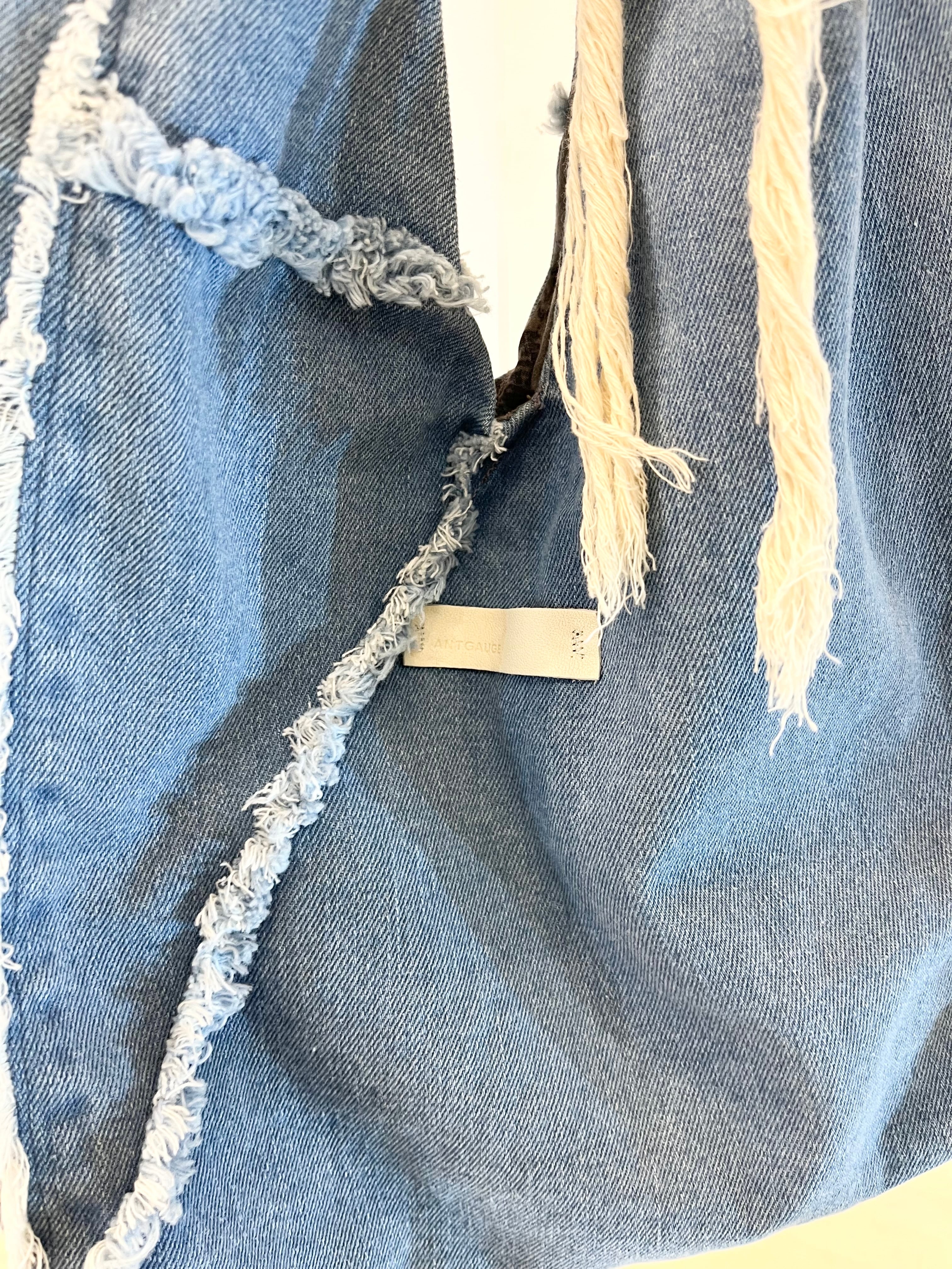 フリンジのある断ち切りデニムのパッチワークで、ハンドメイドの雰囲気を忠実に再現。