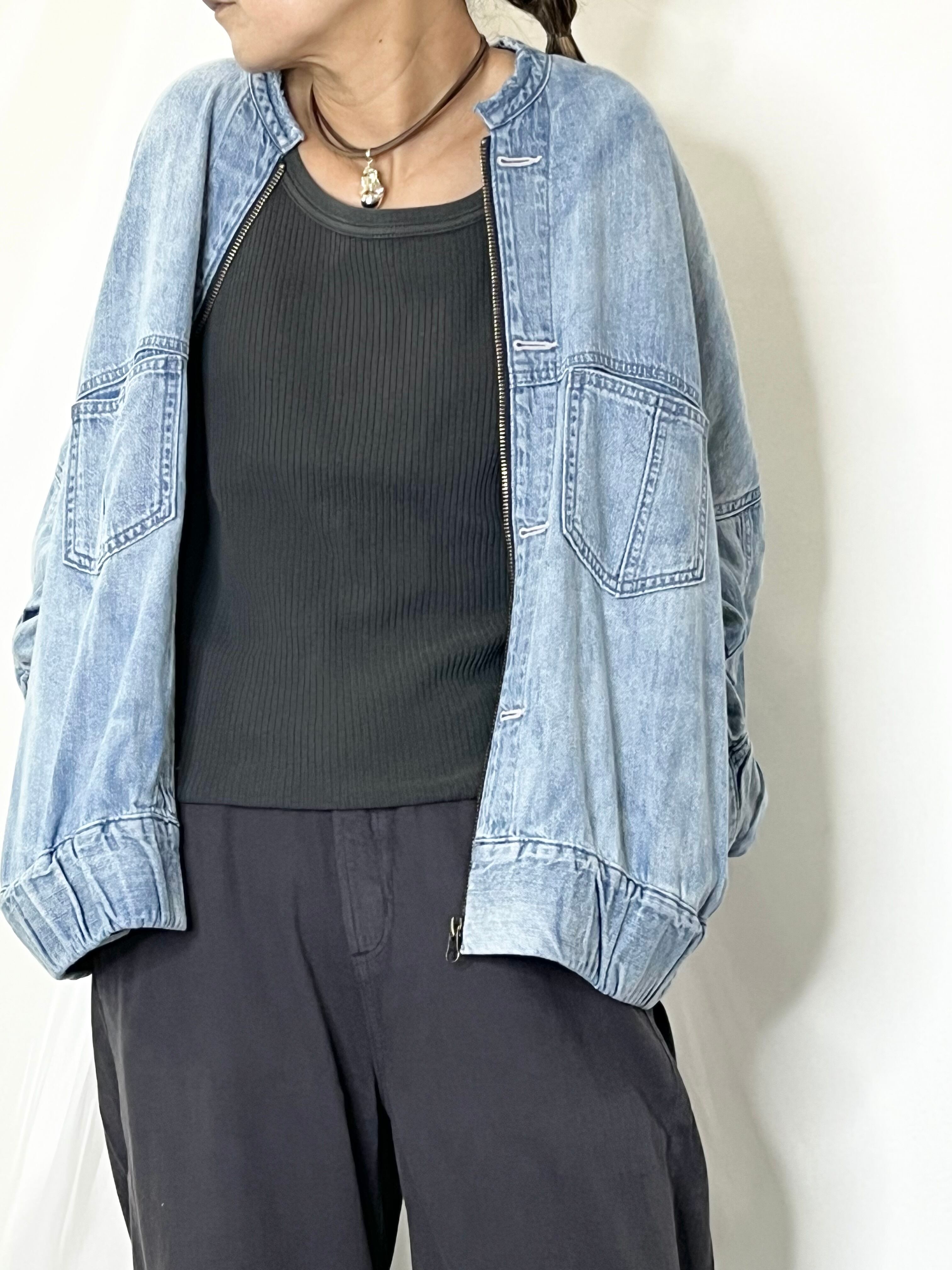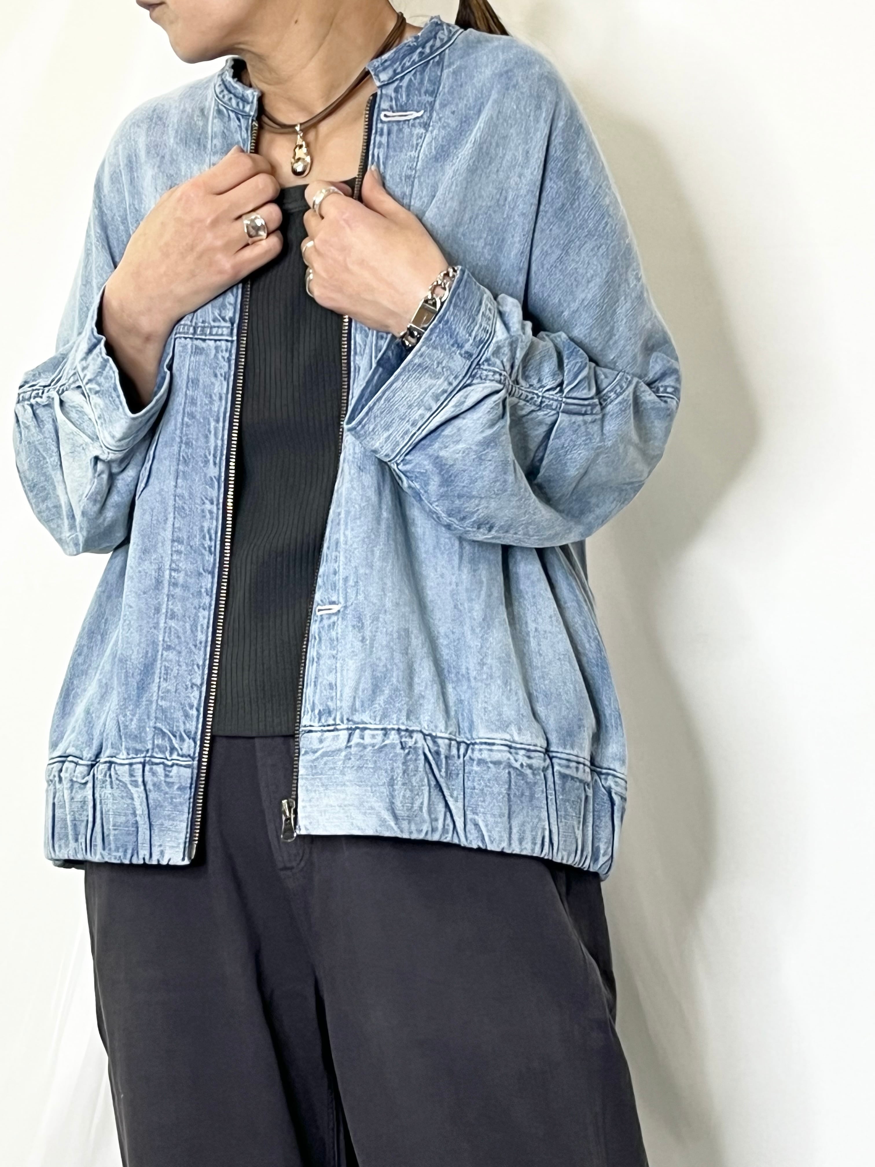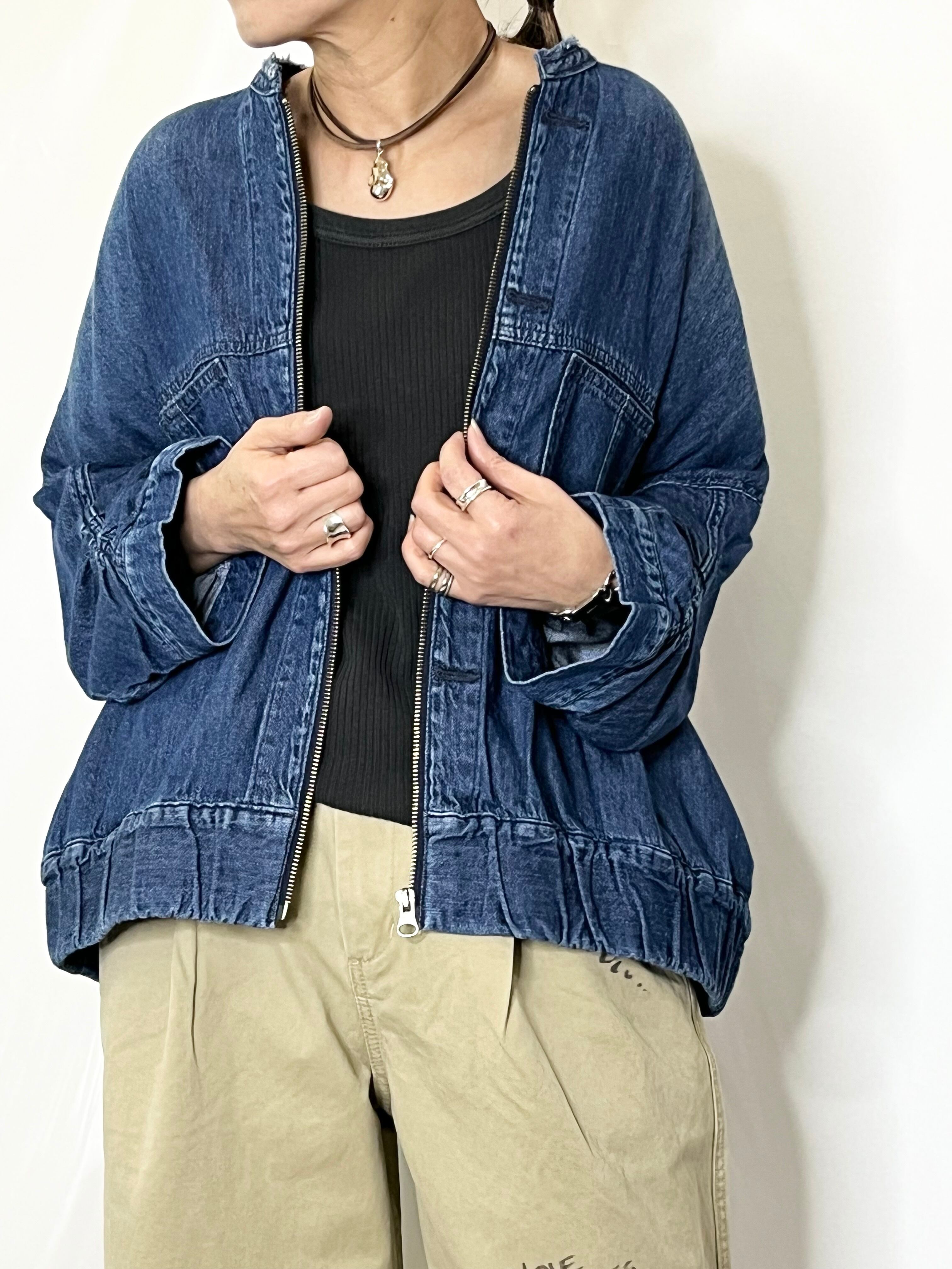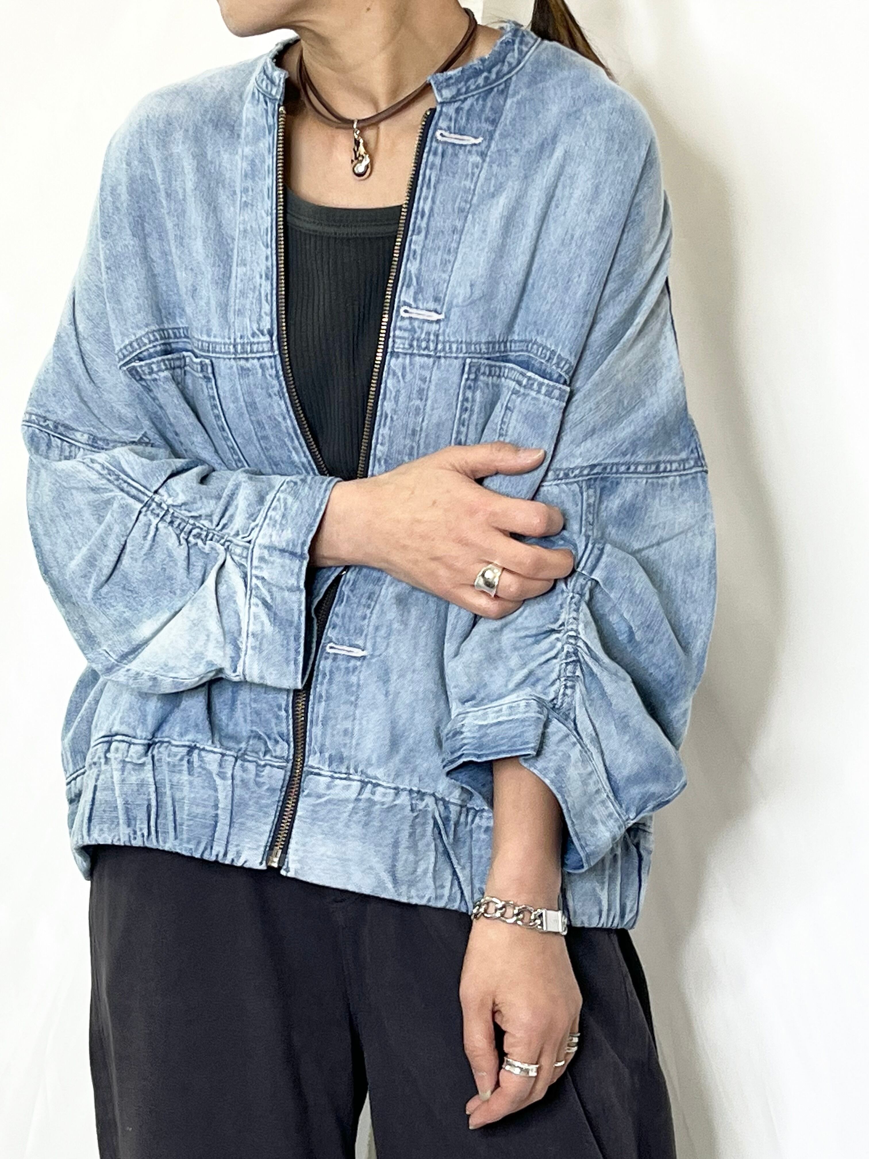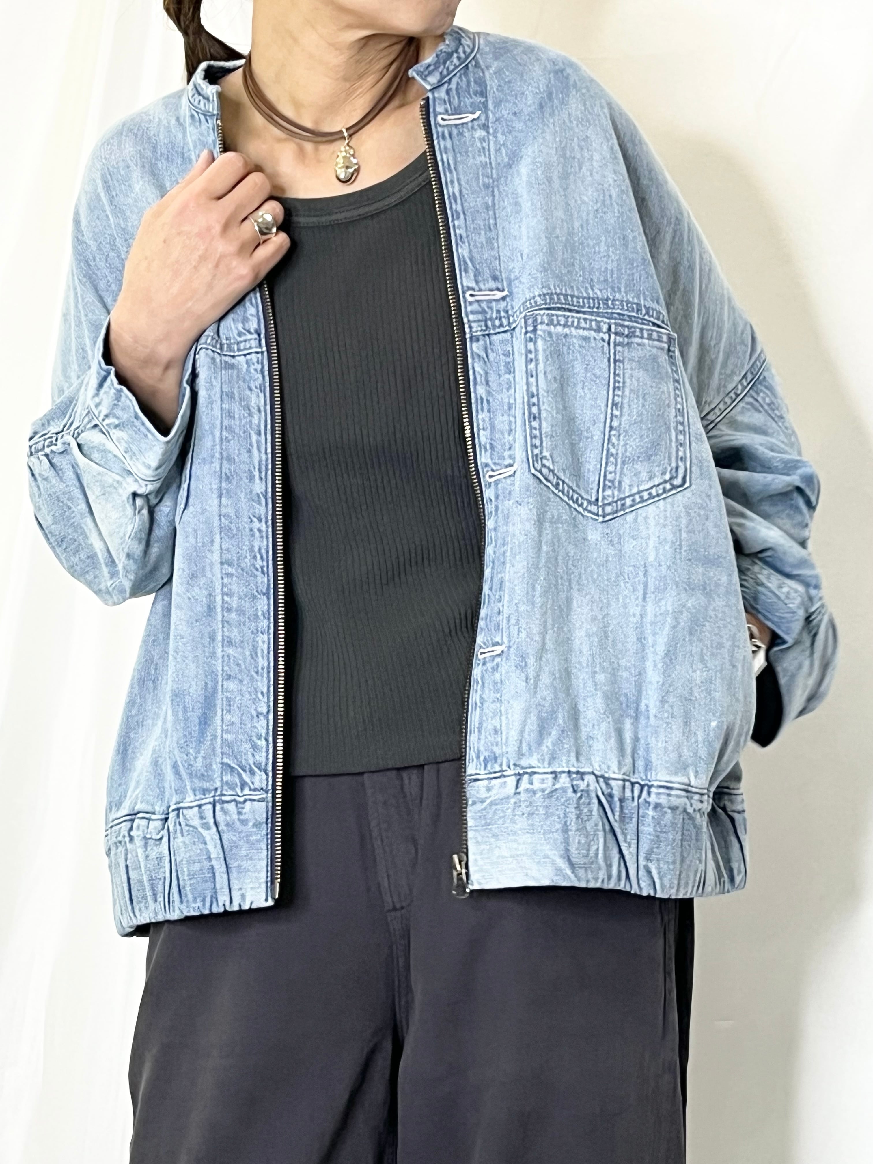 軽く柔らかな風合いはそのままに、重ね着のしやすいノーカラーデザインとジップ仕様で程よくエッジを効かせました。