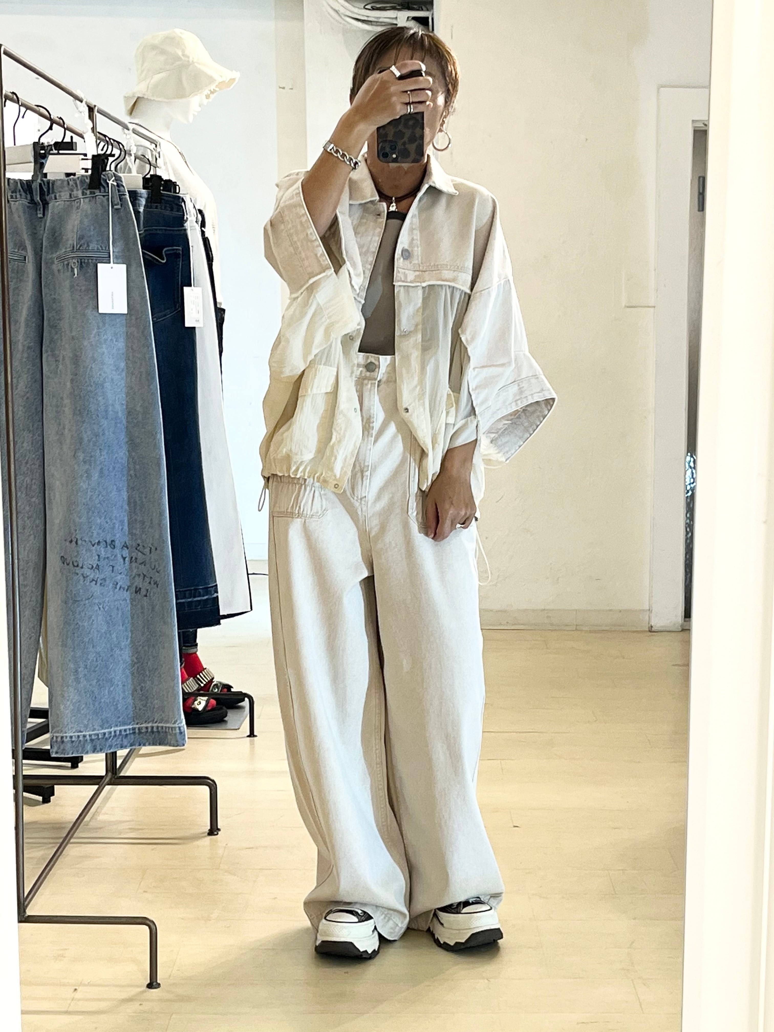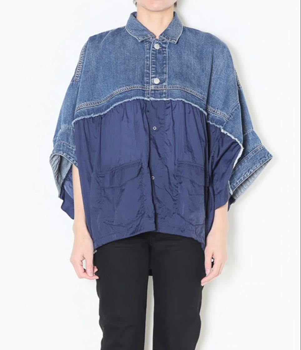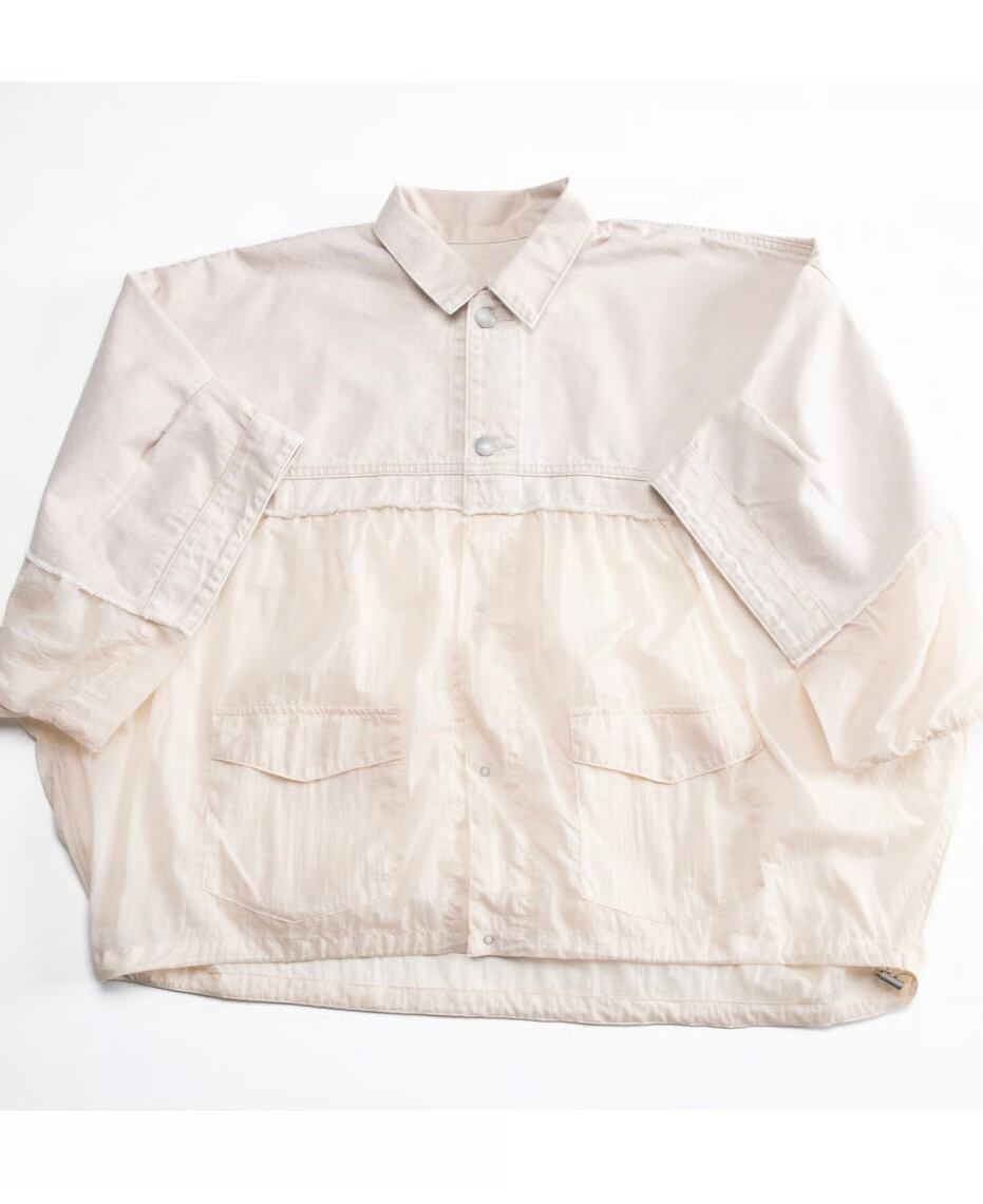 軽いシャリ感のあるデニムと、マットな質感のシアーナイロンをドッキングした、目を引くリメイクテイストのGジャン。