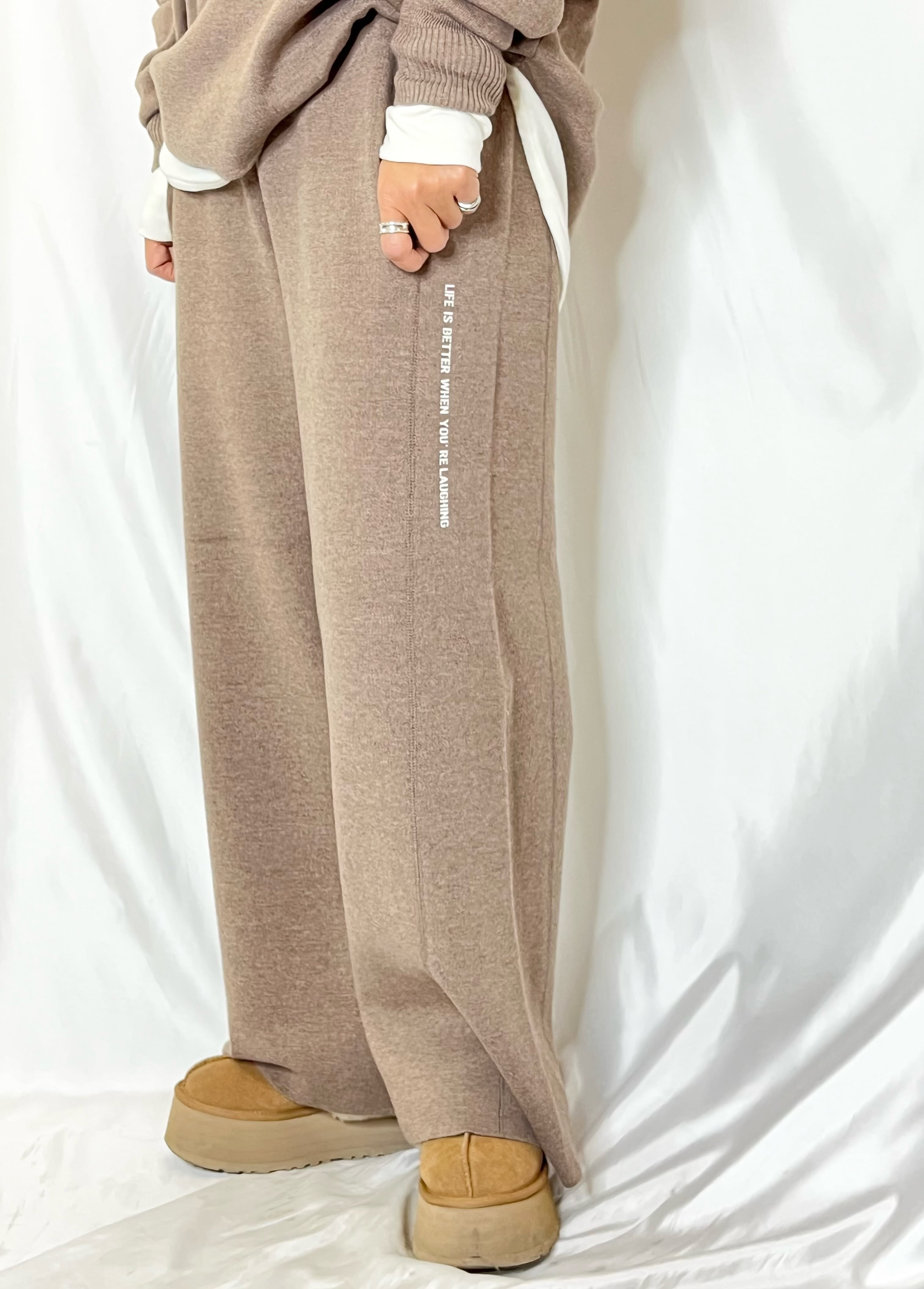 コットン×アクリル素材のふんわり柔らかいニットバレルパンツ。窮屈さもなく、物足りなさもない究極の履き心地になっています。サイドのさりげないロゴがポイントになっています。同素材のVネックニットとセットアップで着ていただけます。