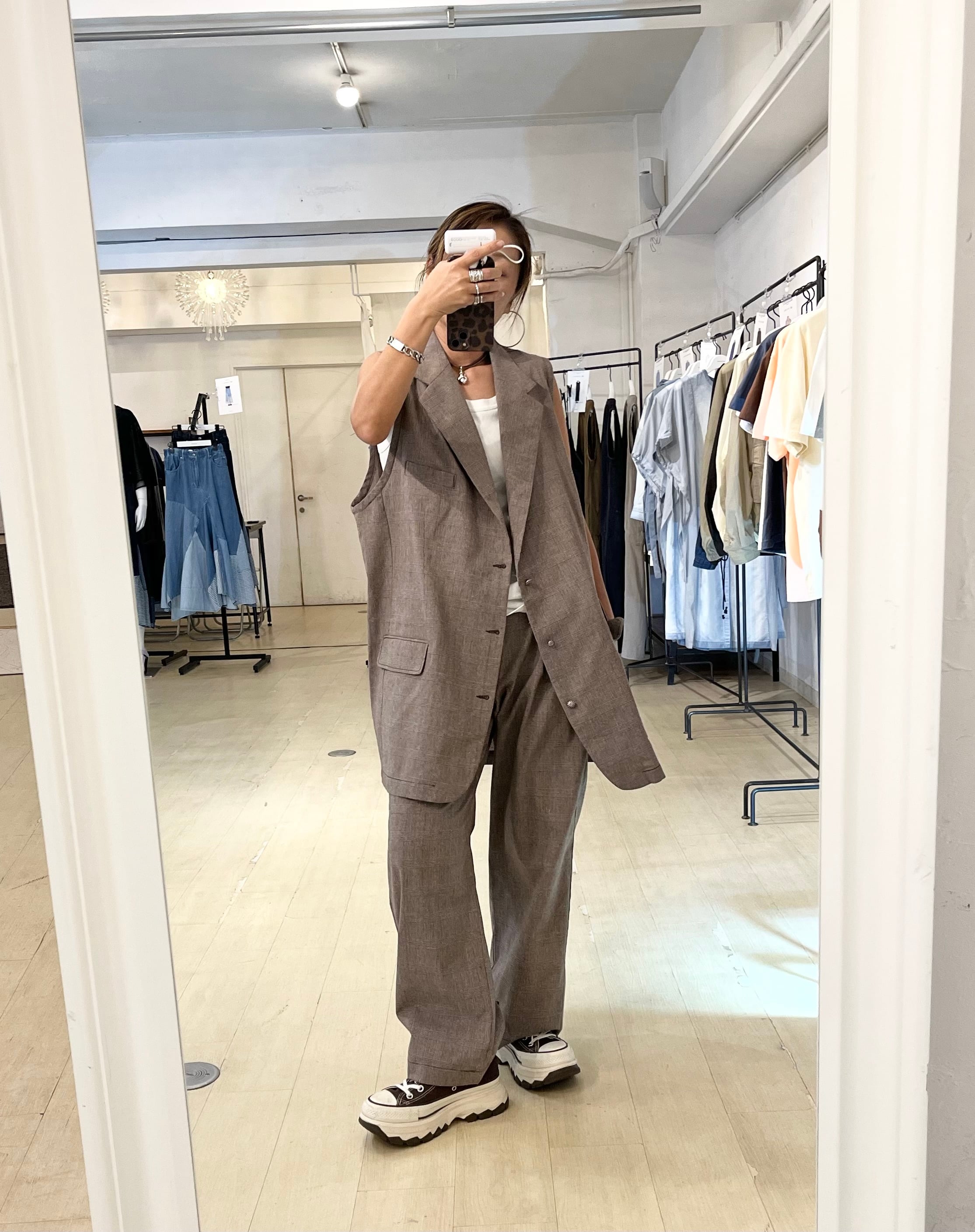 タックによる立体感がありつつ落ちついたラインで大人のスタイリングが楽しめます。