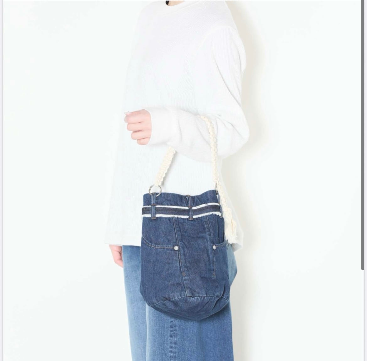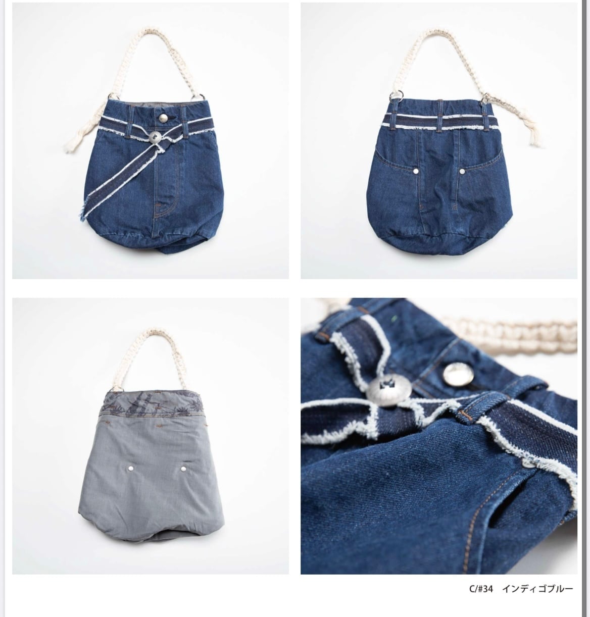 手編みの持ち手、ジーンズの前開きを活かしたデザイン。