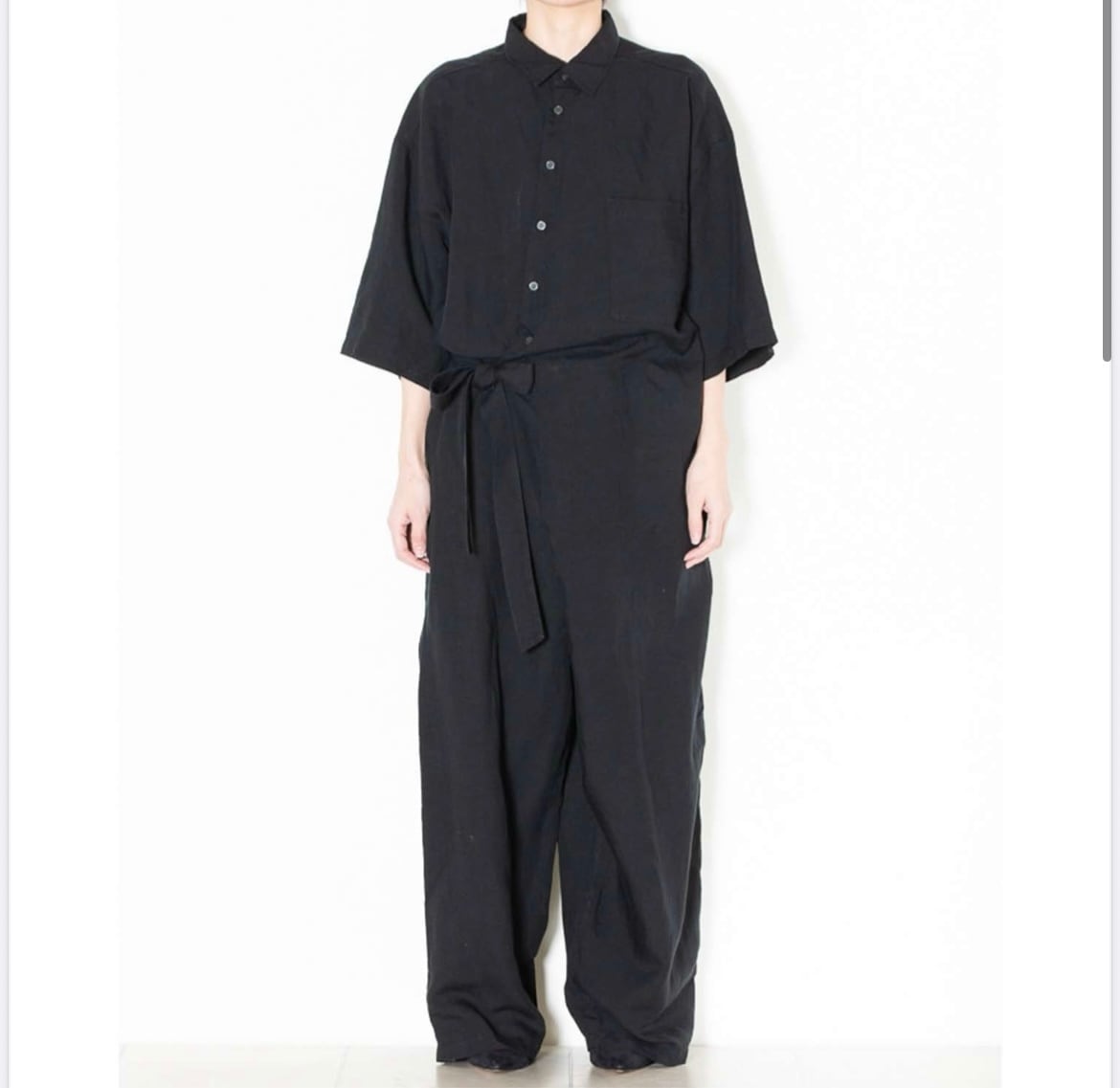 フロントにラップ調を取り入れた、ゆったりシルエットのオールインワン。