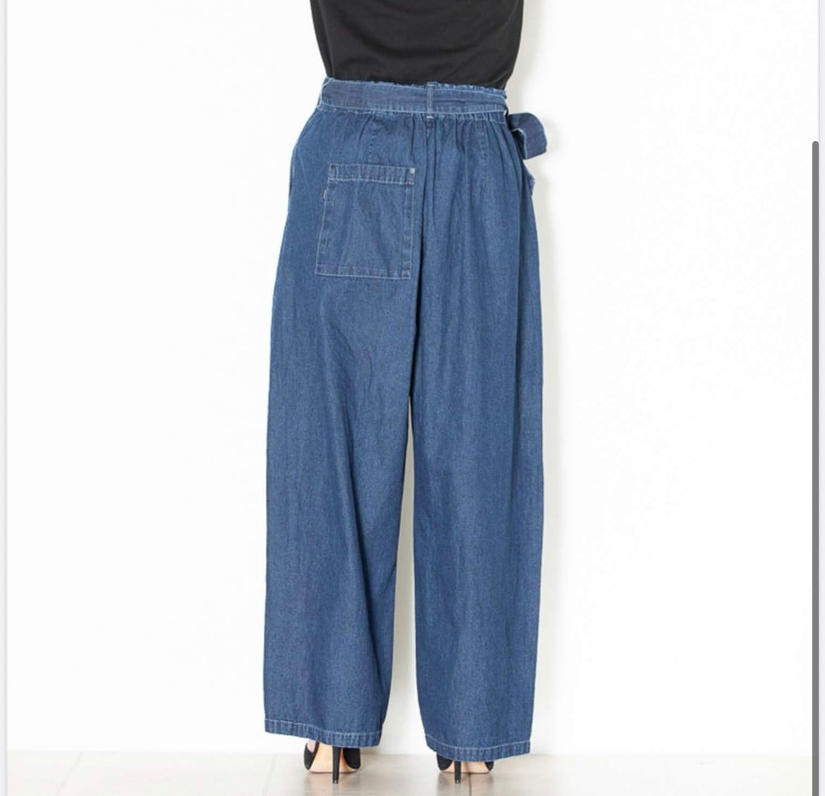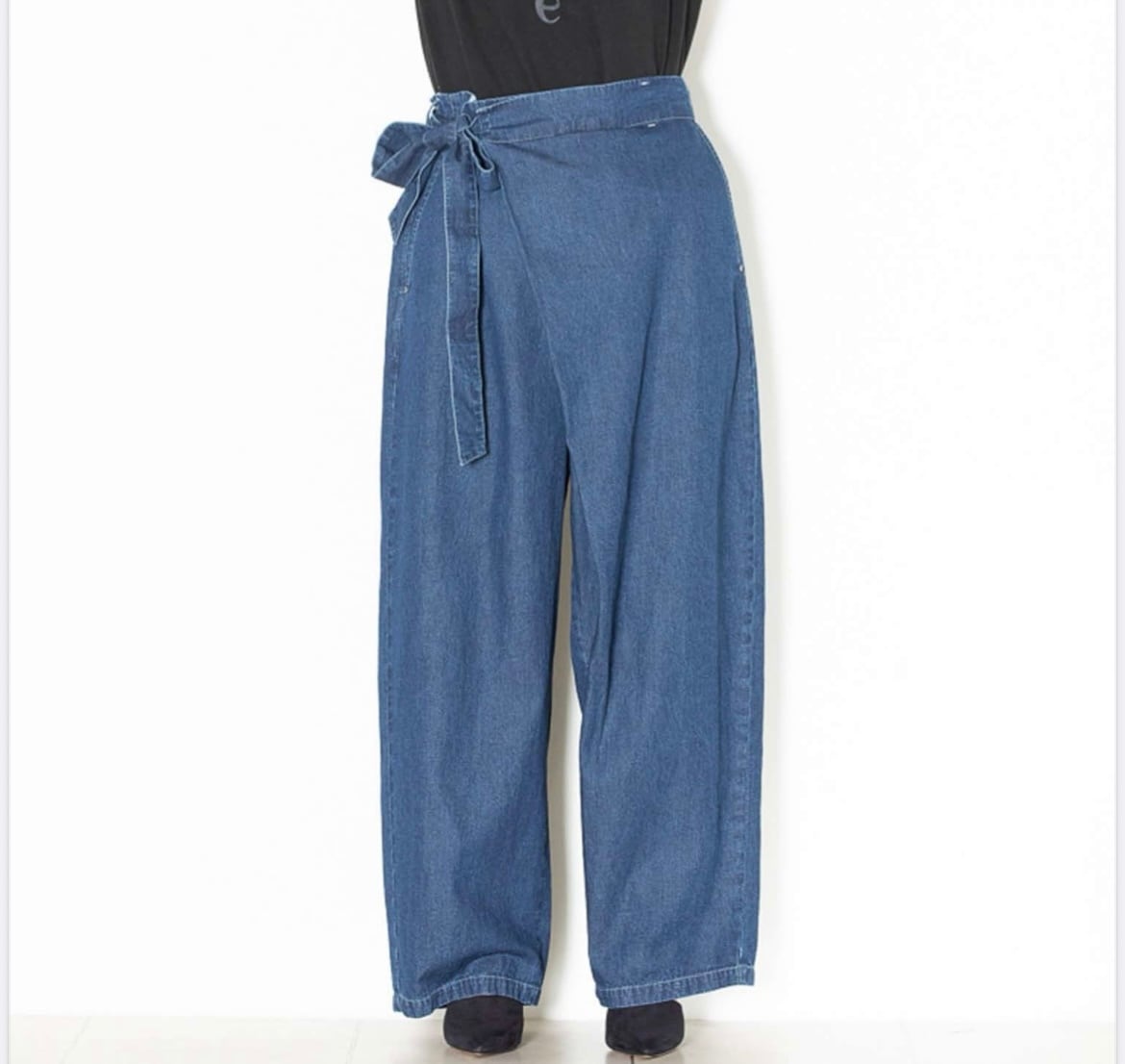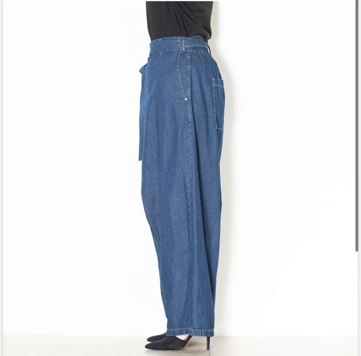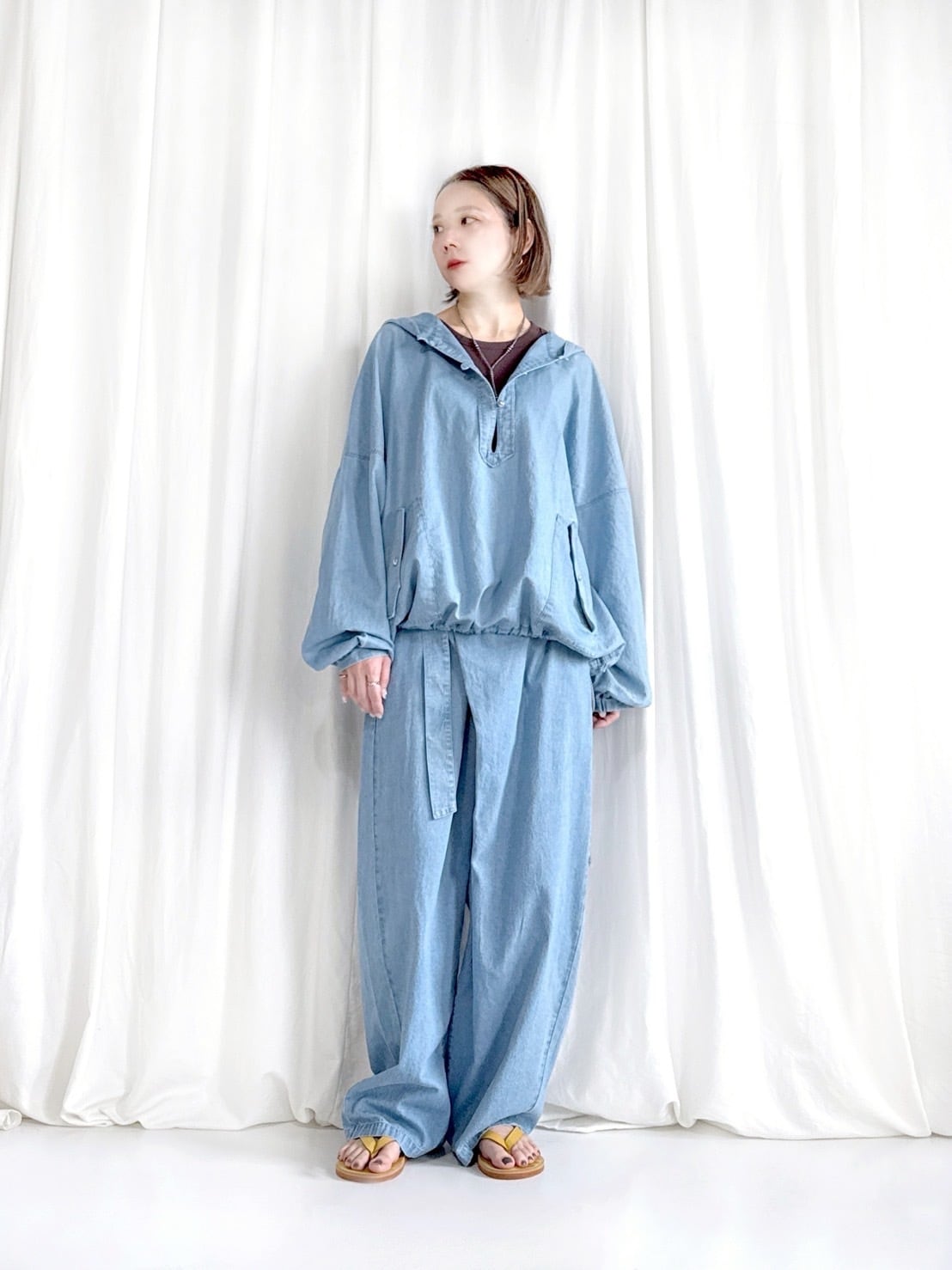 フロントをラップ調に仕上げたデザインが目を引く、かなりゆとりのあるテーパードシルエット。