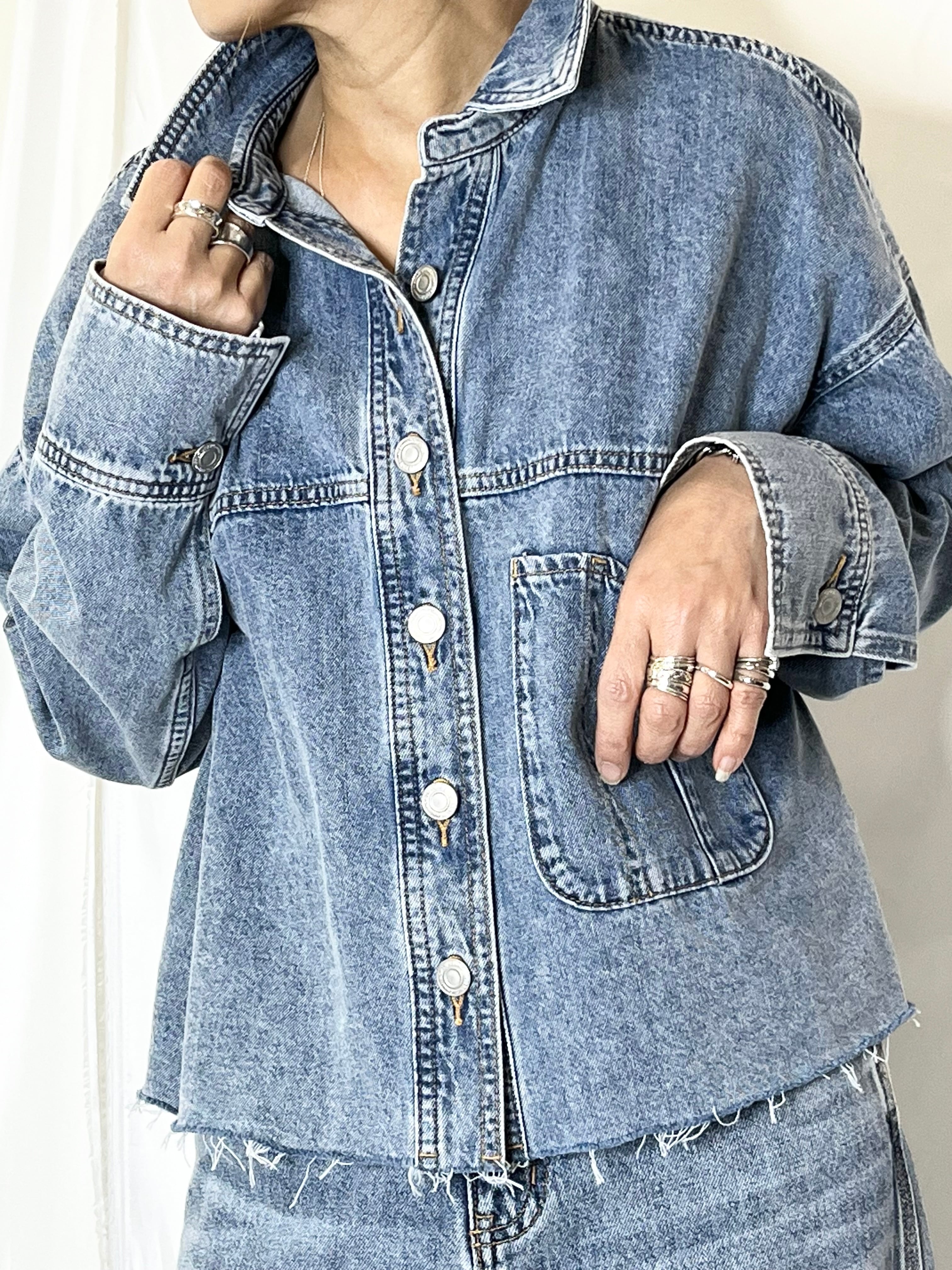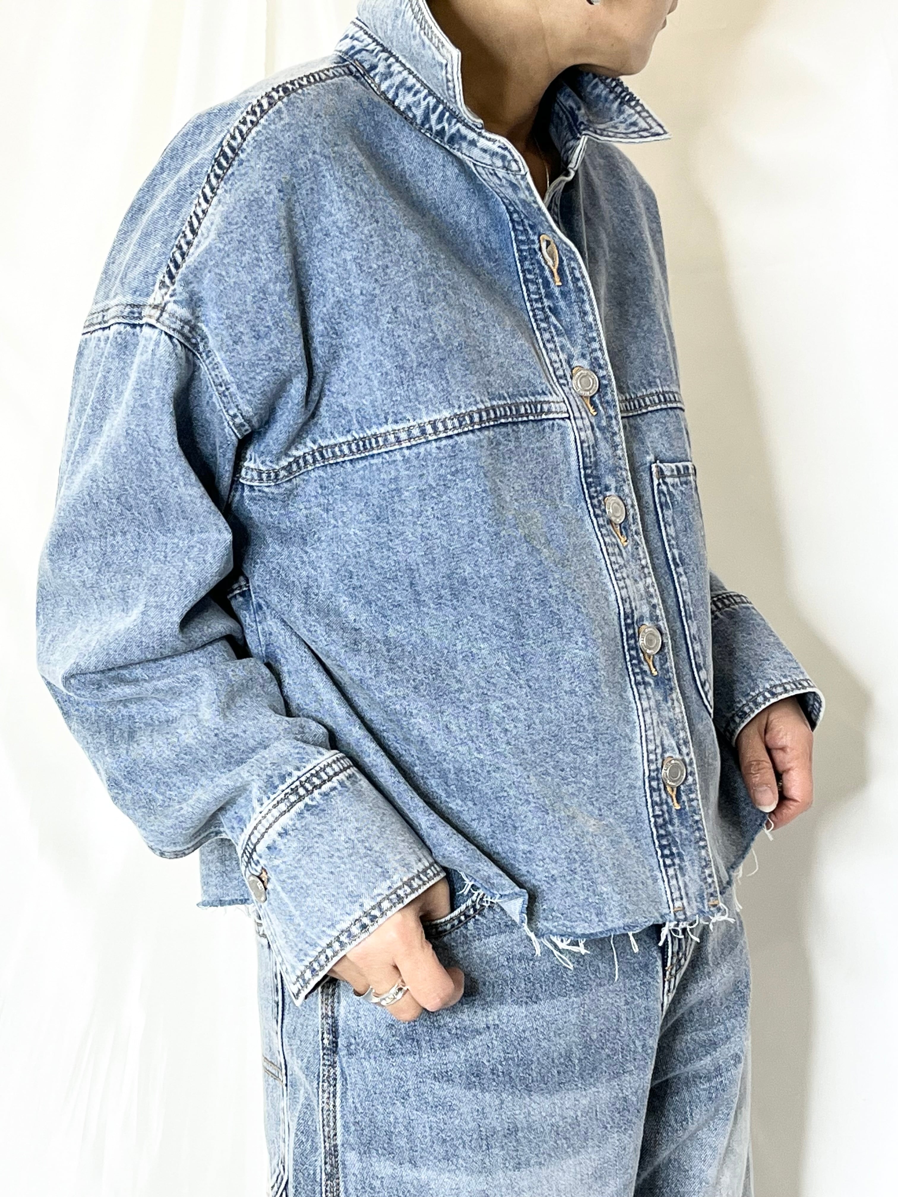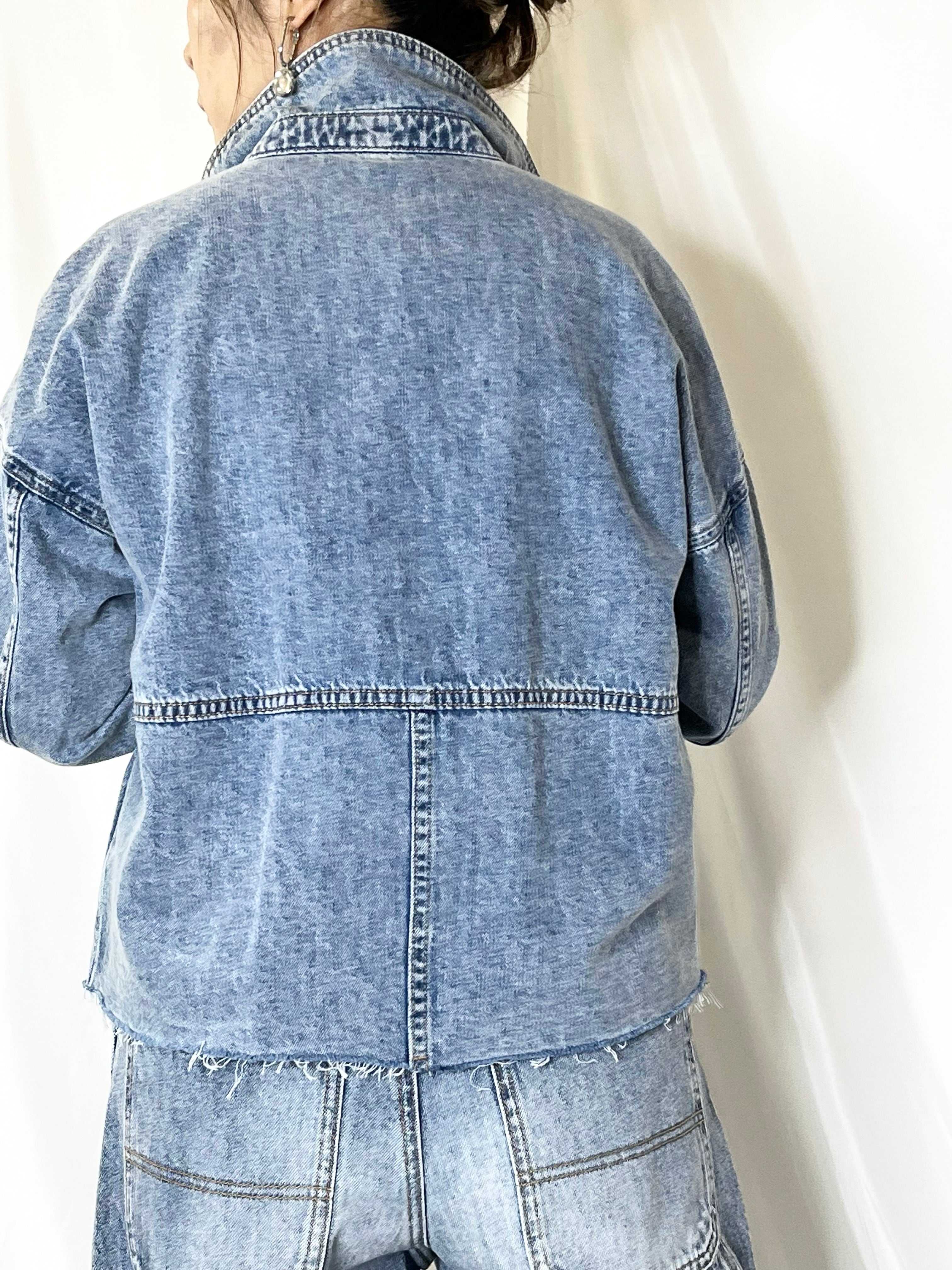 裾の切りっぱなしデザインが新しいデニムシャツジャケット。
