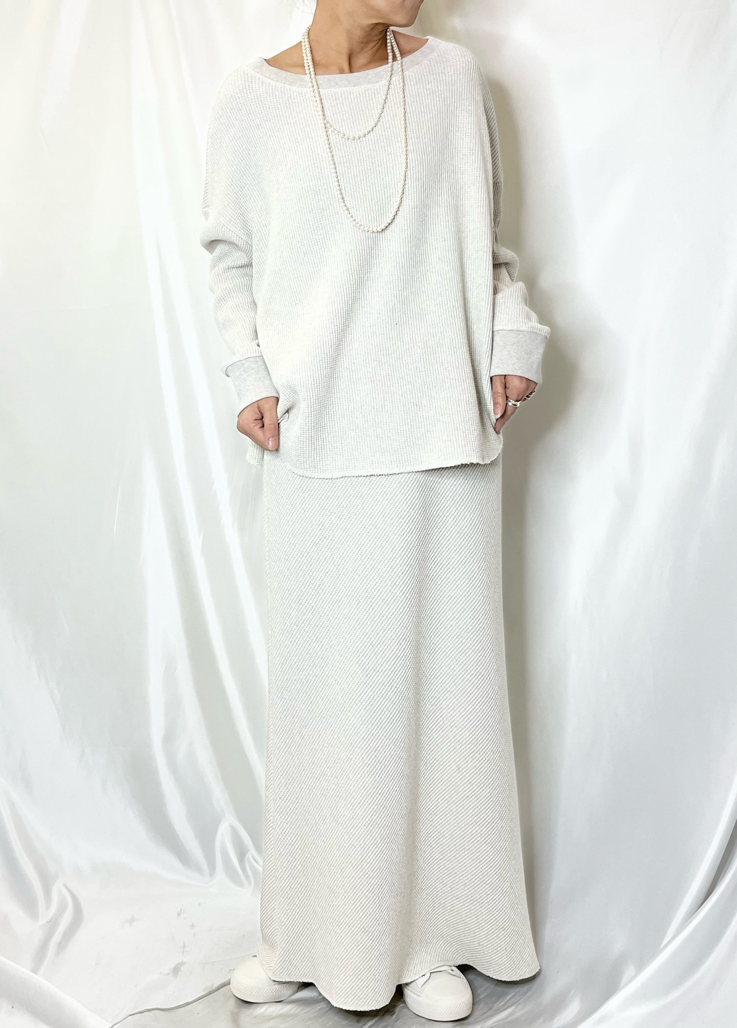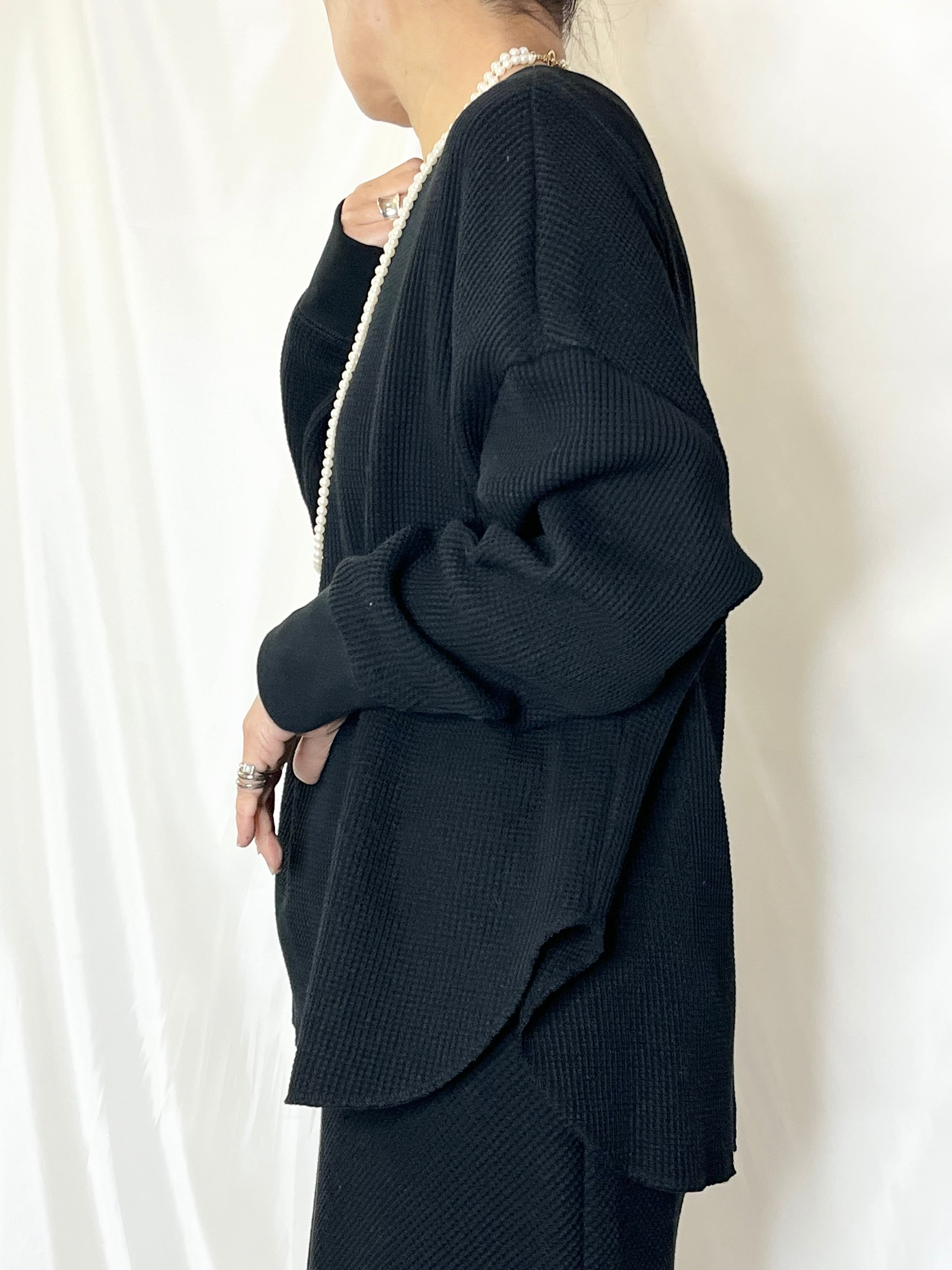 国内生産の上質なワッフル素材を使用し、表情のある質感がシンプルな中にも奥行きをプラス。ゆったりとしたシルエットで、着るだけでこなれた印象に仕上がります。