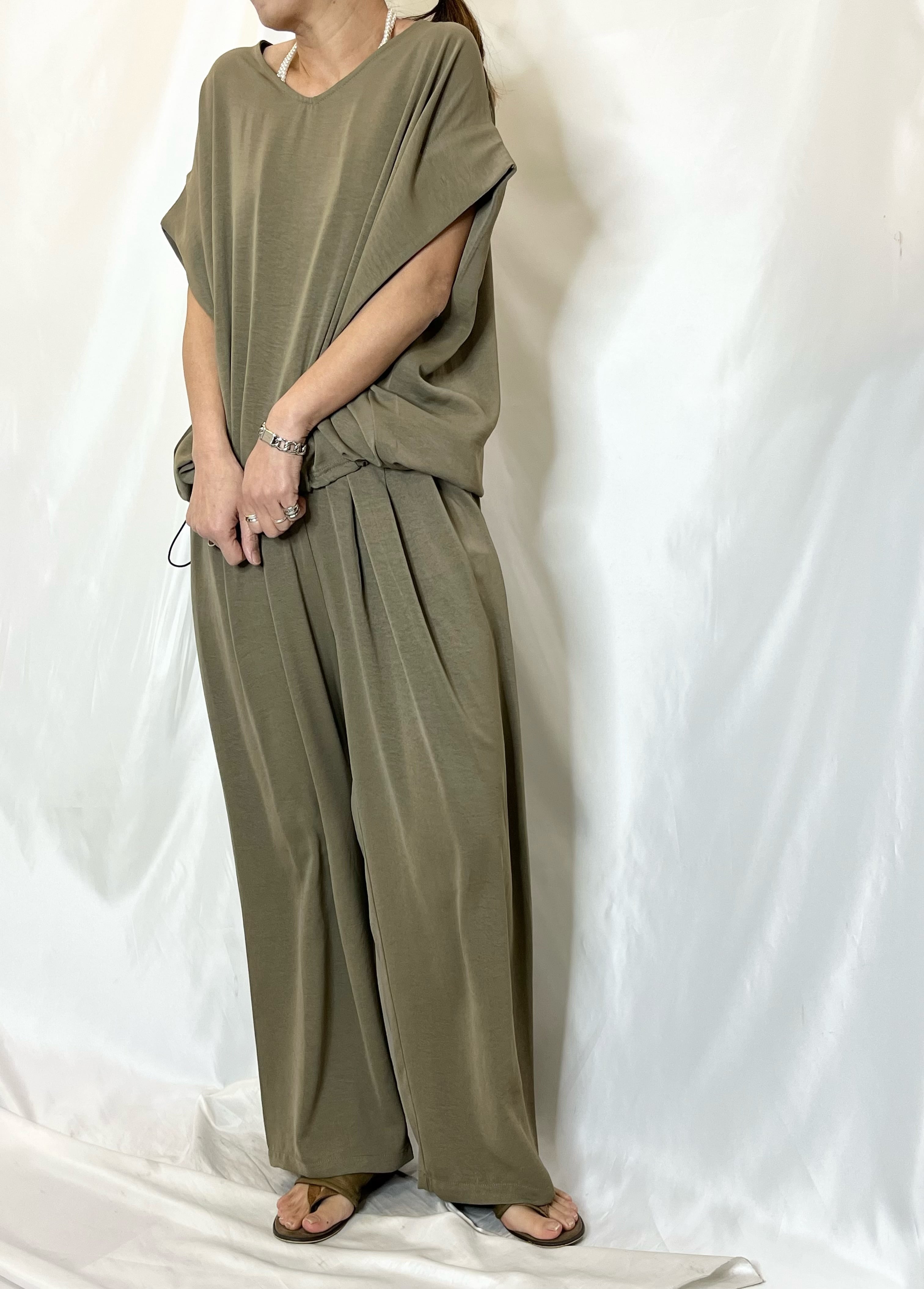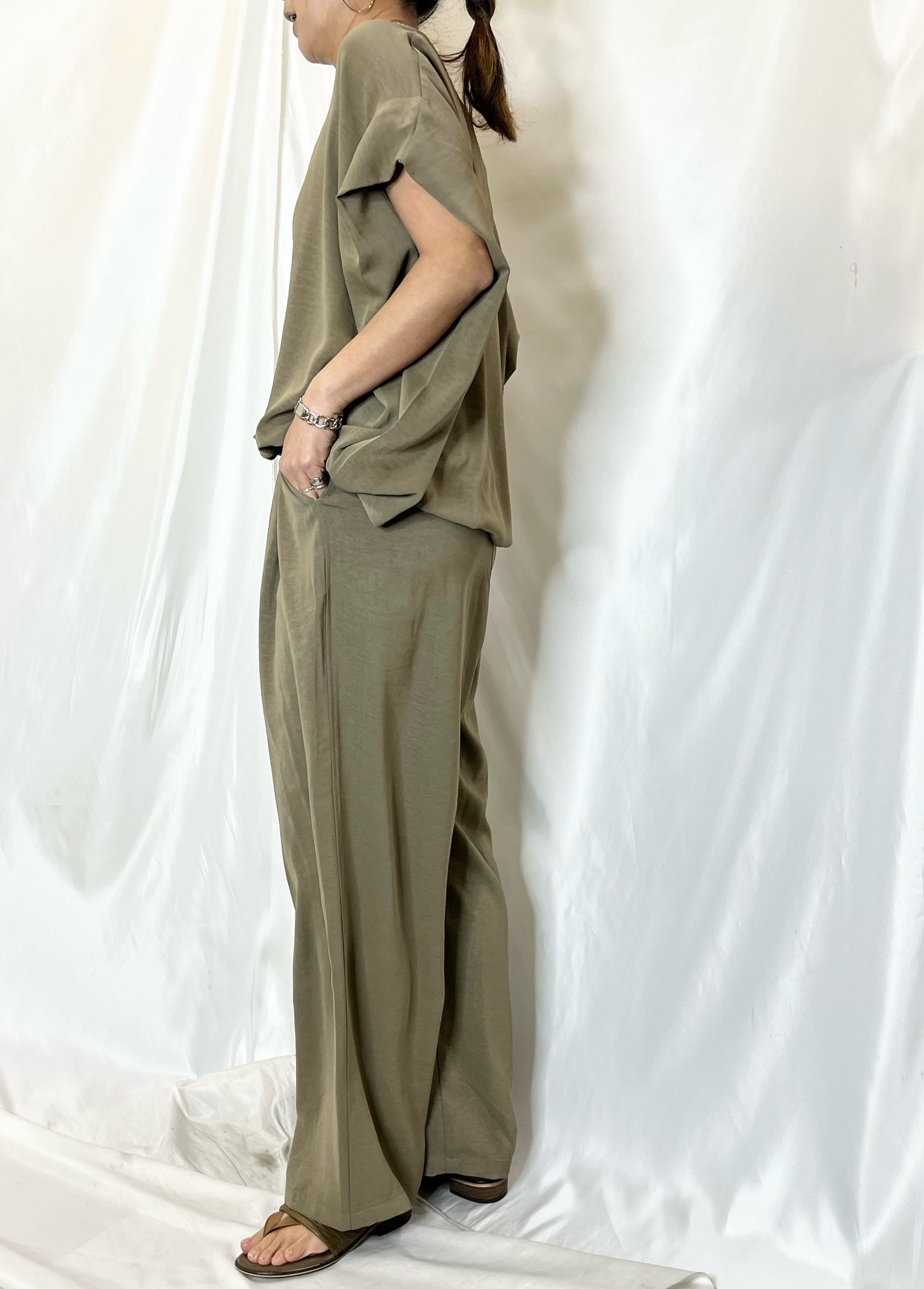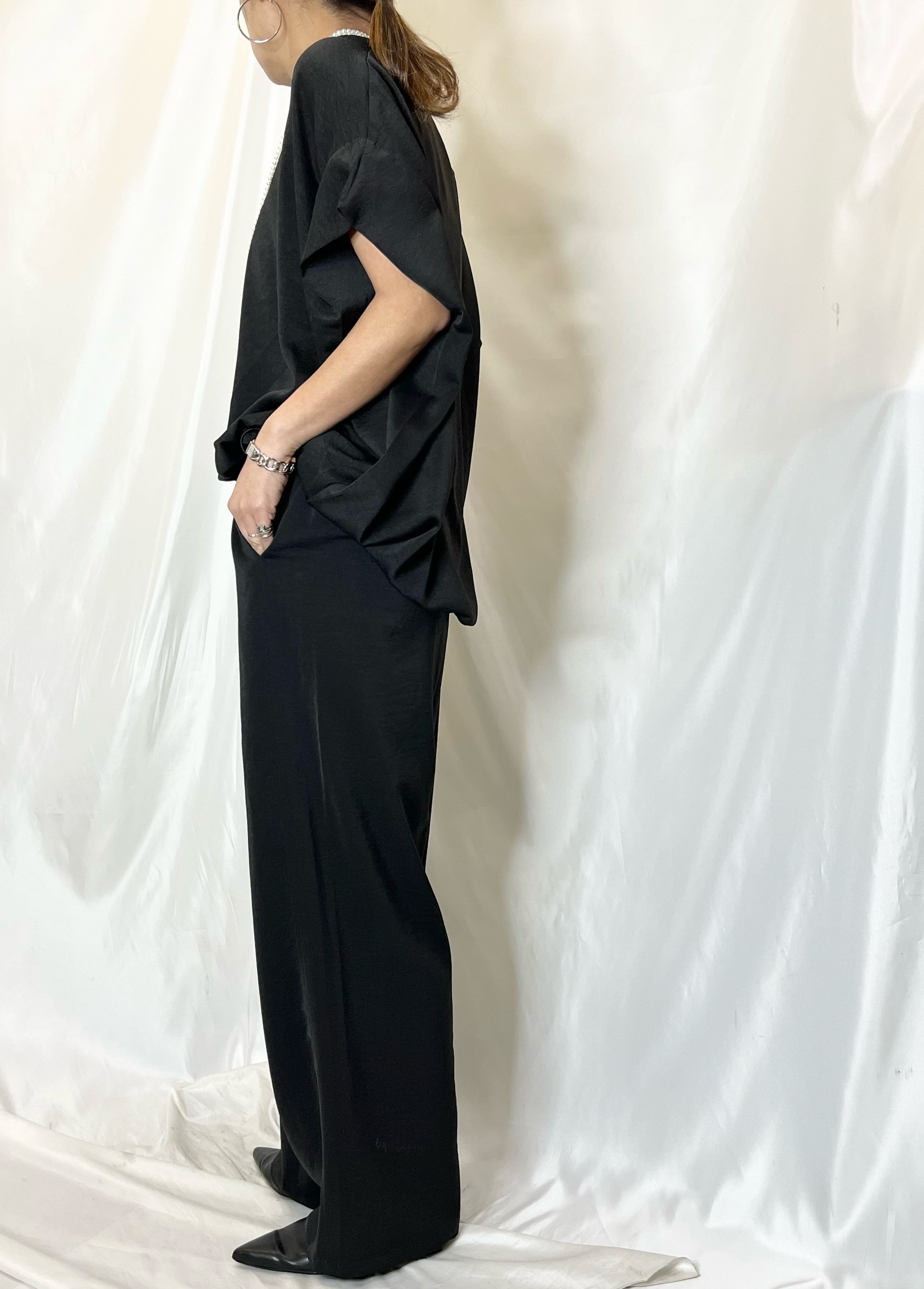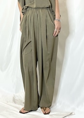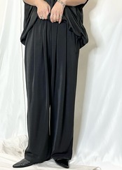 程よくゆとりのあるワイドシルエットですが、落ち感のある素材ですっきりとした美脚効果のあるストレートラインを実現。