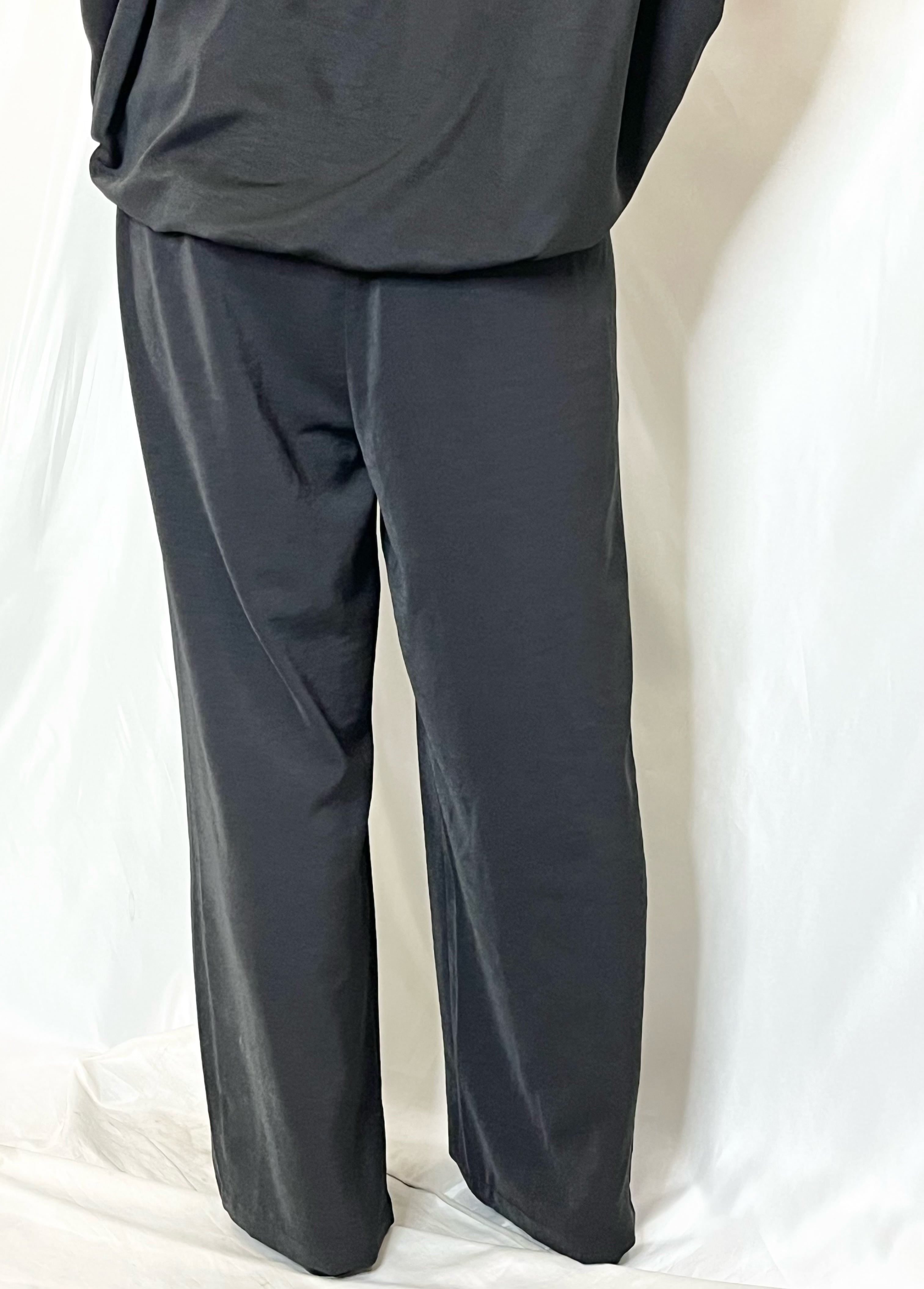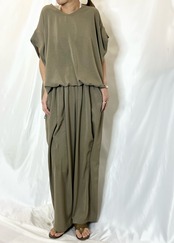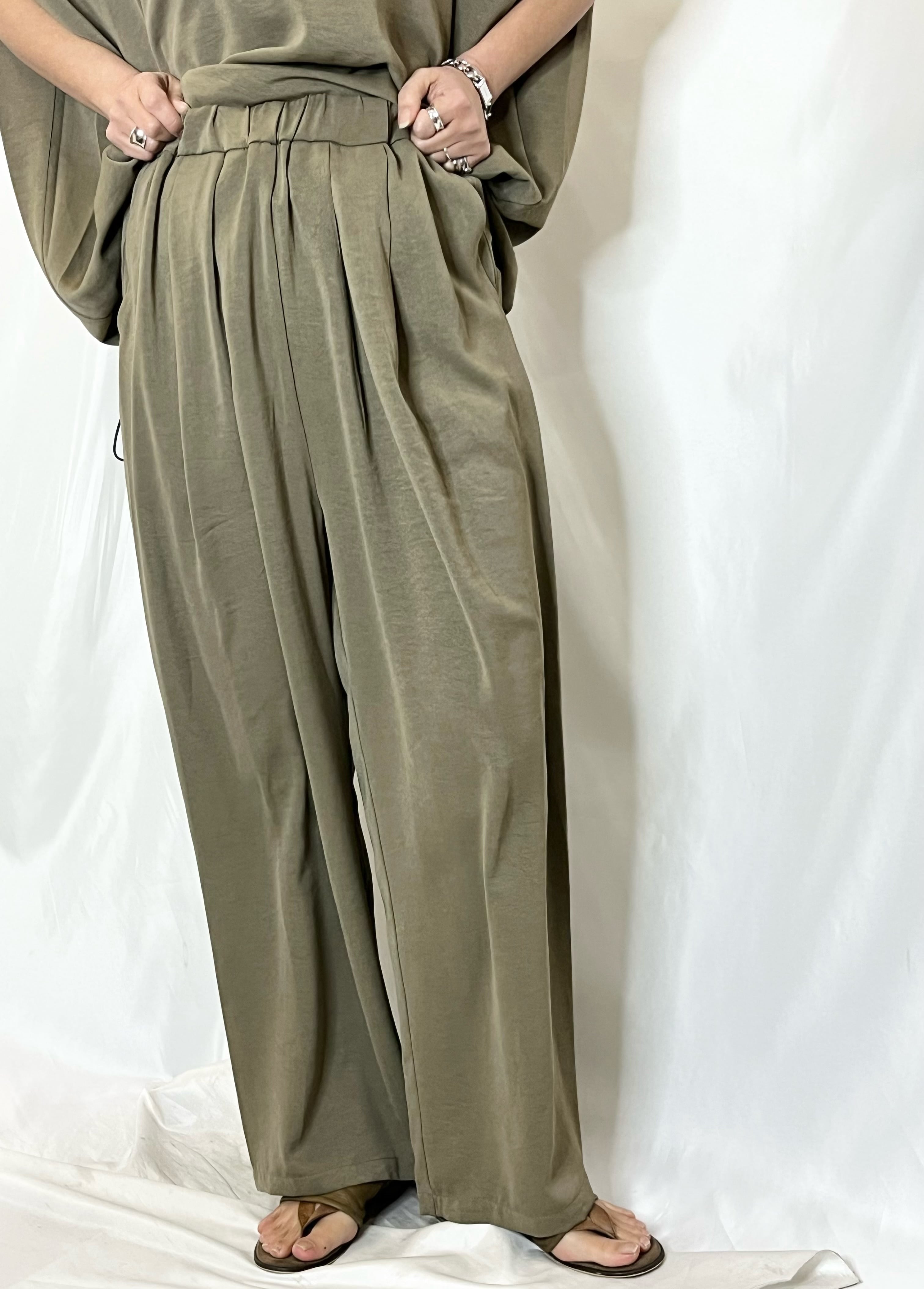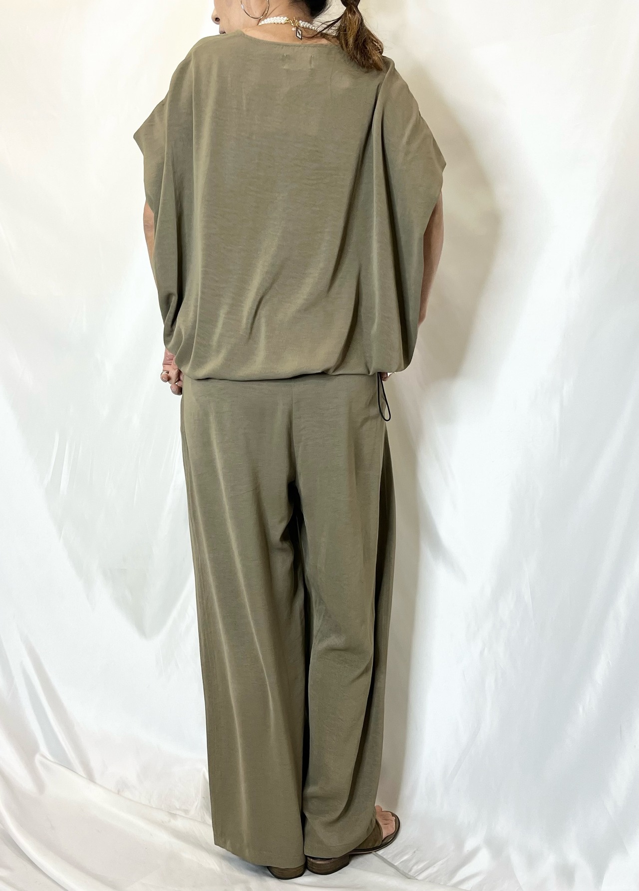 程よくゆとりのあるワイドシルエットですが、落ち感のある素材ですっきりとした美脚効果のあるストレートラインを実現。
