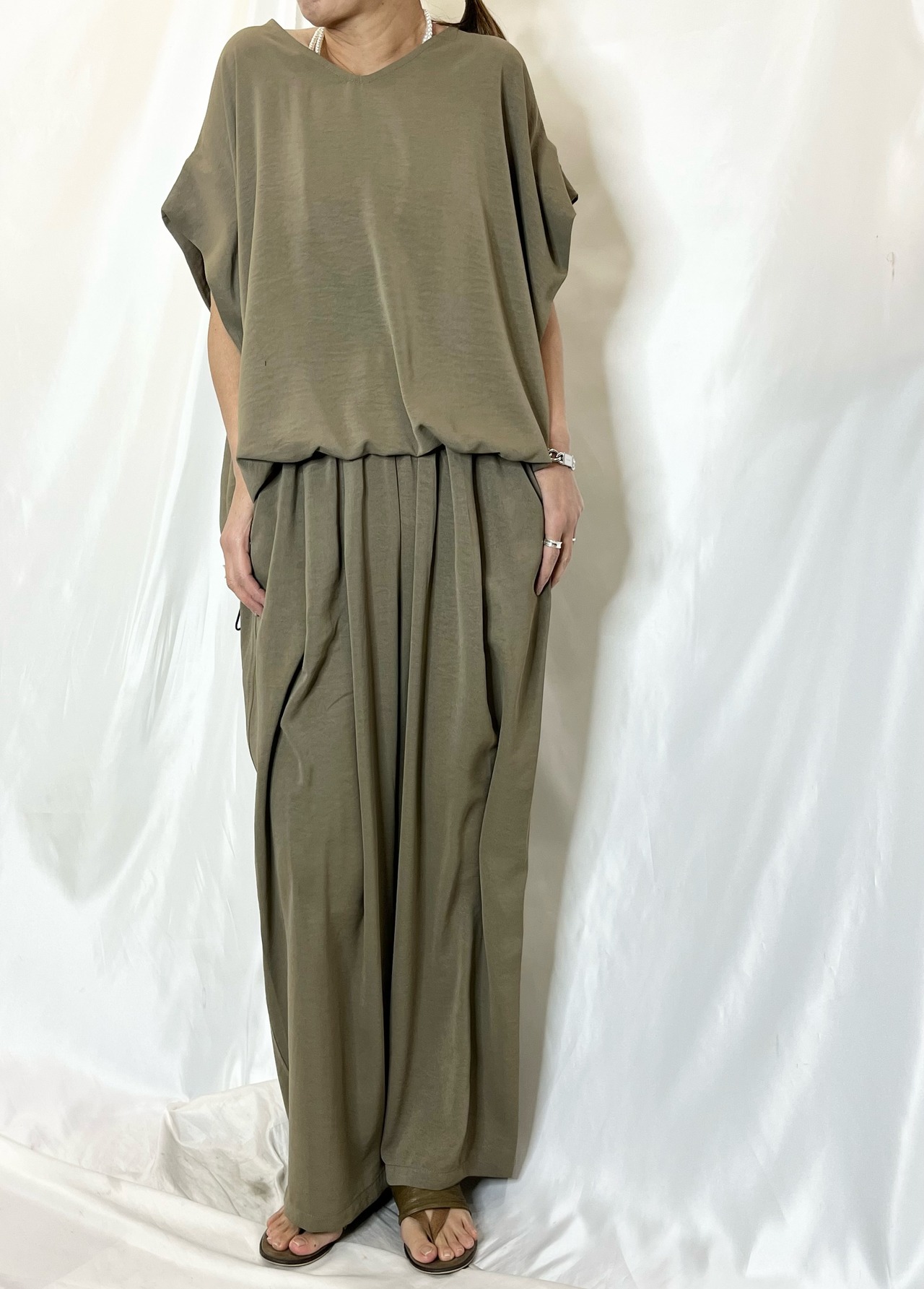 ウエストは総ゴム仕様で、内側の紐で穿き心地を調整できます。さらにウエスト部分にタックを施すことで、体型カバーも叶うデザインです。