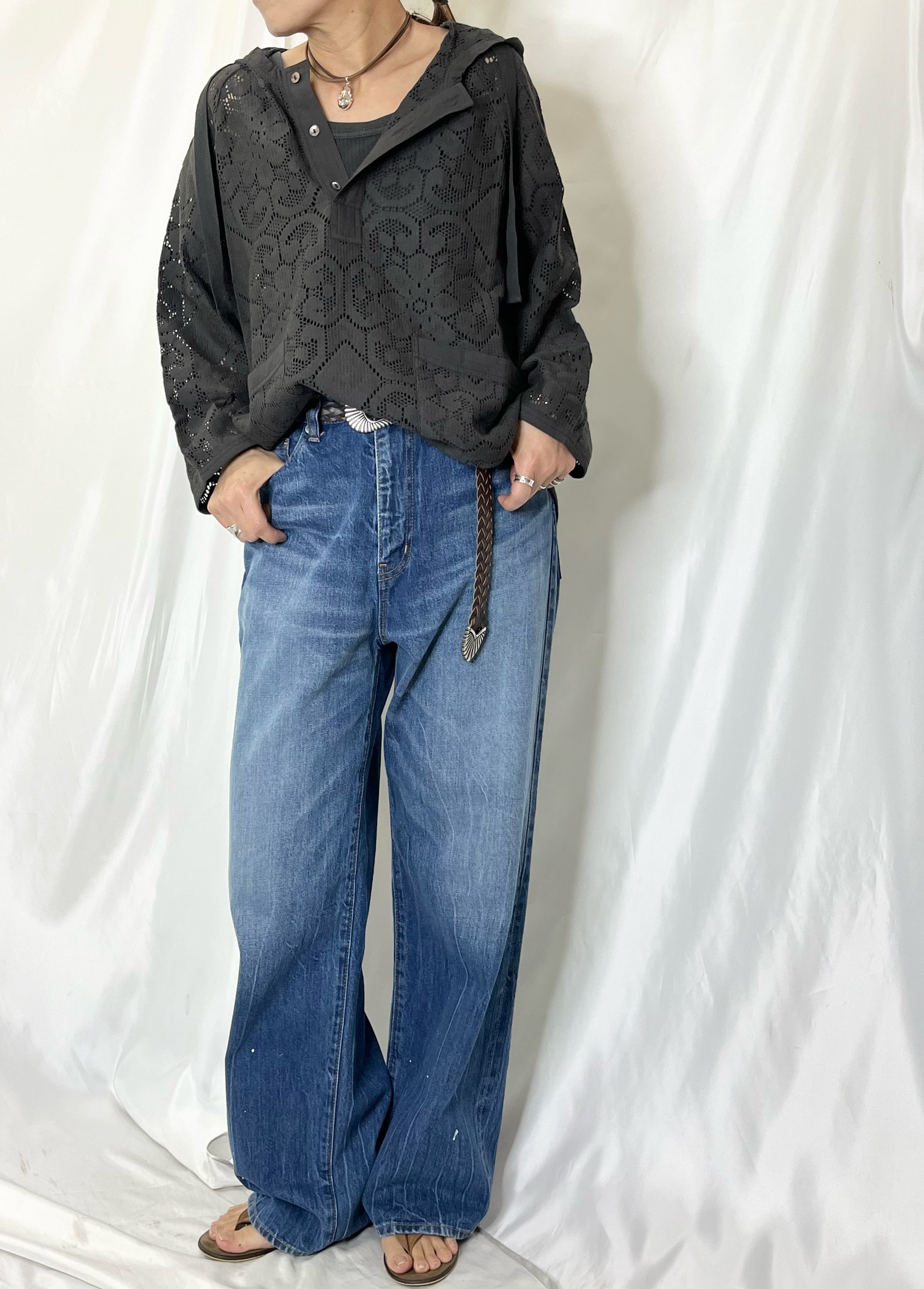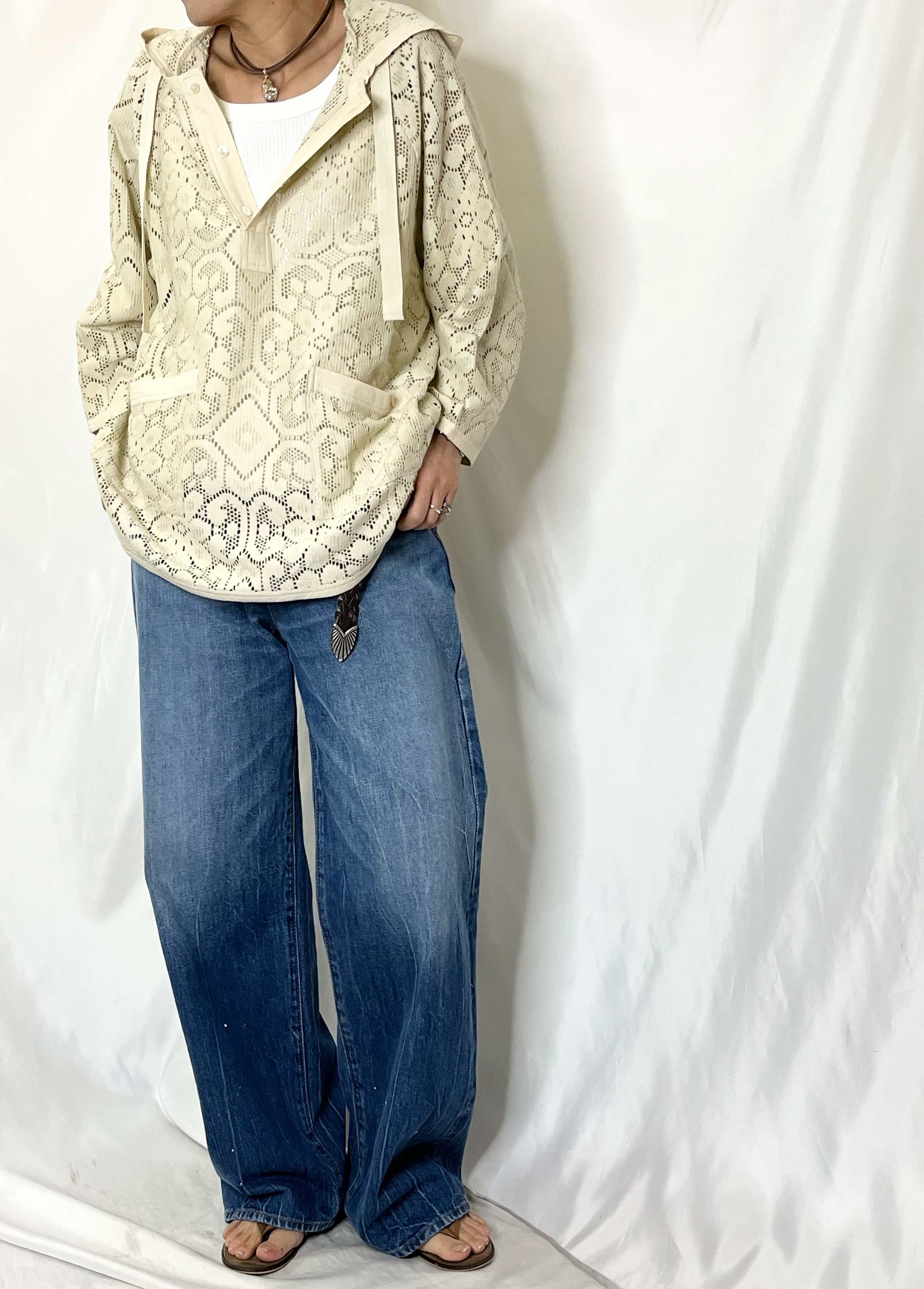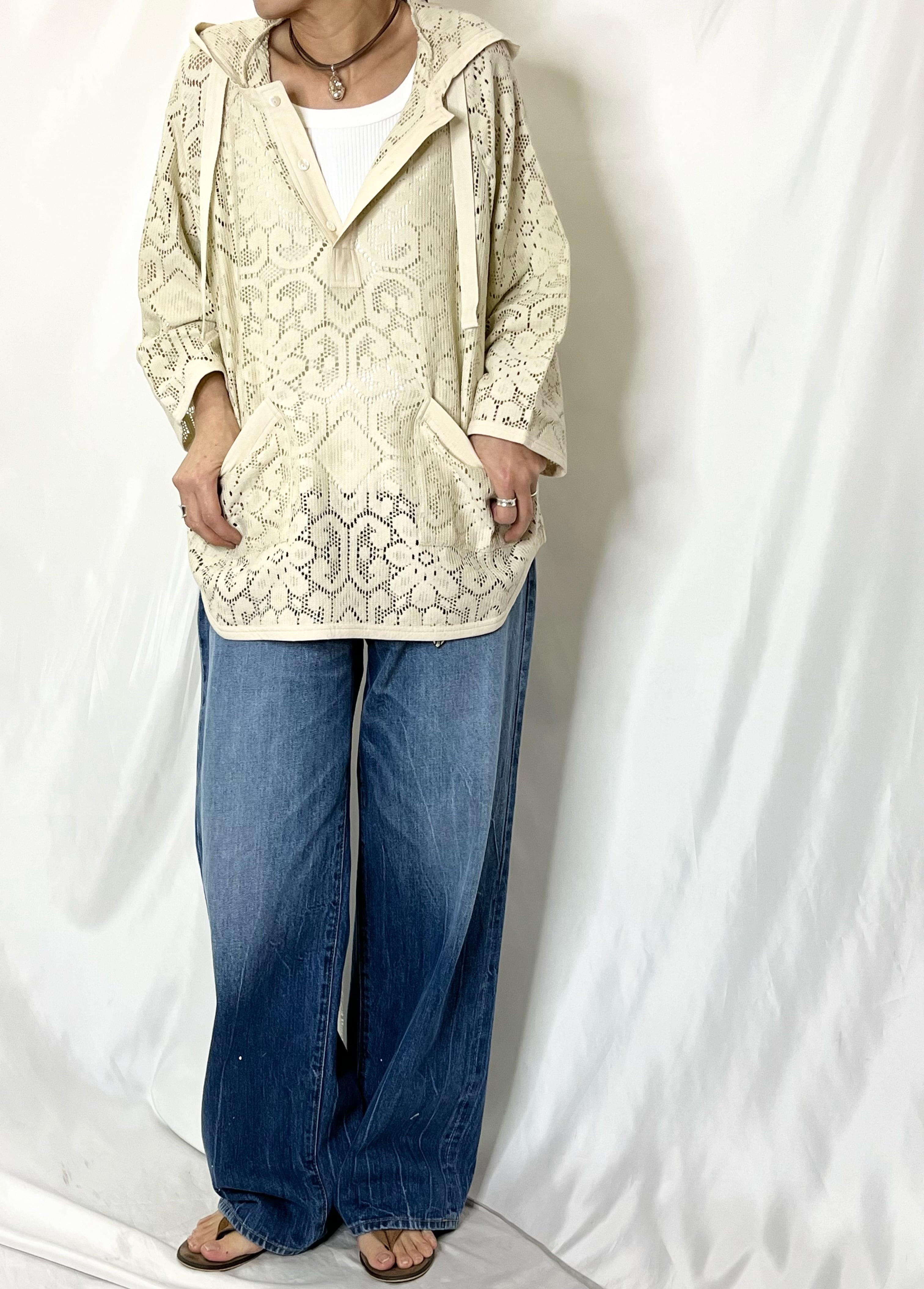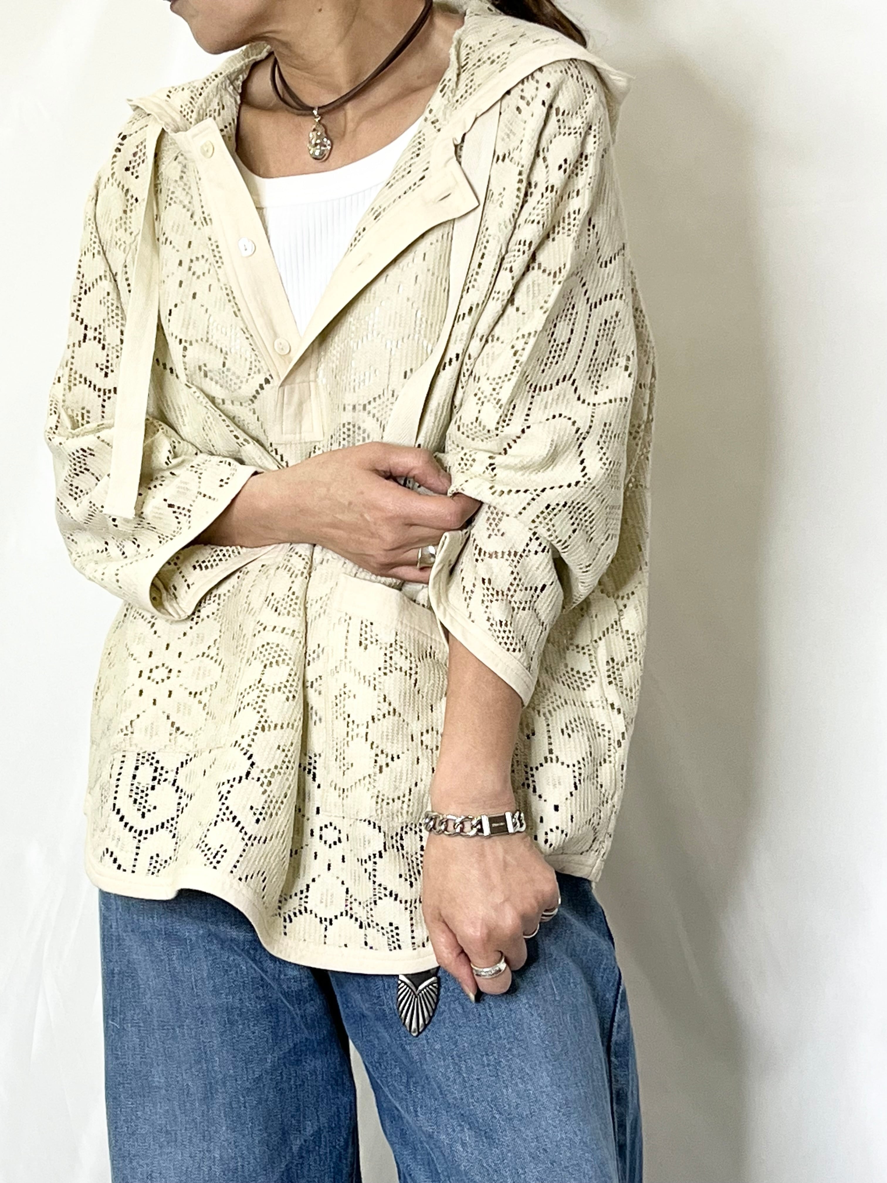 ヴィンテージ感のあるレースはシアー感があり、前ボタンを開けてレイヤードを楽しむスタイルがおすすめです。