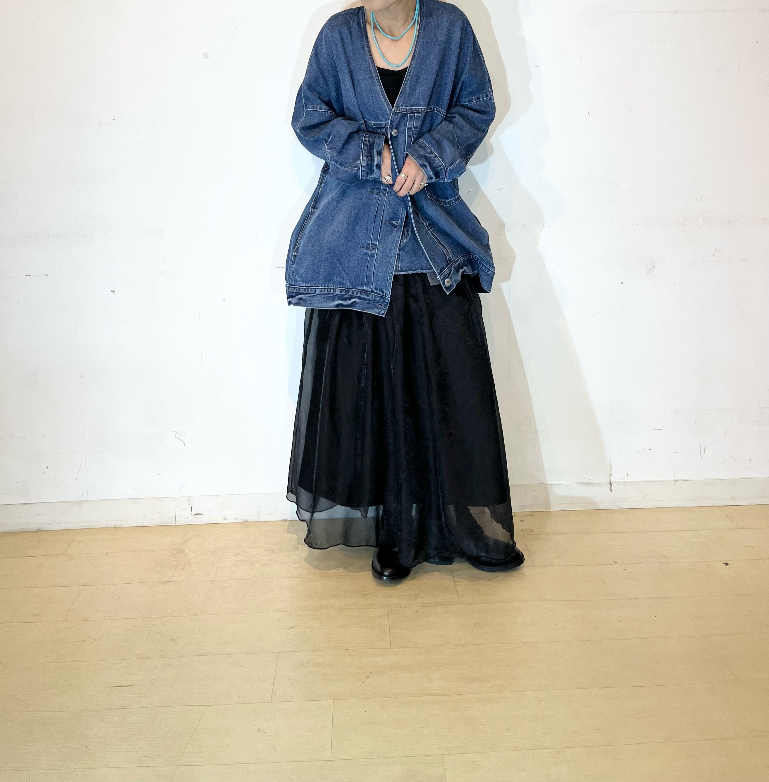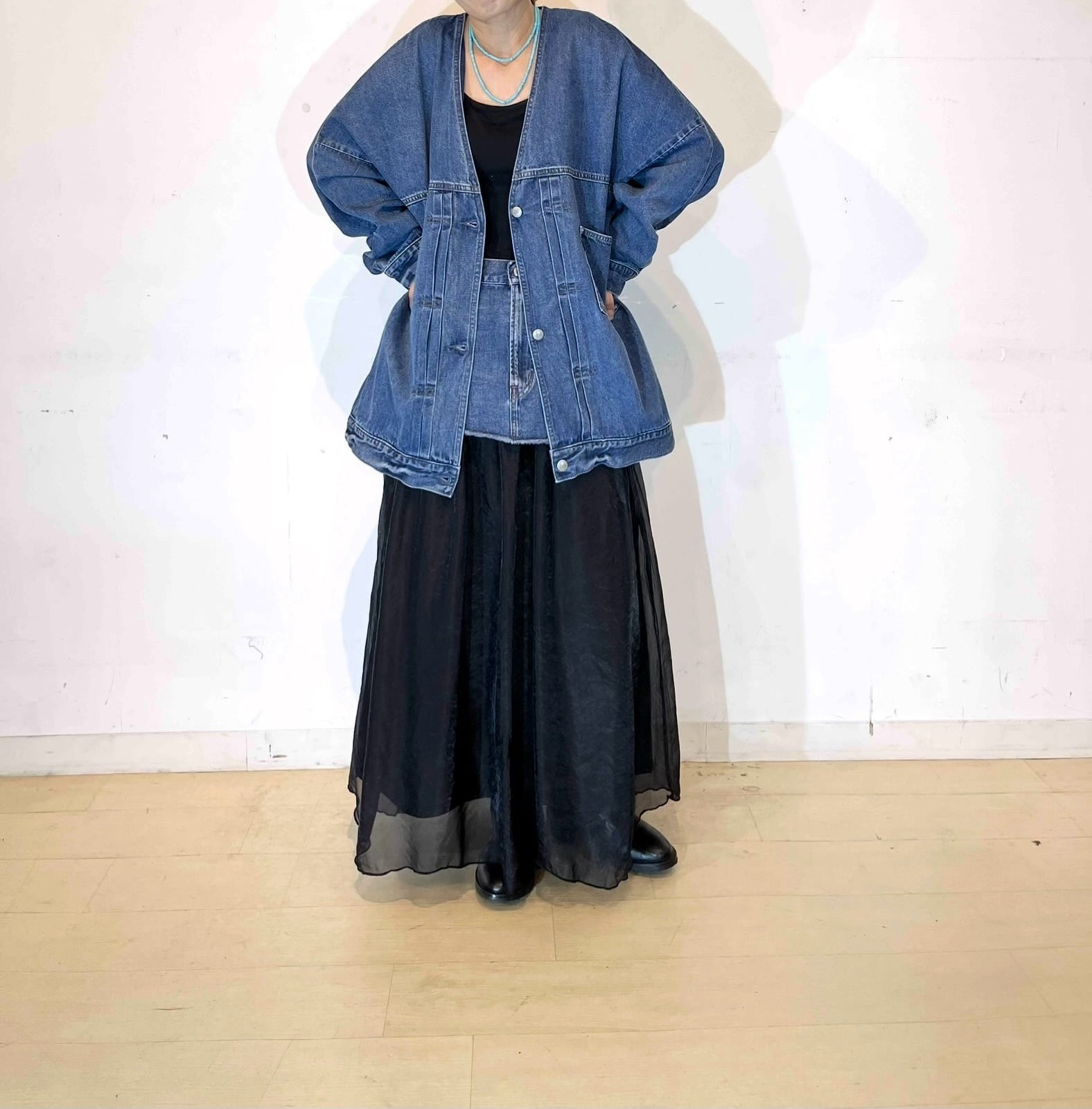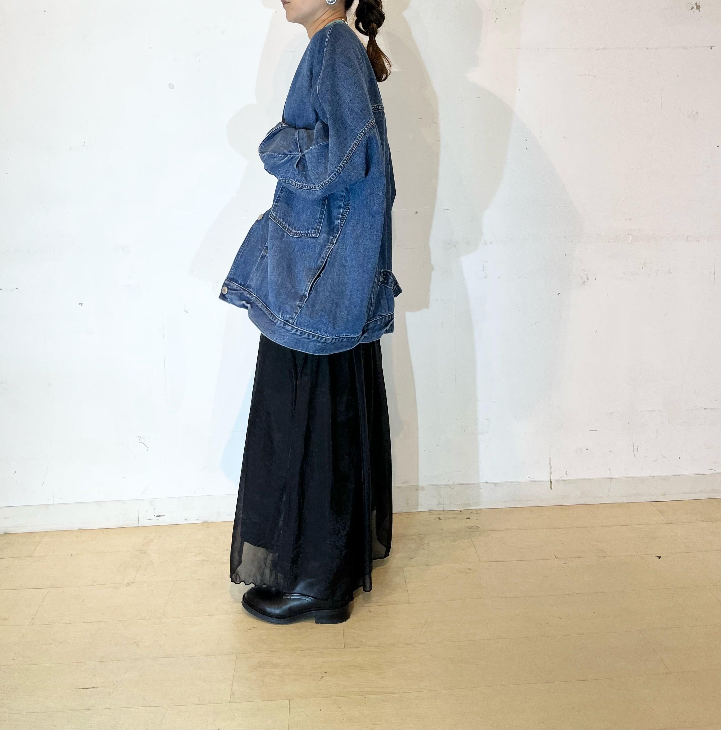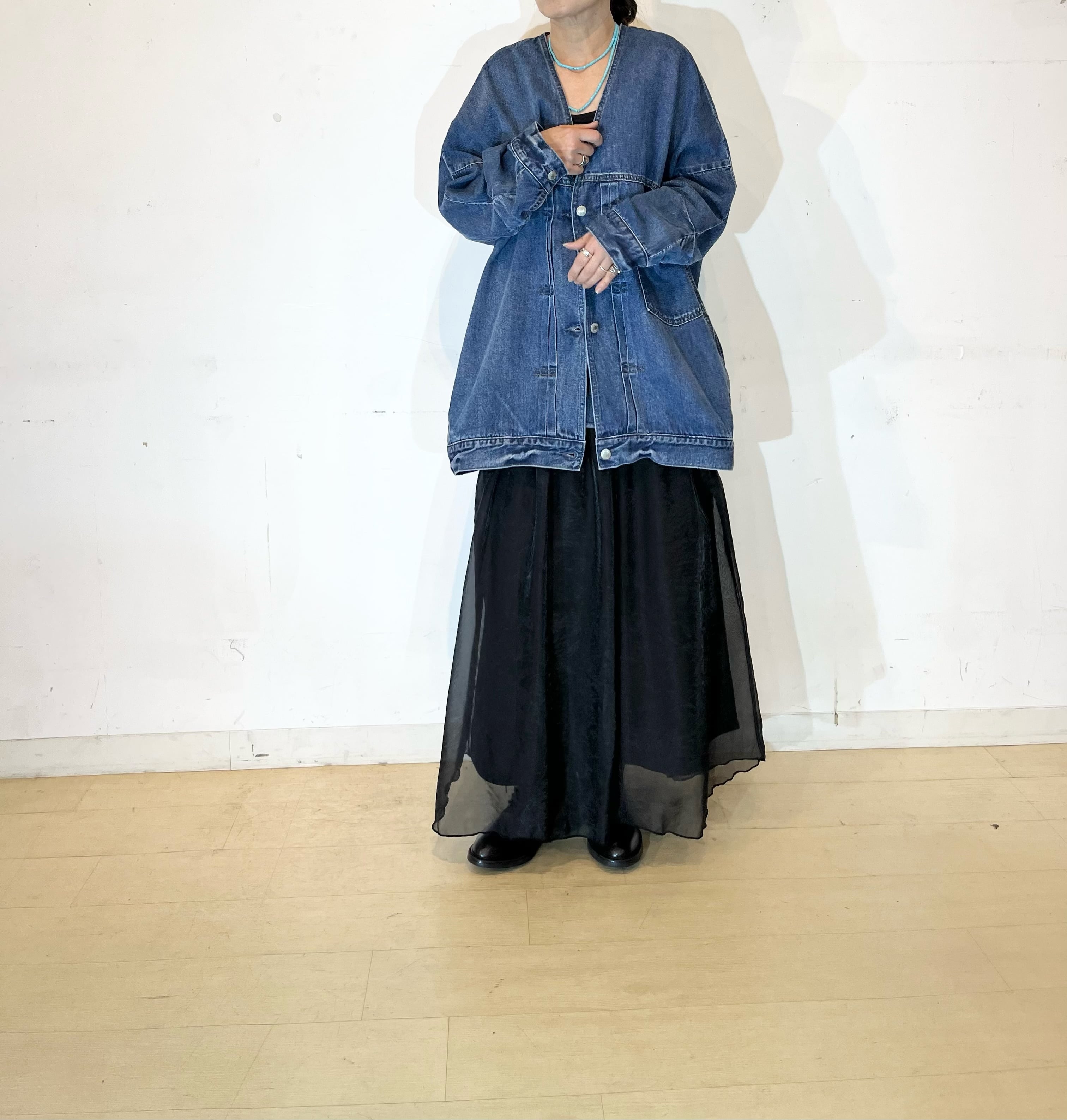 シャリ感のあるデニム素材ならではの軽い着心地とゆったりとしたサイズ感ながらも着ぶくれして見えないスッキリとしたシルエットがポイントです。