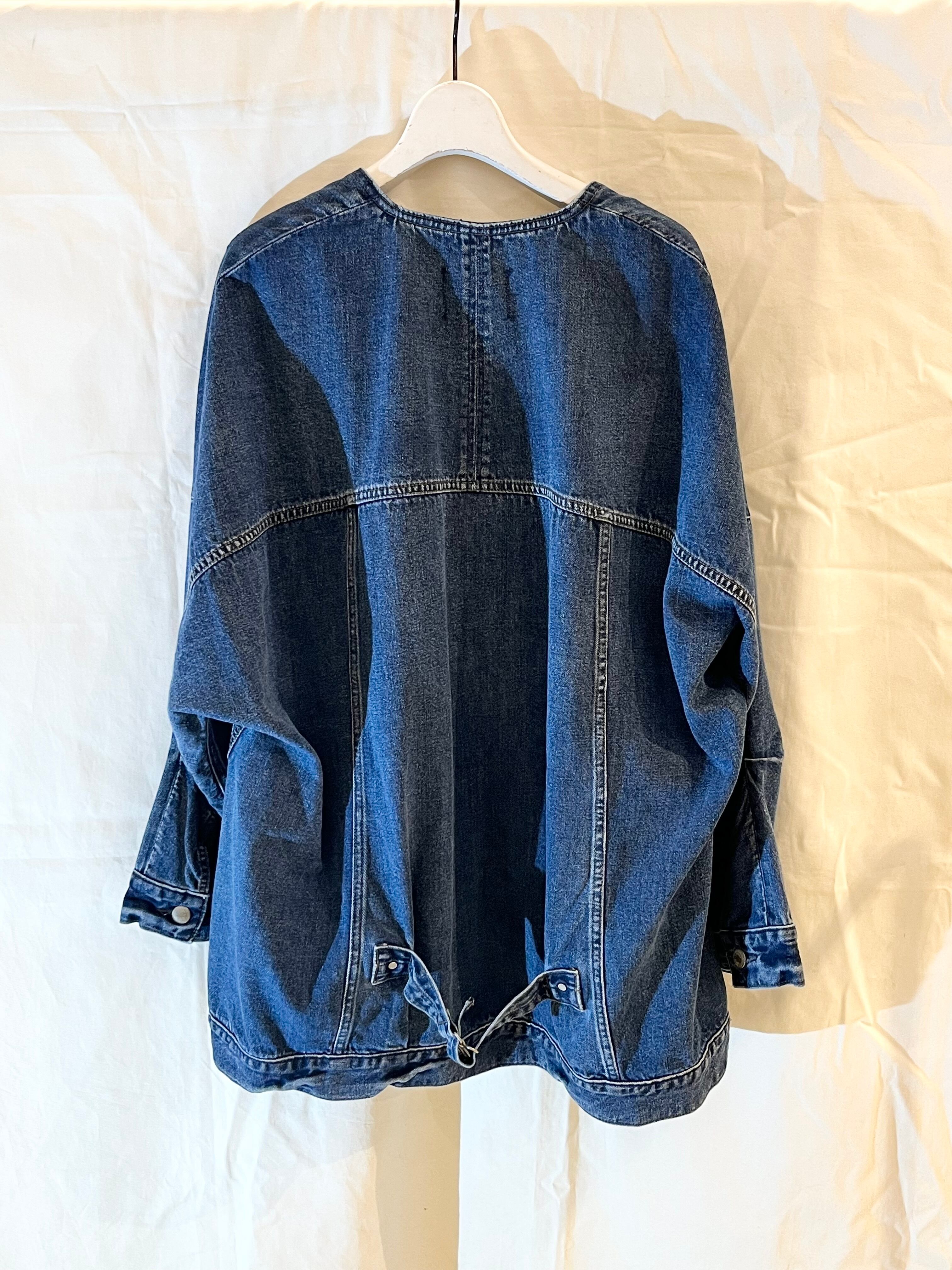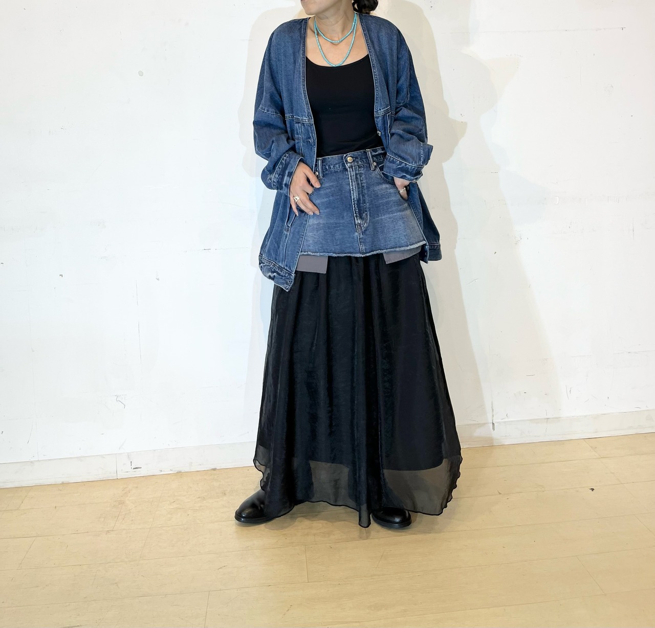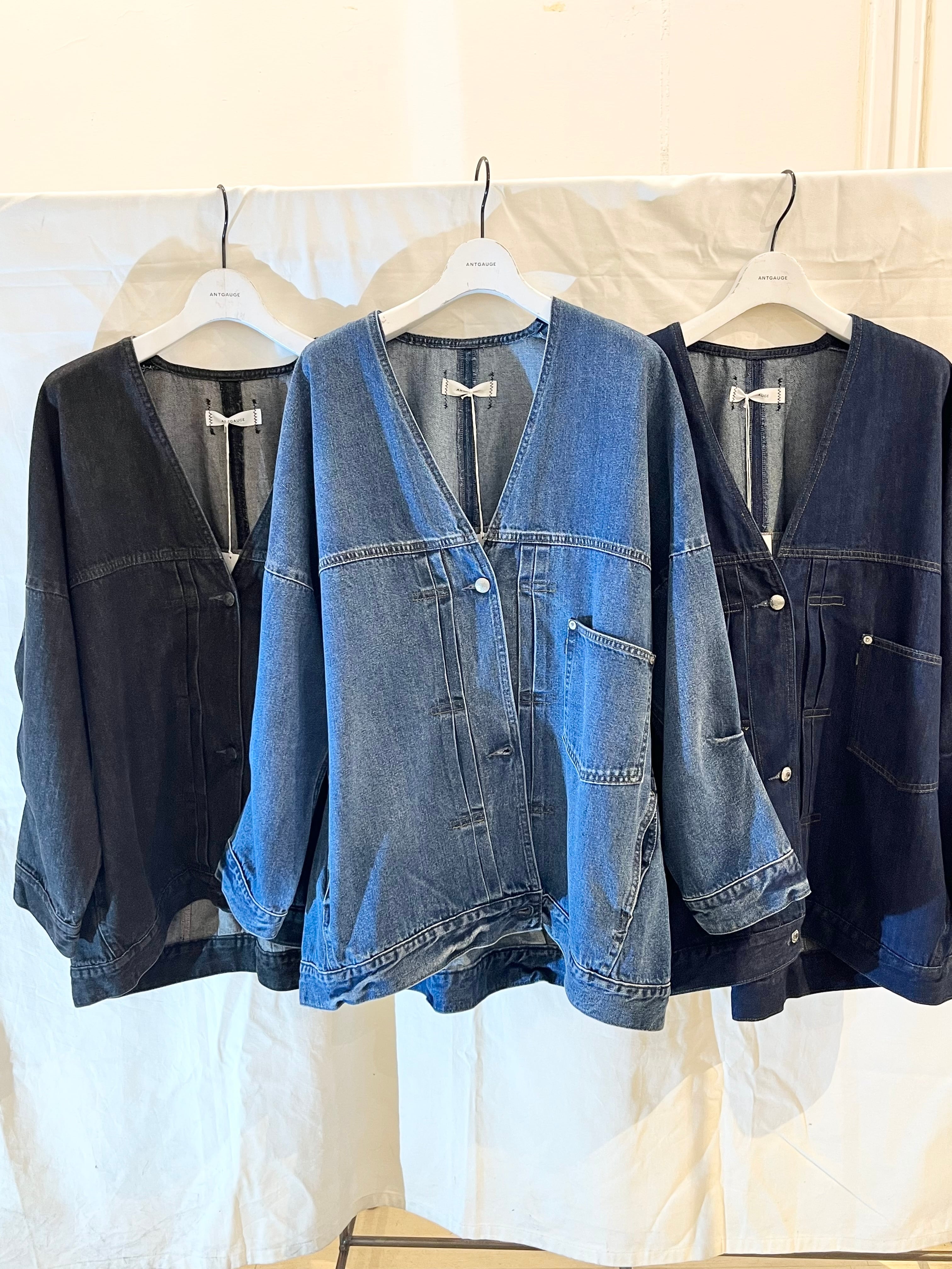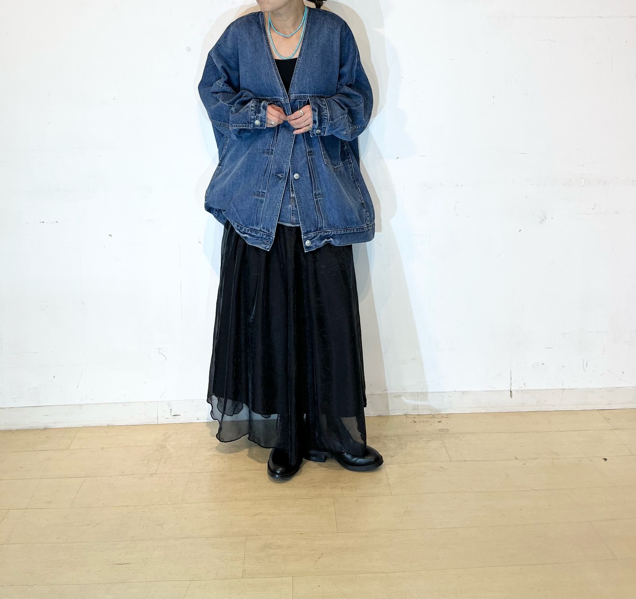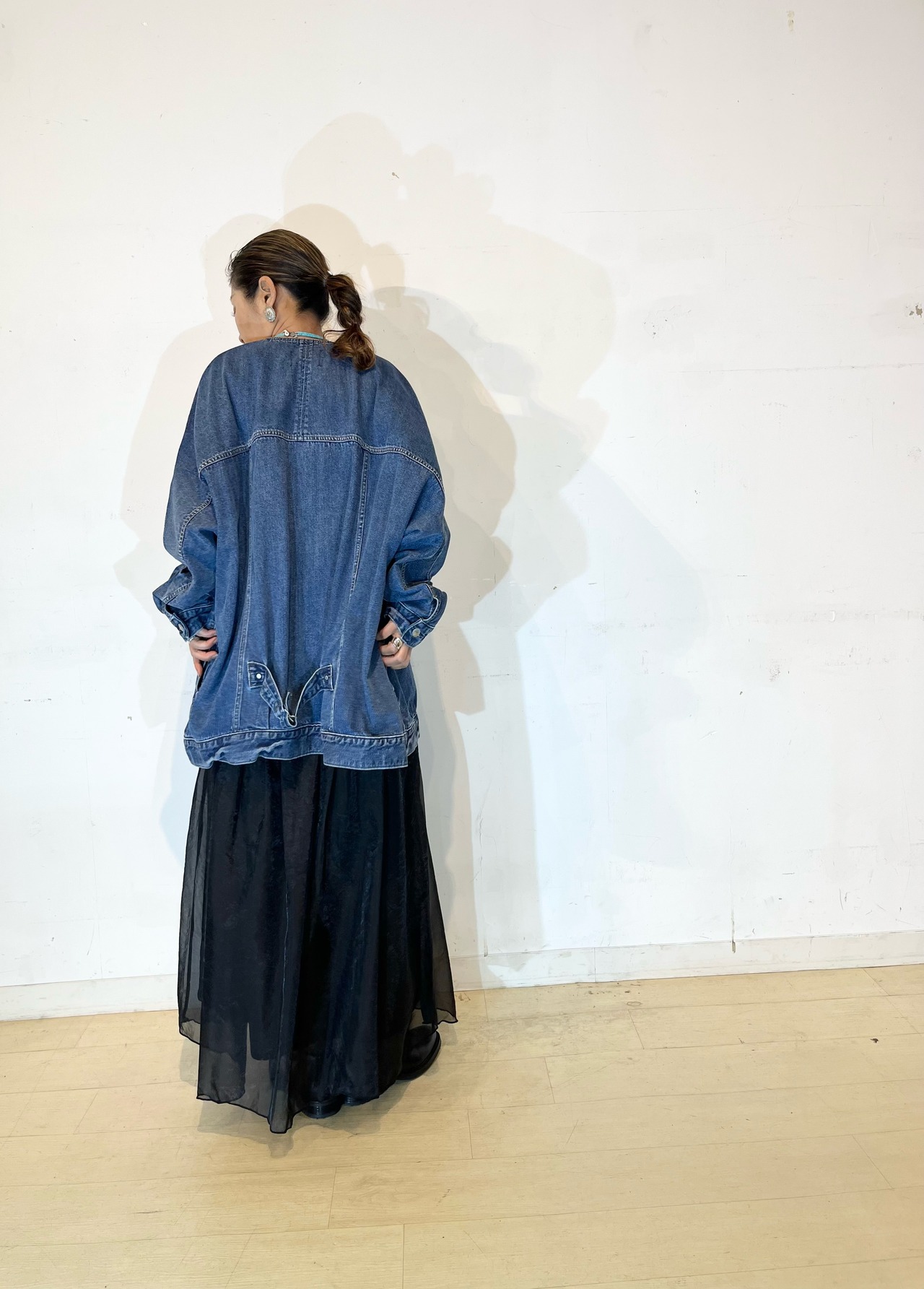 シャリ感のあるデニム素材ならではの軽い着心地とゆったりとしたサイズ感ながらも着ぶくれして見えないスッキリとしたシルエットがポイントです。
