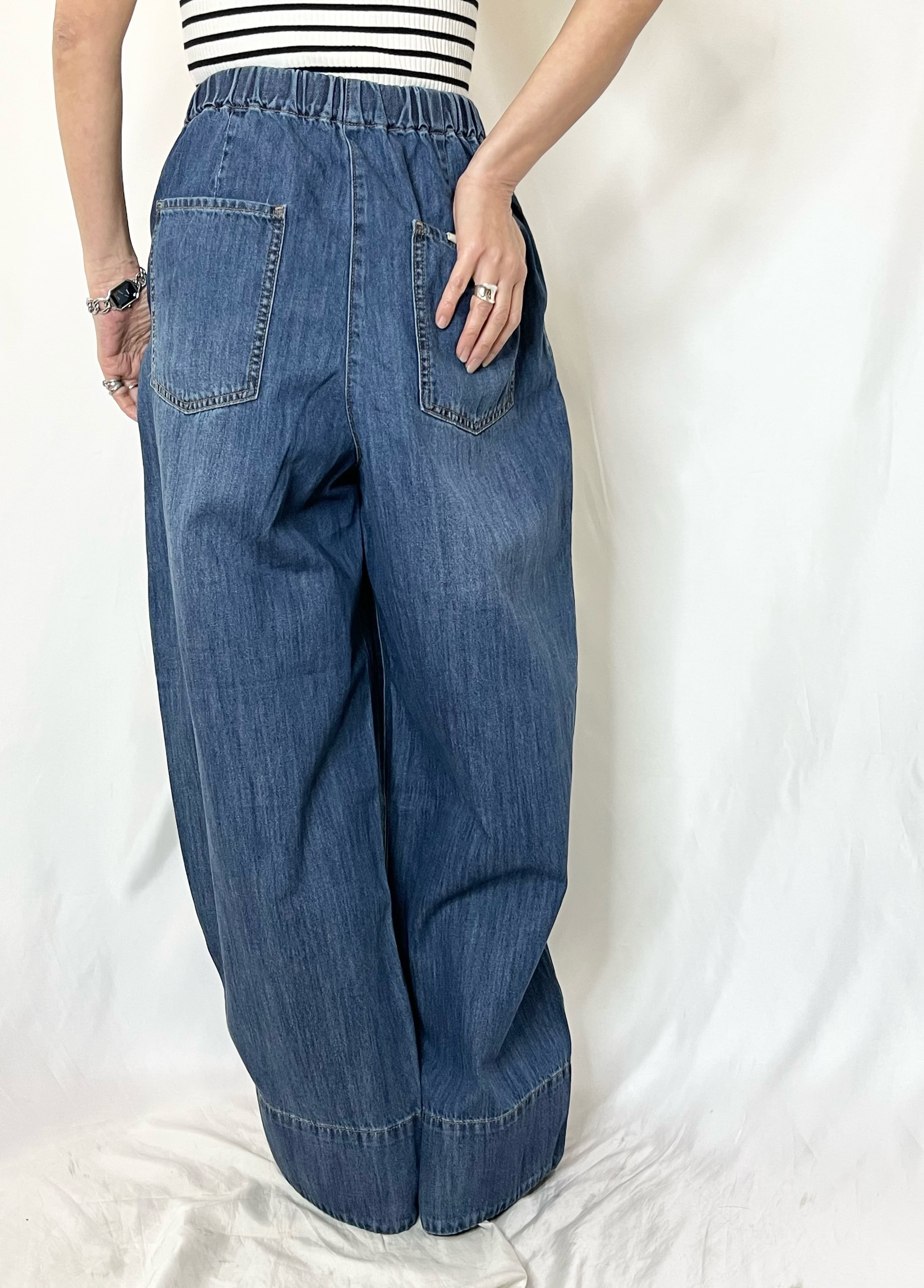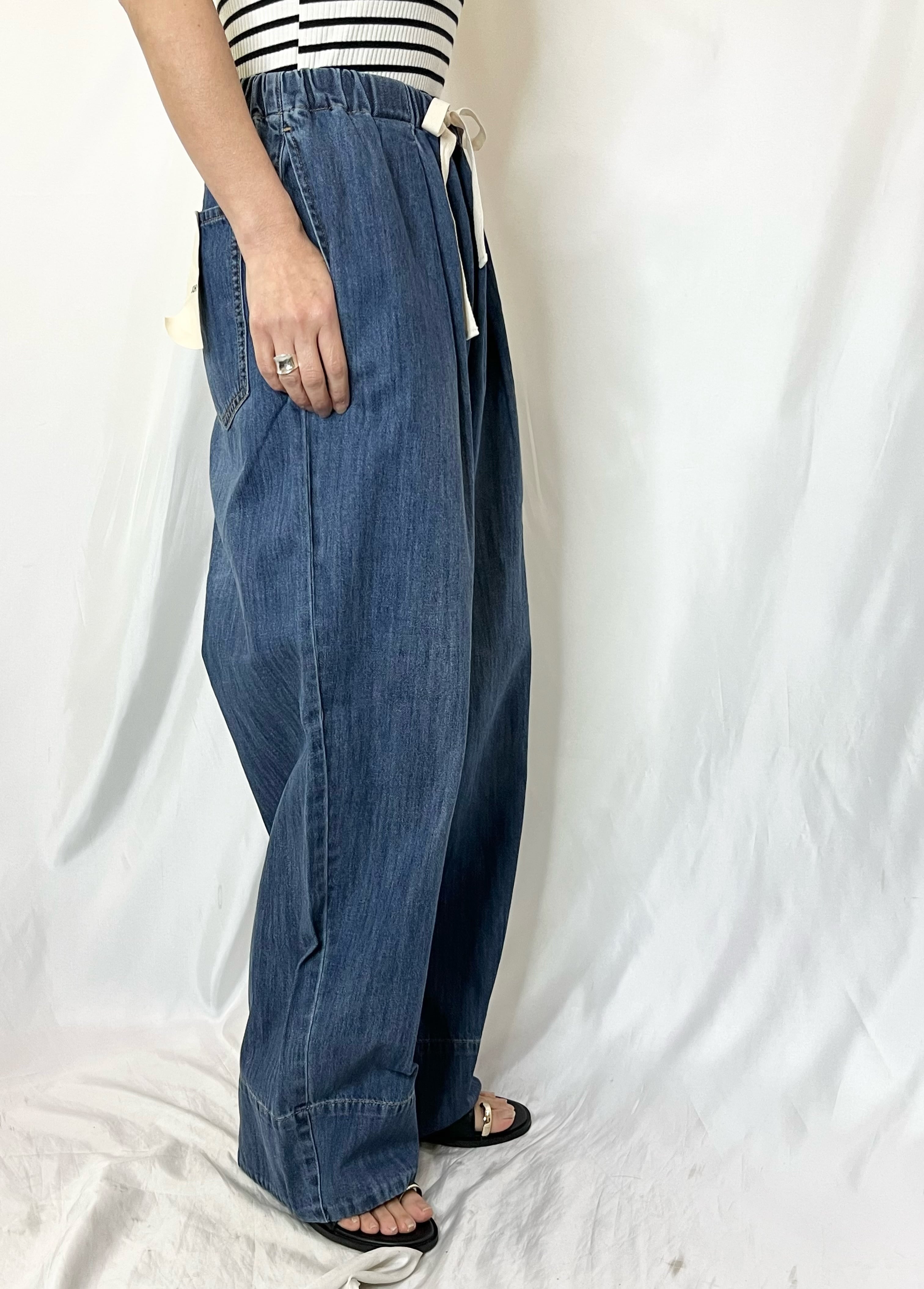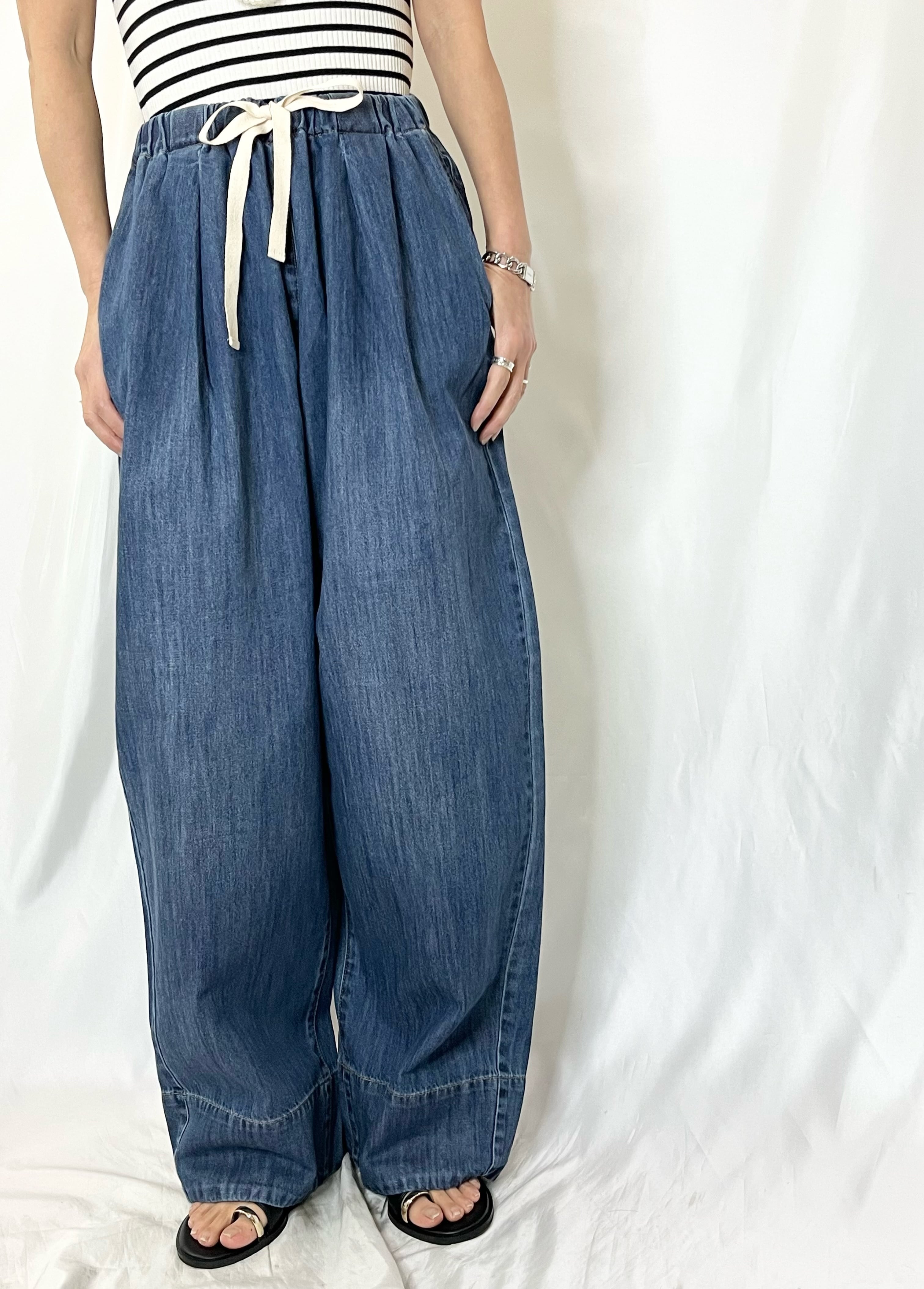 ウエストゴムのイージーなデニムパンツ。