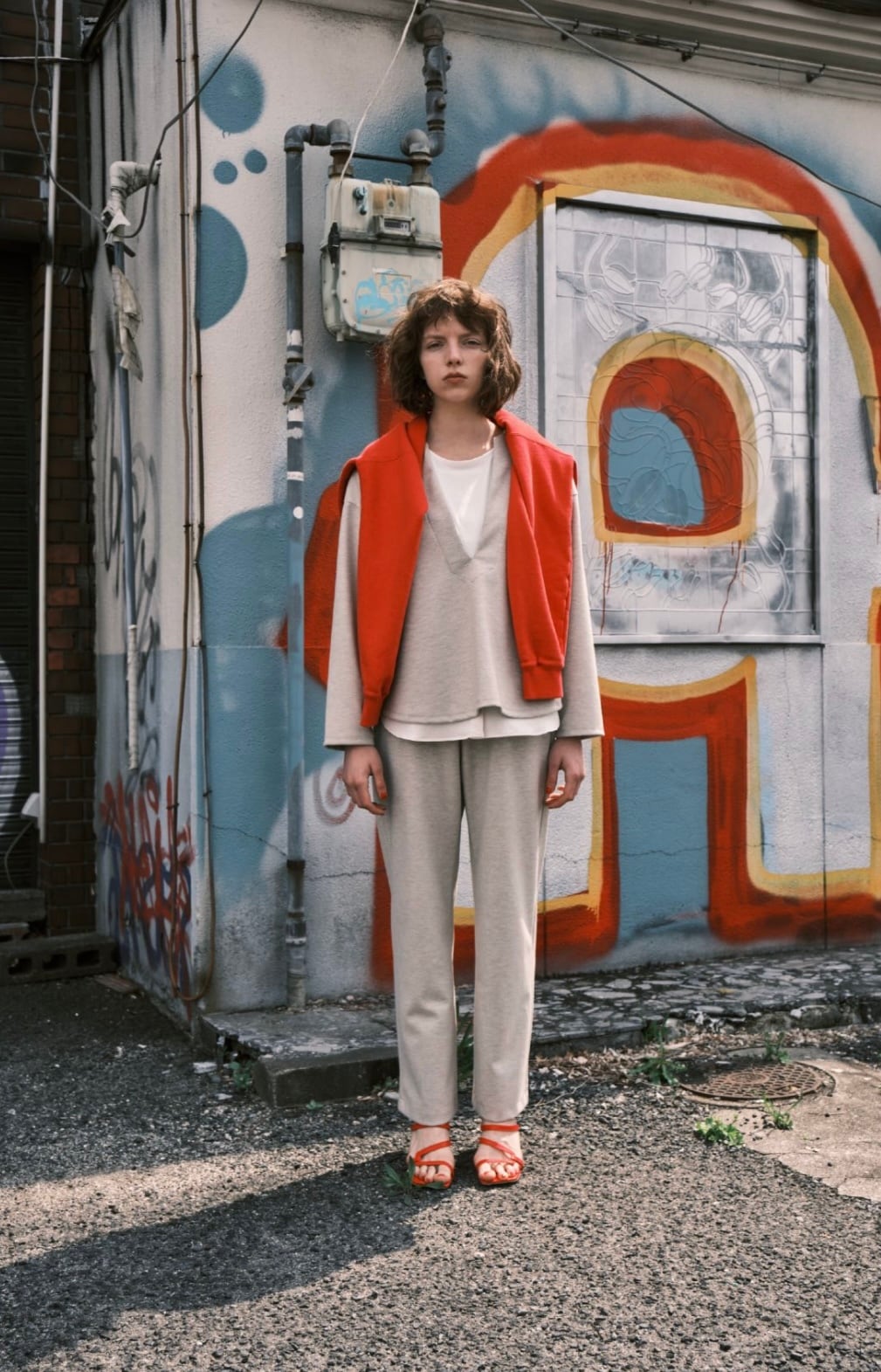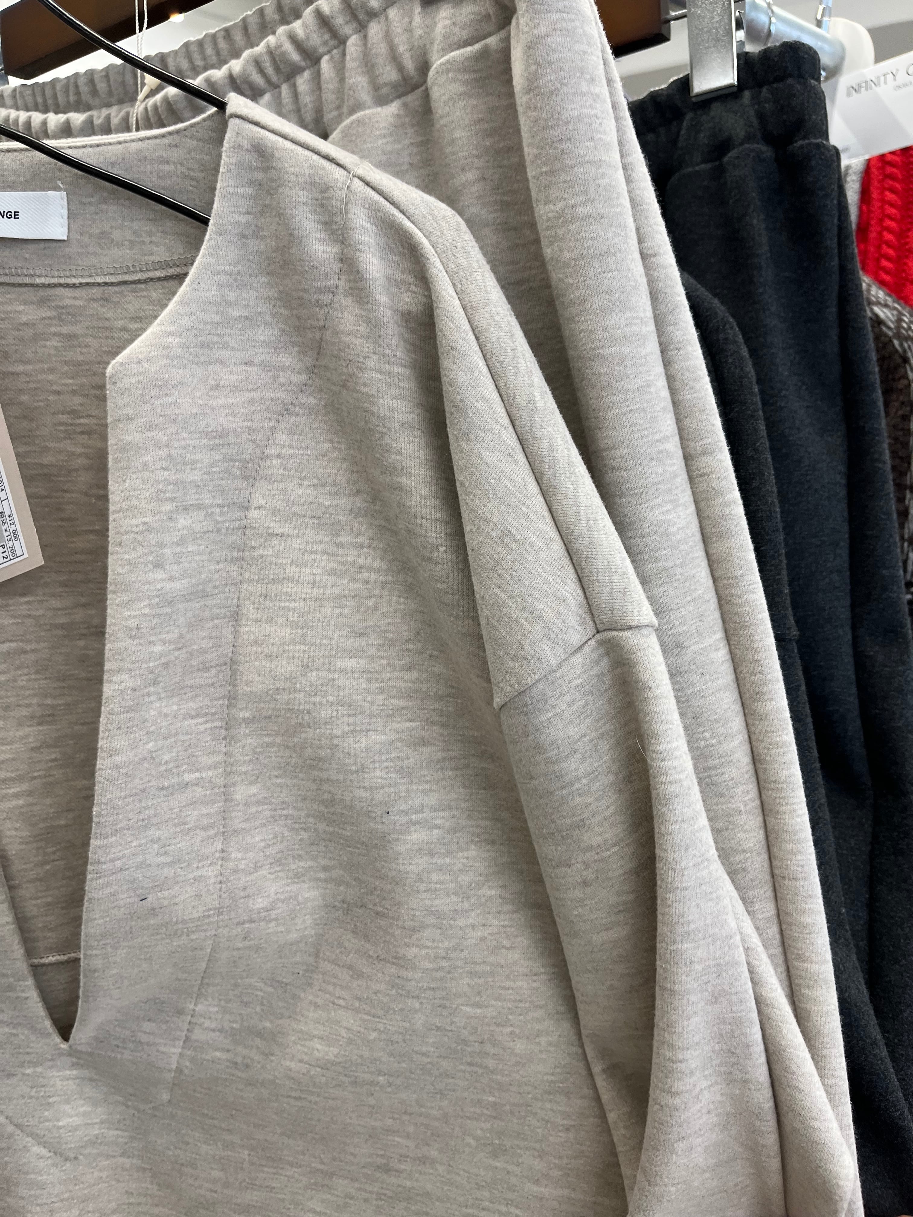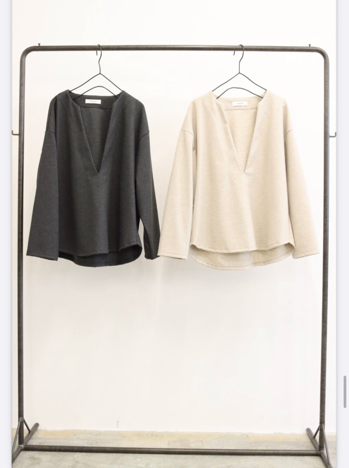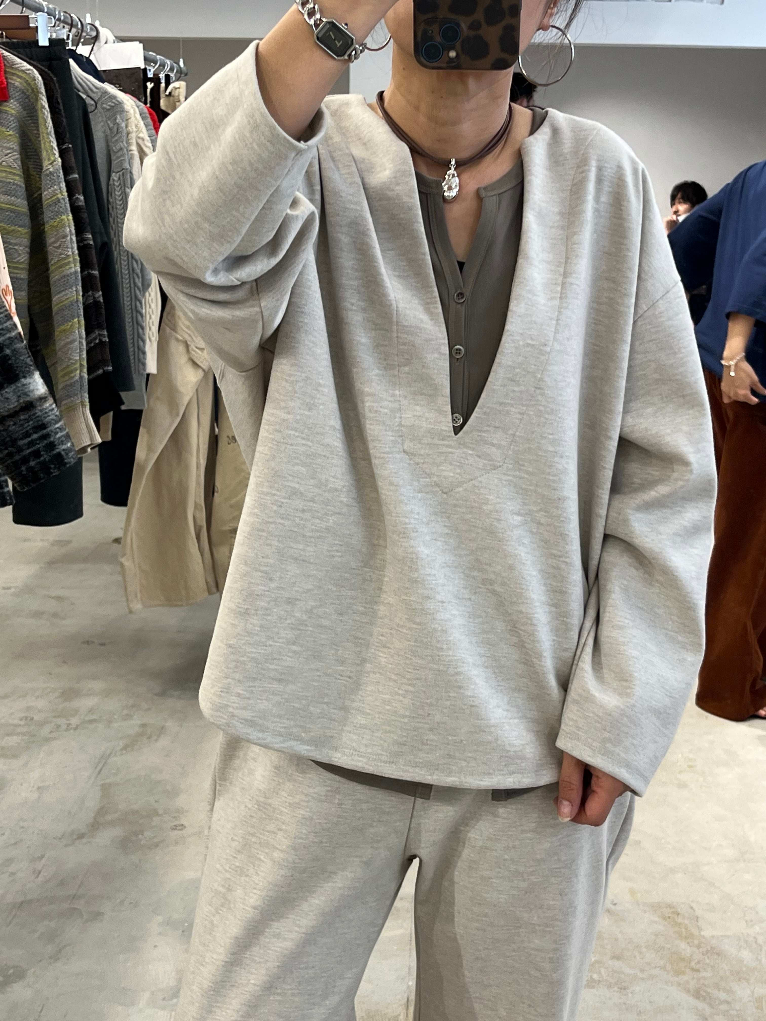 全体にオーバーサイズでリラックス感の漂うPO。衿元は深めのキーネックで、インナー合わせが楽しめるデザイン。