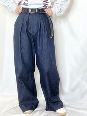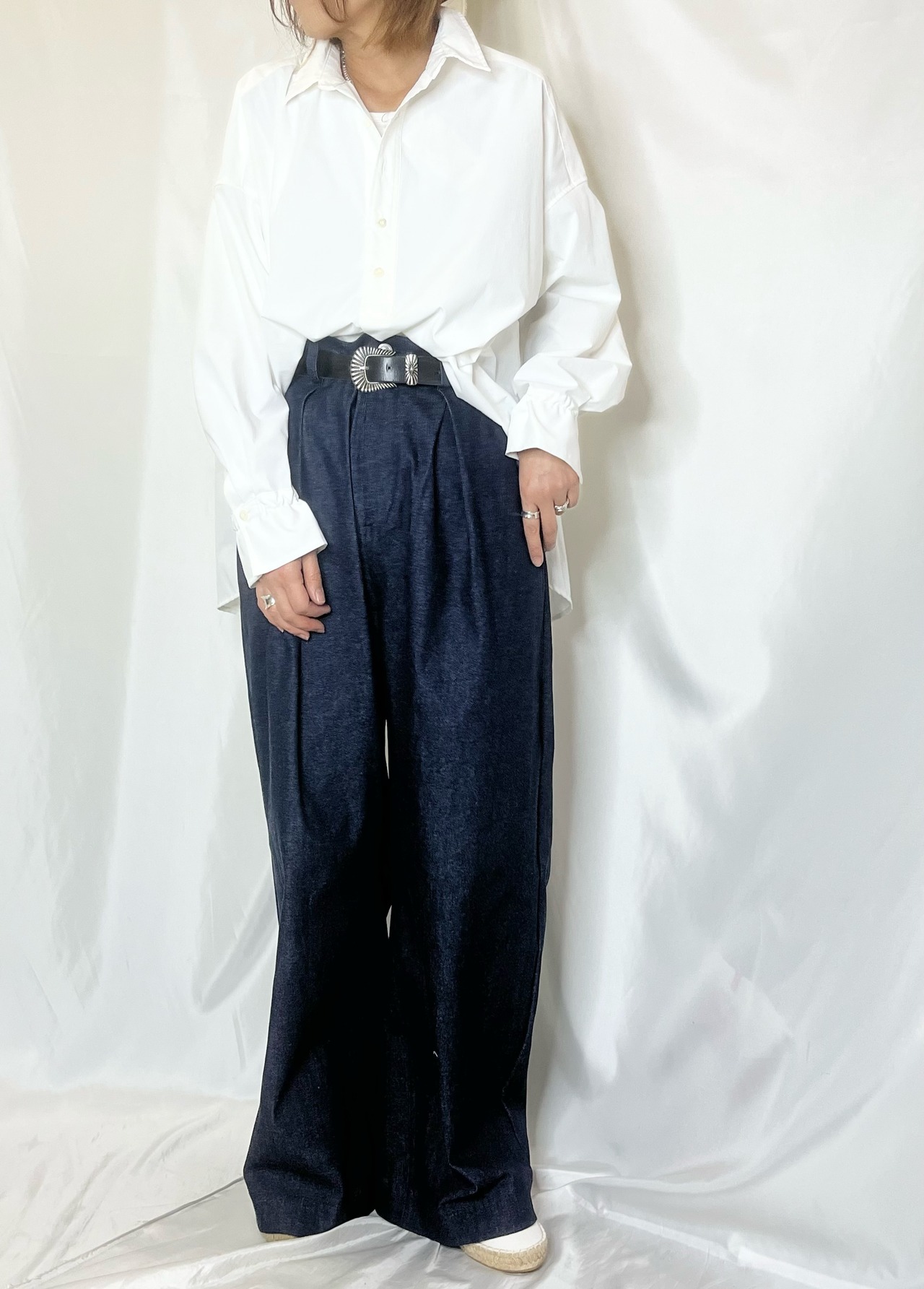 少しヒップハングで履いてもらうとワイドパンツに見えます。