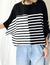 体のラインを拾わないドルマンスリーブで、ゆったりなサイズ感と異素材のコンビが着心地、見た目ともにオススメなTシャツです。