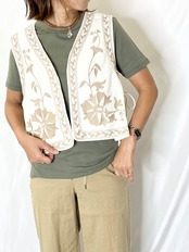 身頃に大きなフラワーモチーフ、衿周りにはリーフ柄のトリミングの刺繍を施したショートベスト。