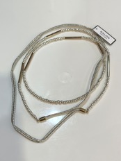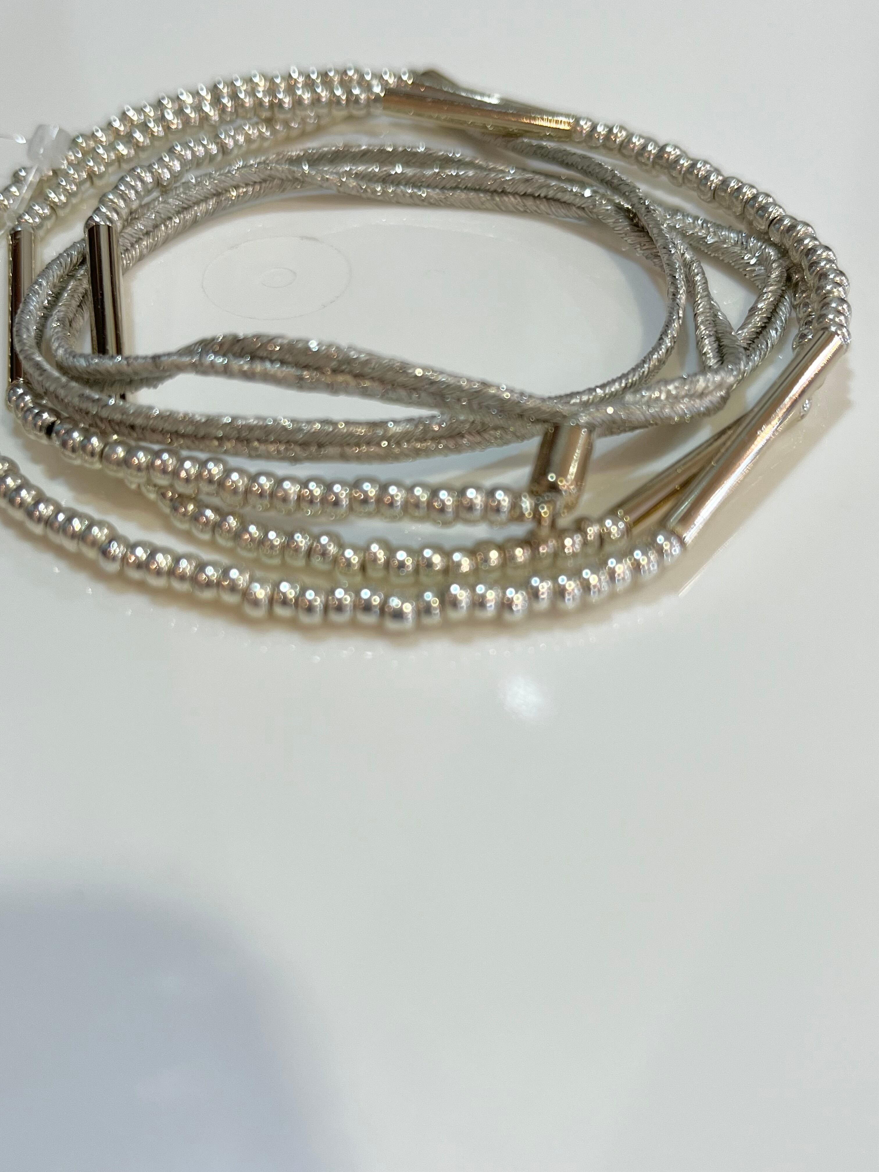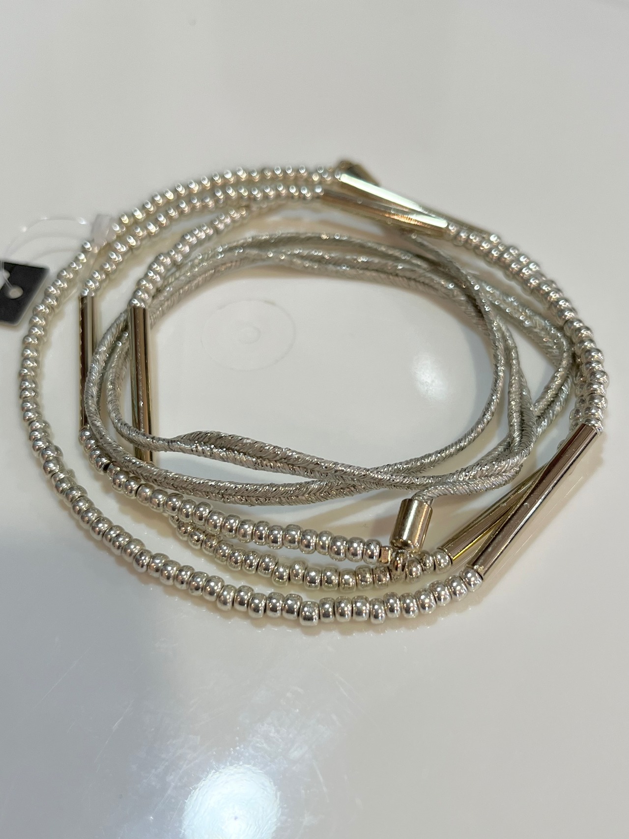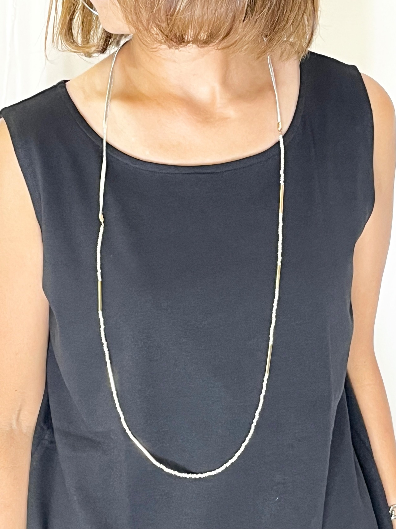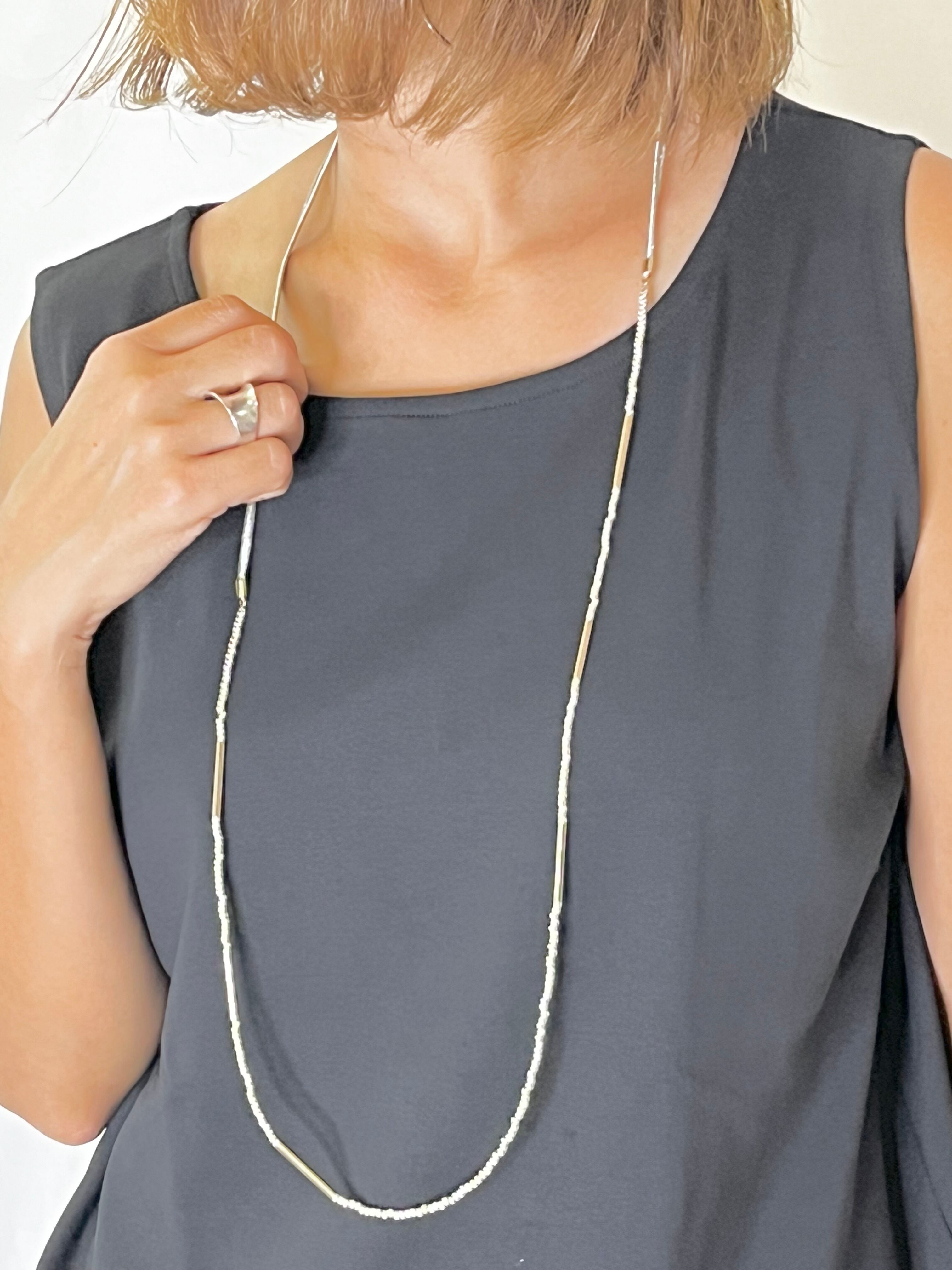 シルバービーズとシルバーの暇が絶妙なバランスで組み合わさったロングネックレス。