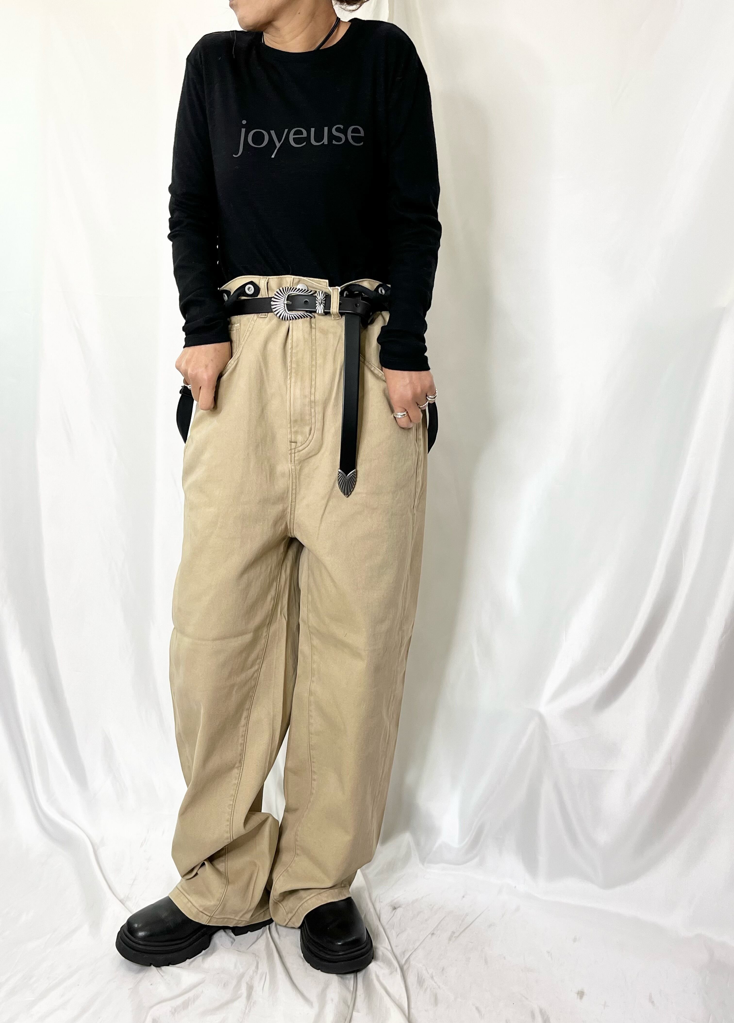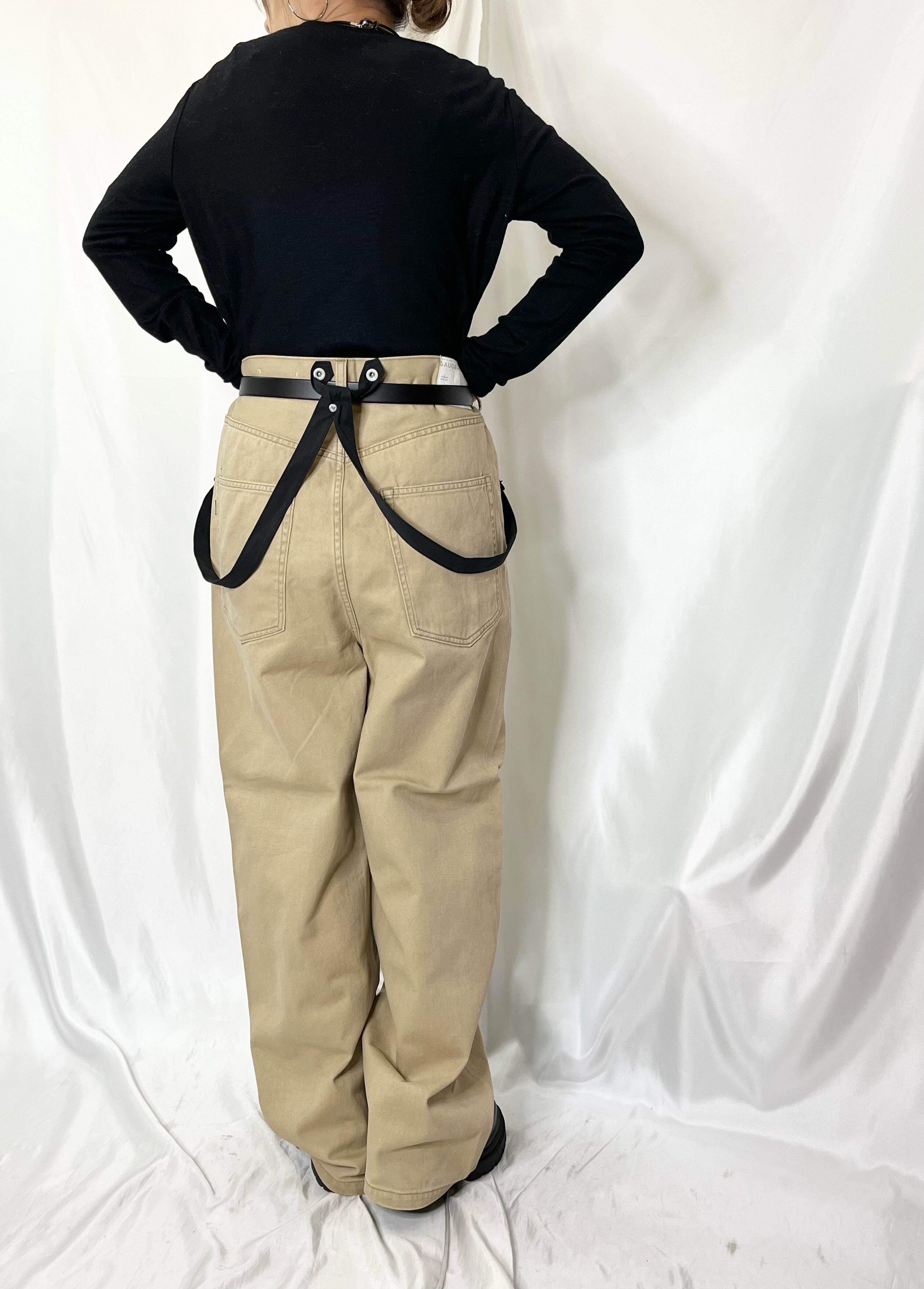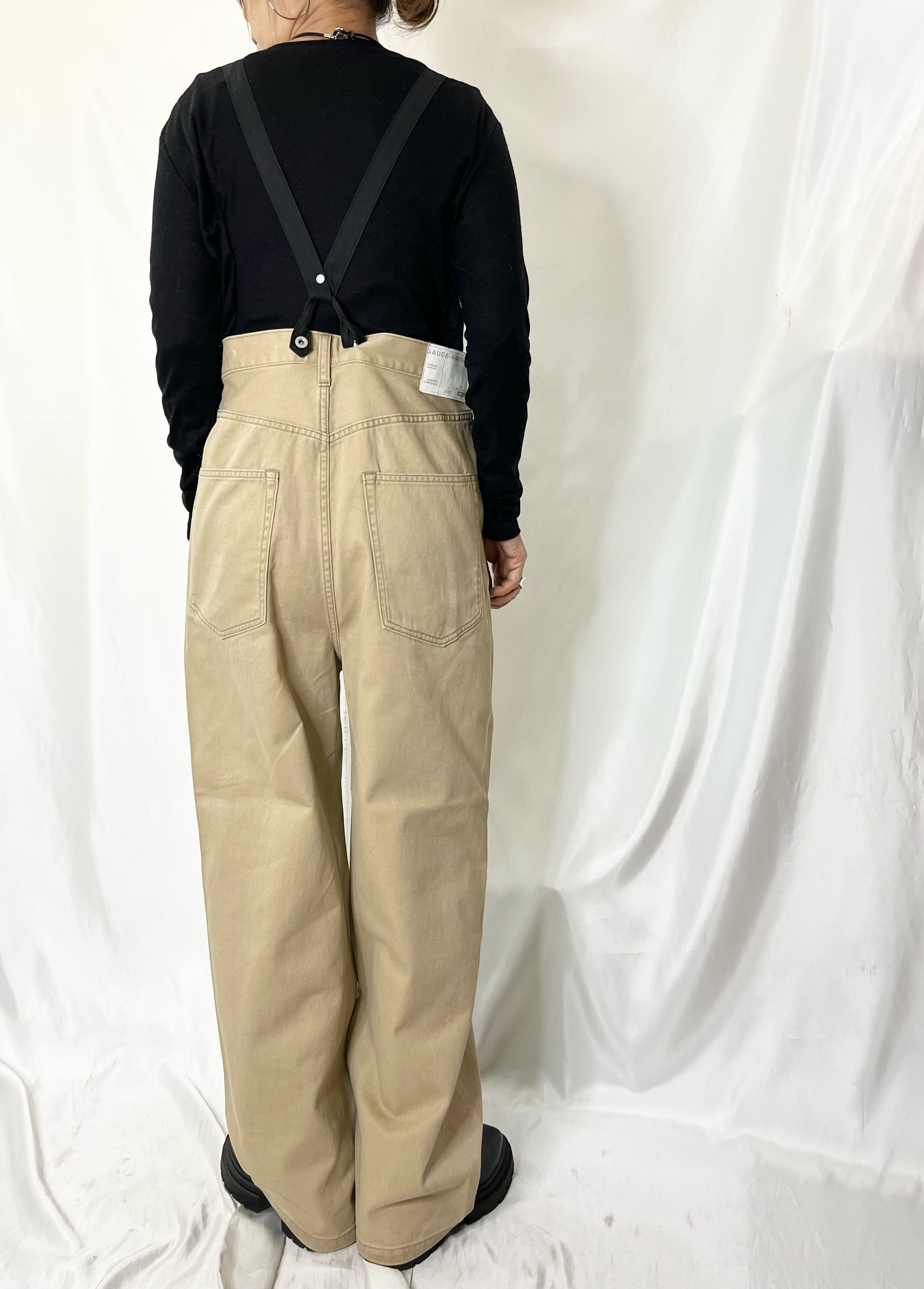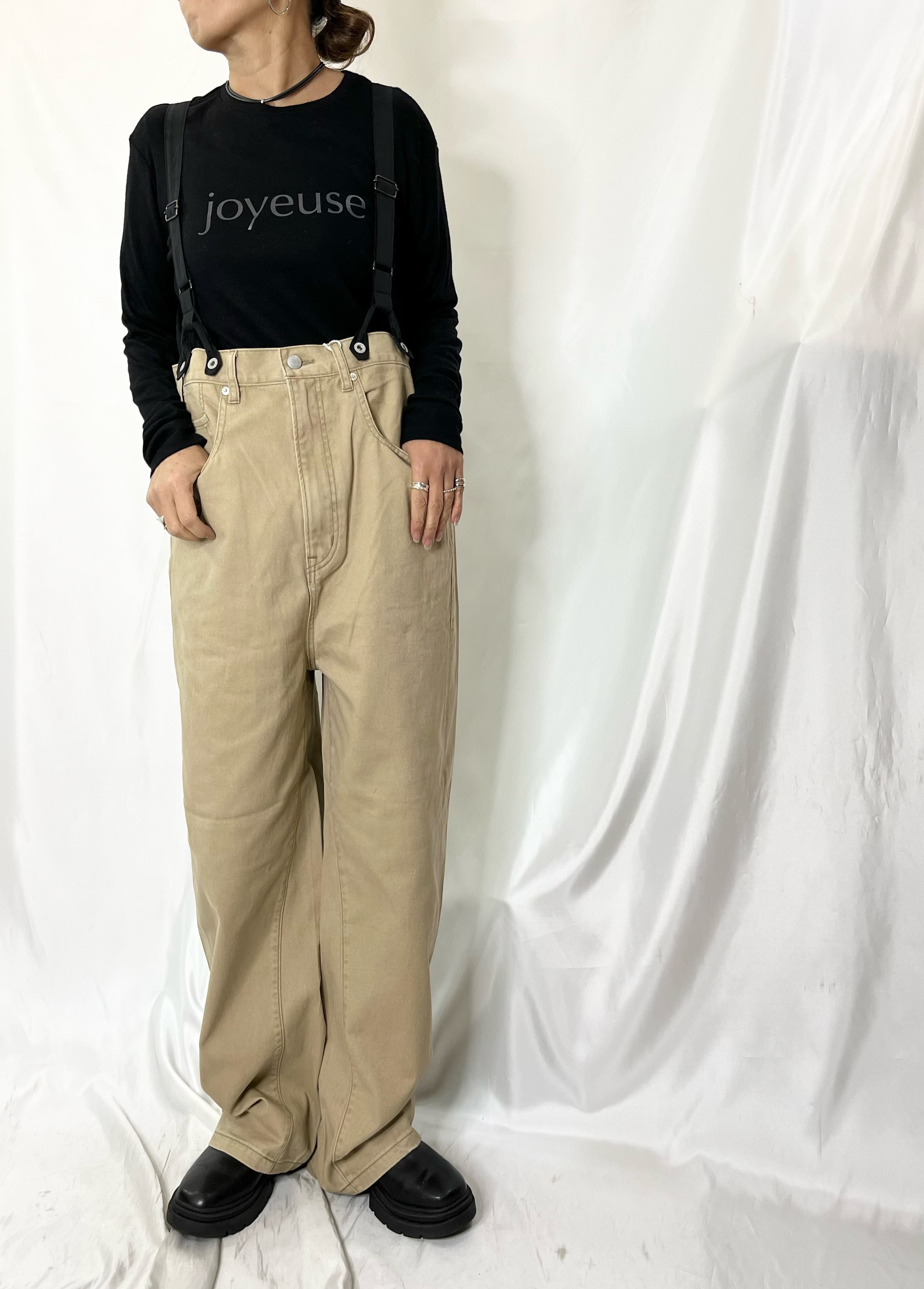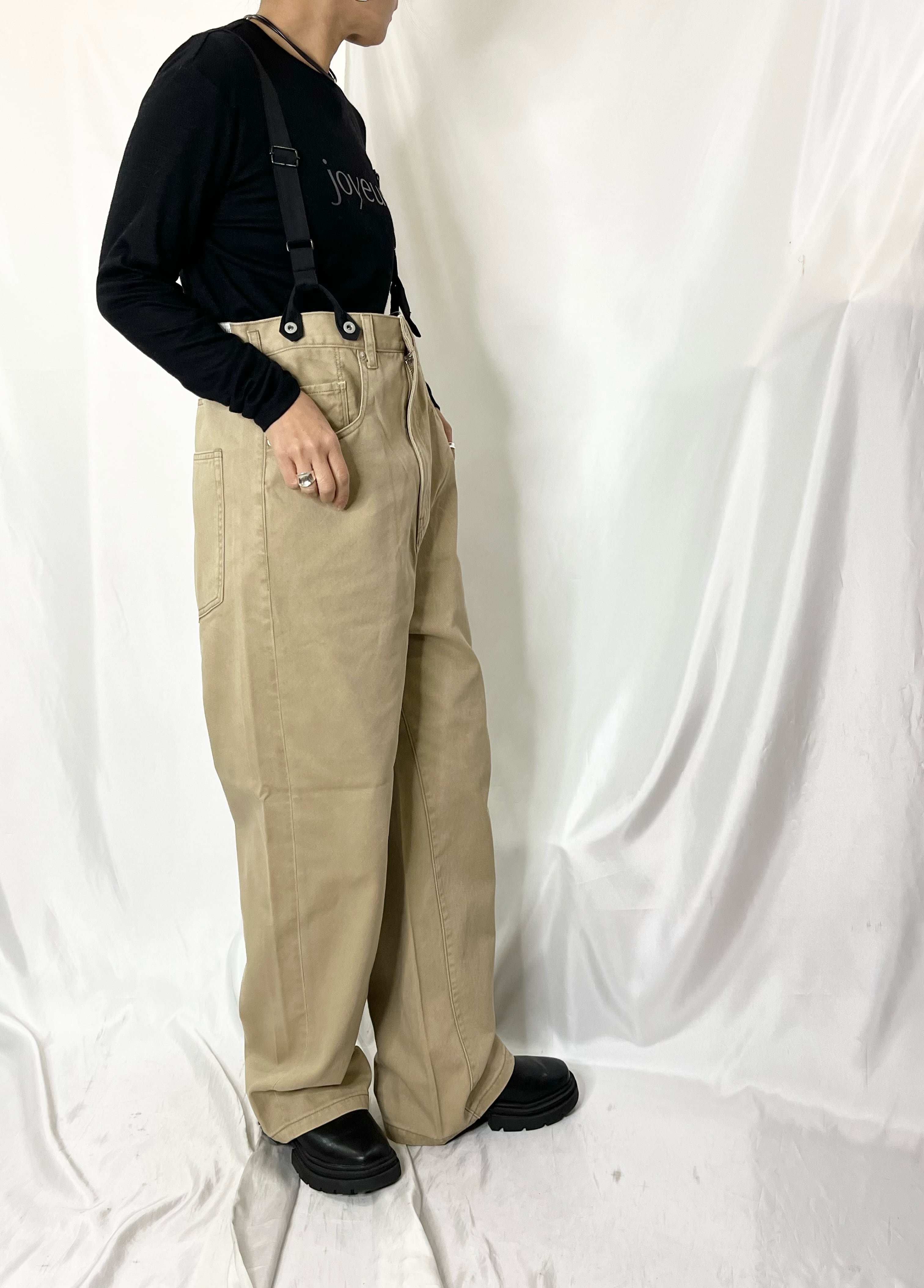 サスペンダーは異素材にしているところもポイントで、取り外してベルトを絞ってハイウエストで着用したり、思いっきり長くしてロールアップしたりと