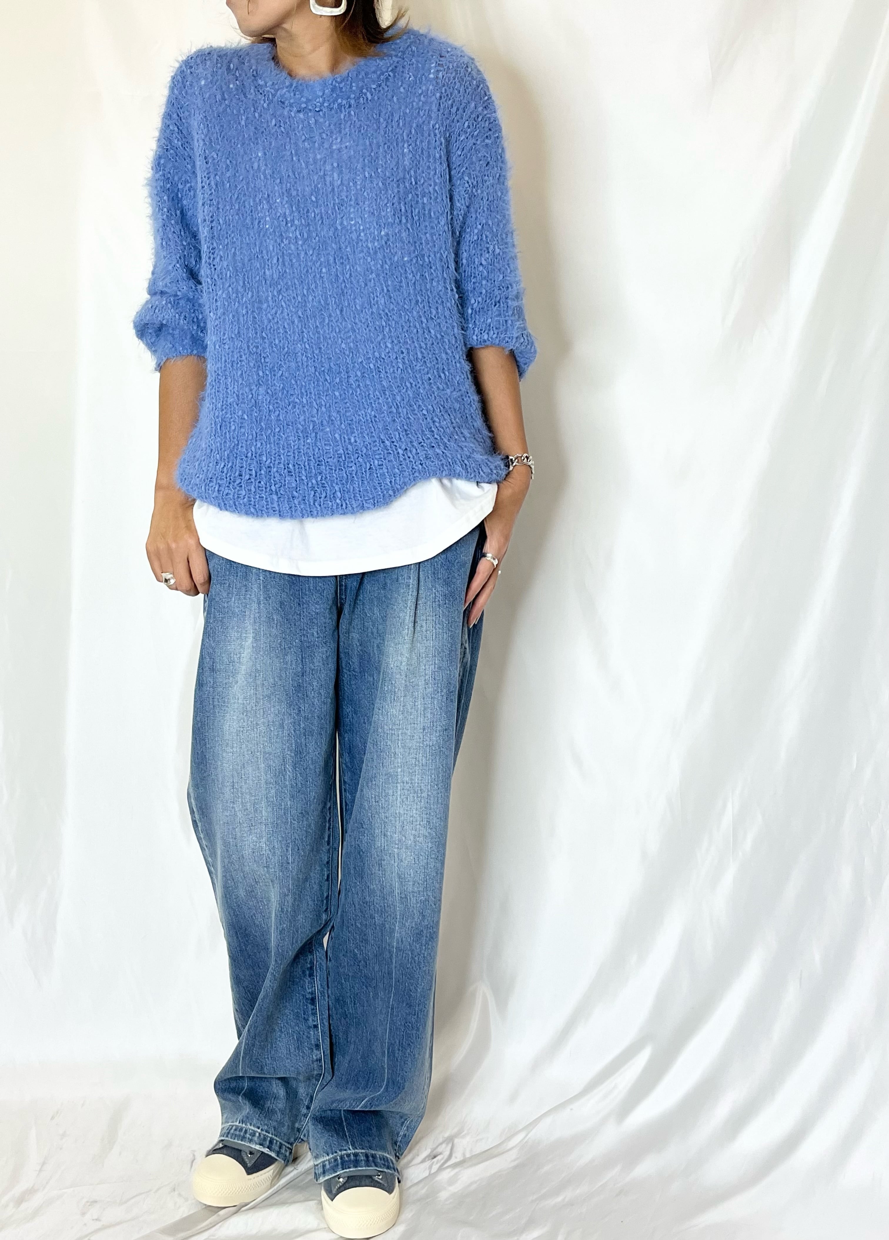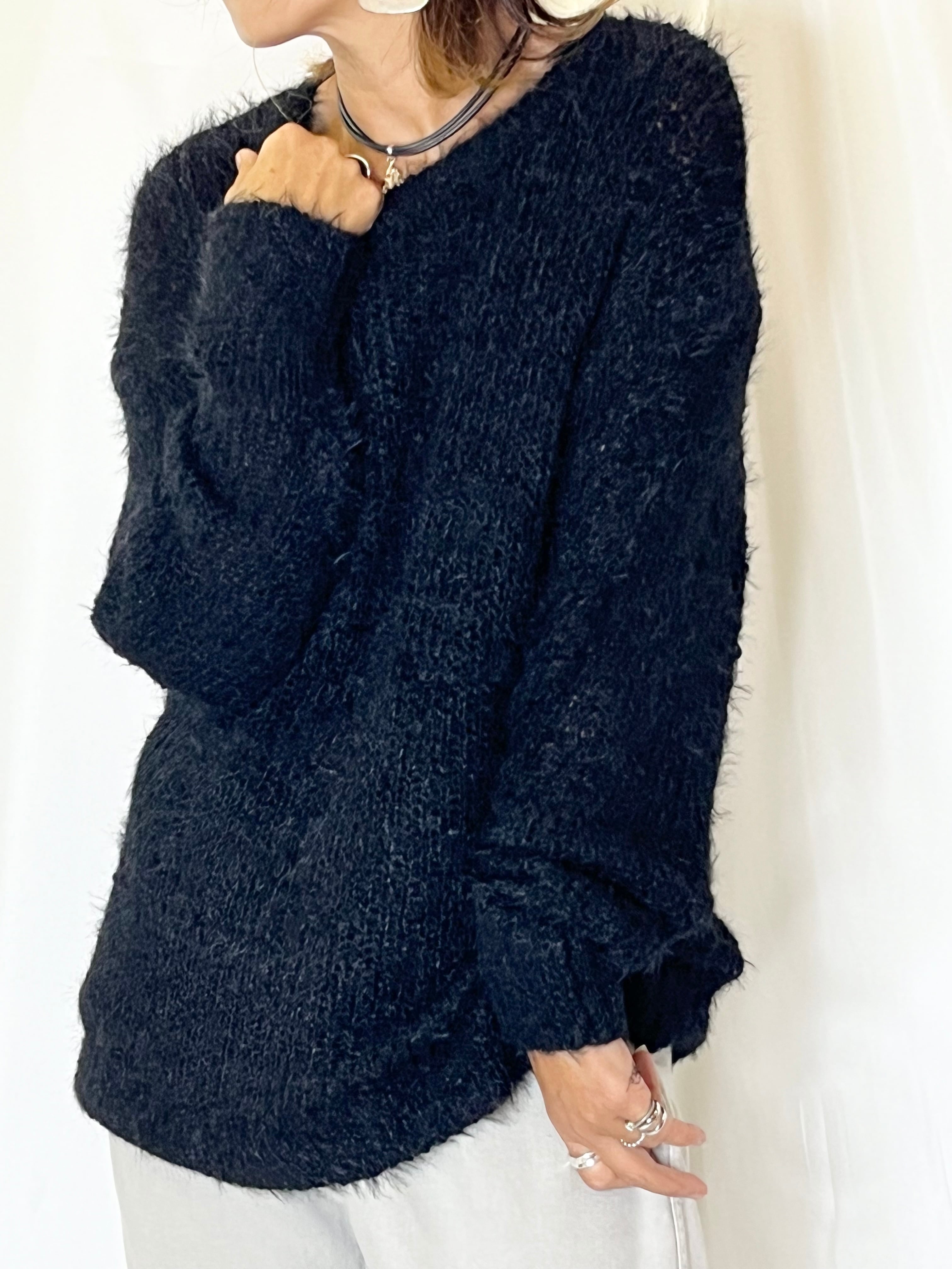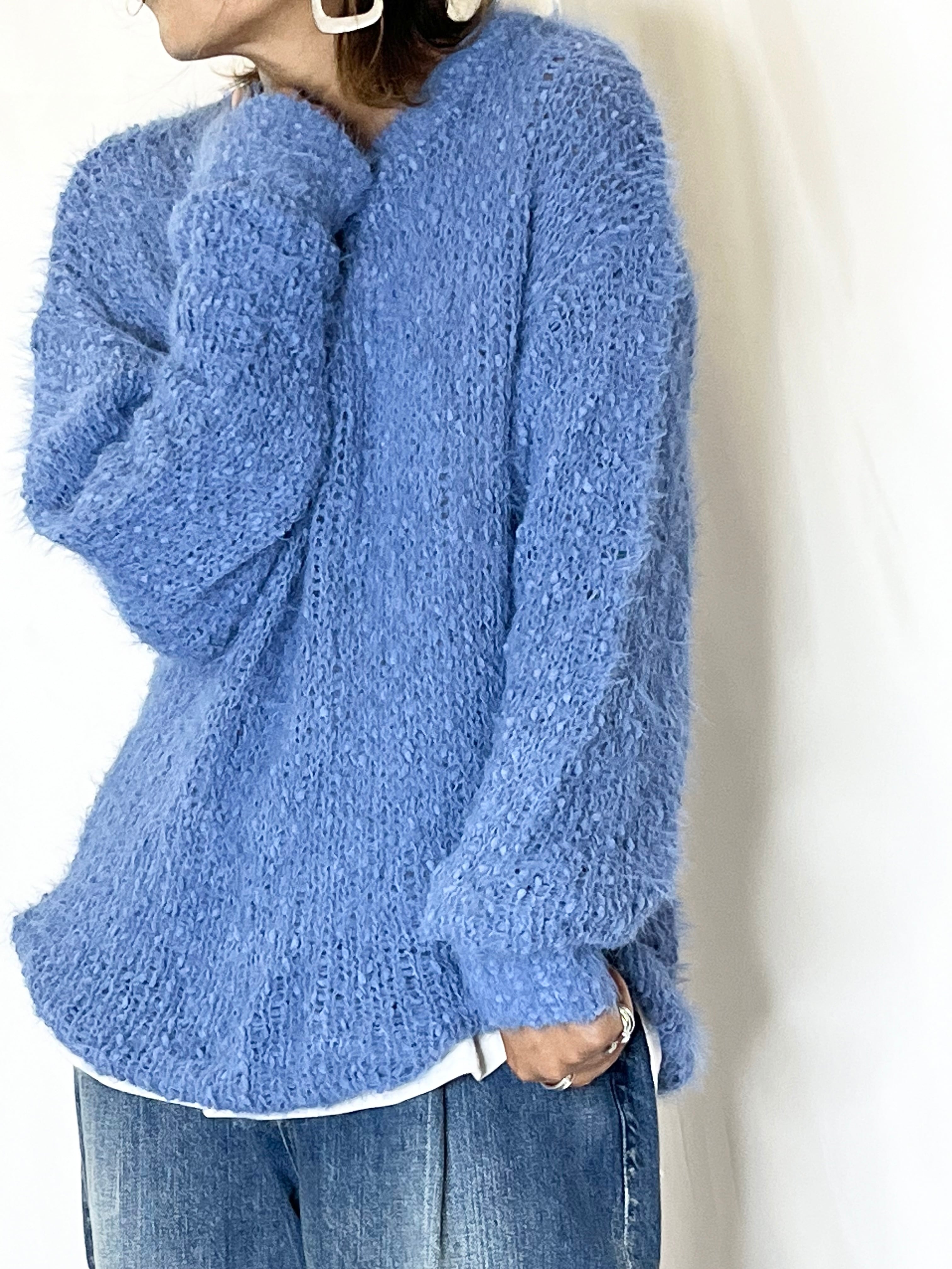 ポコポコしたニットとフェザーヤーンをミックスしたローゲージニット。