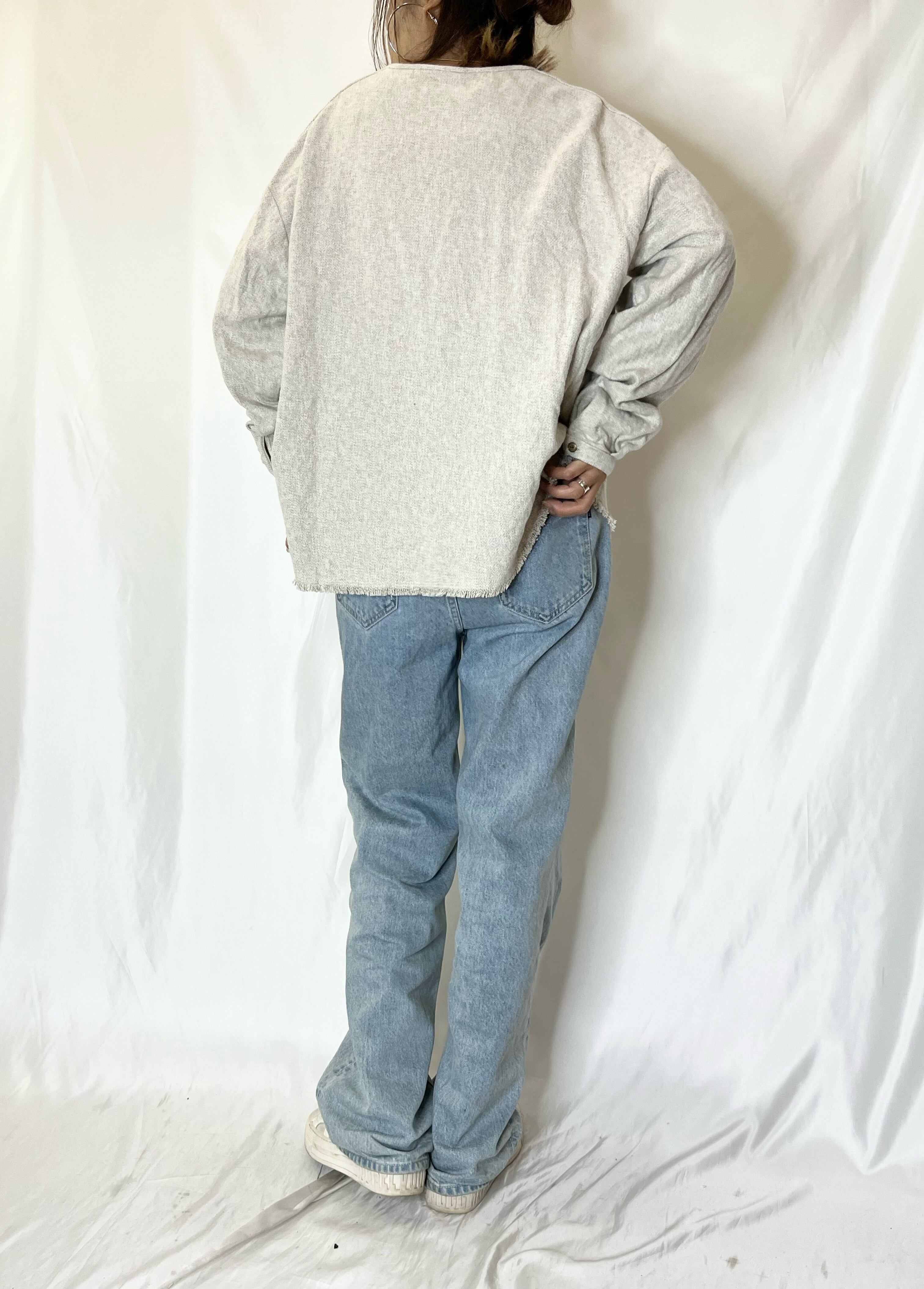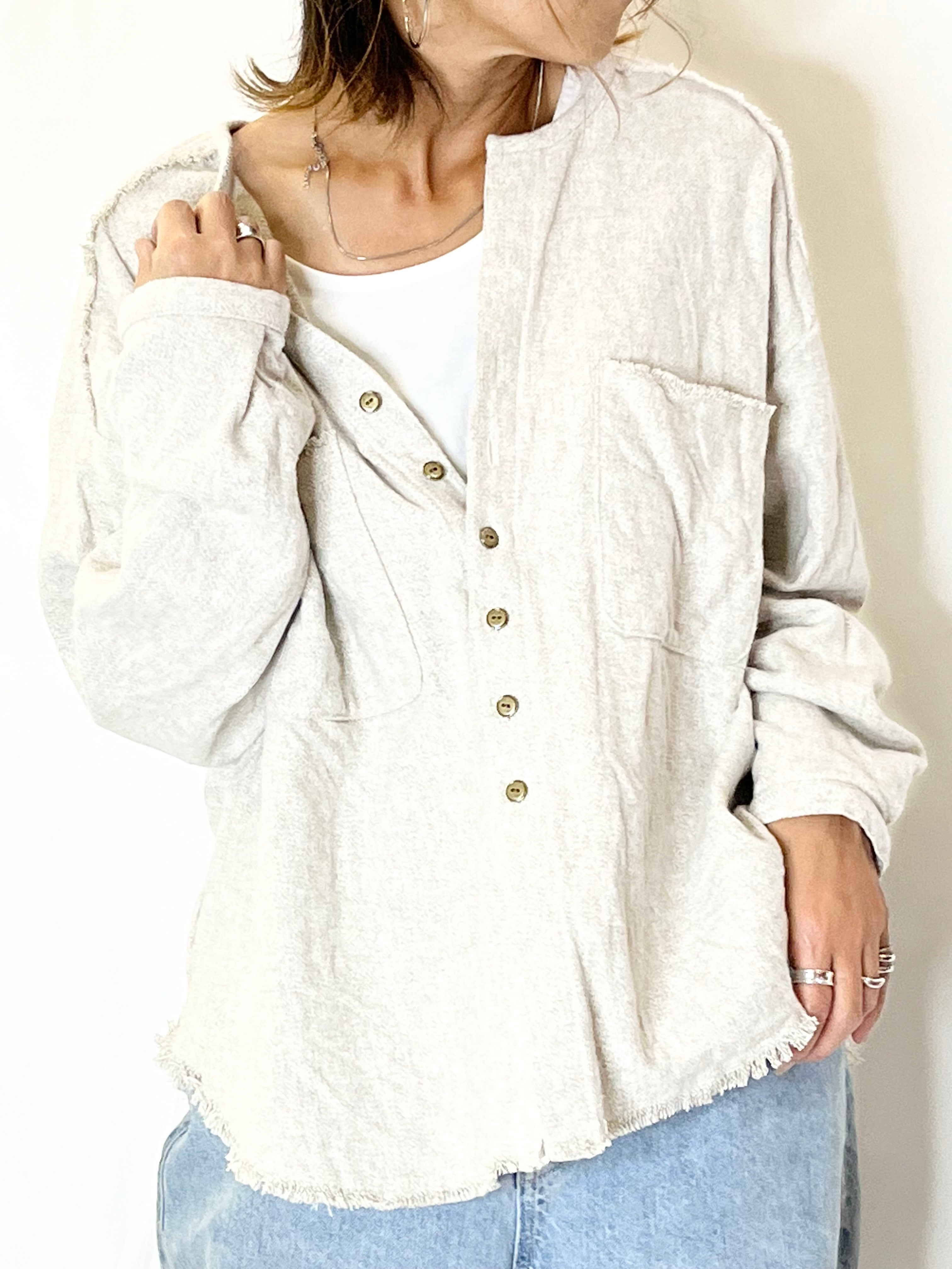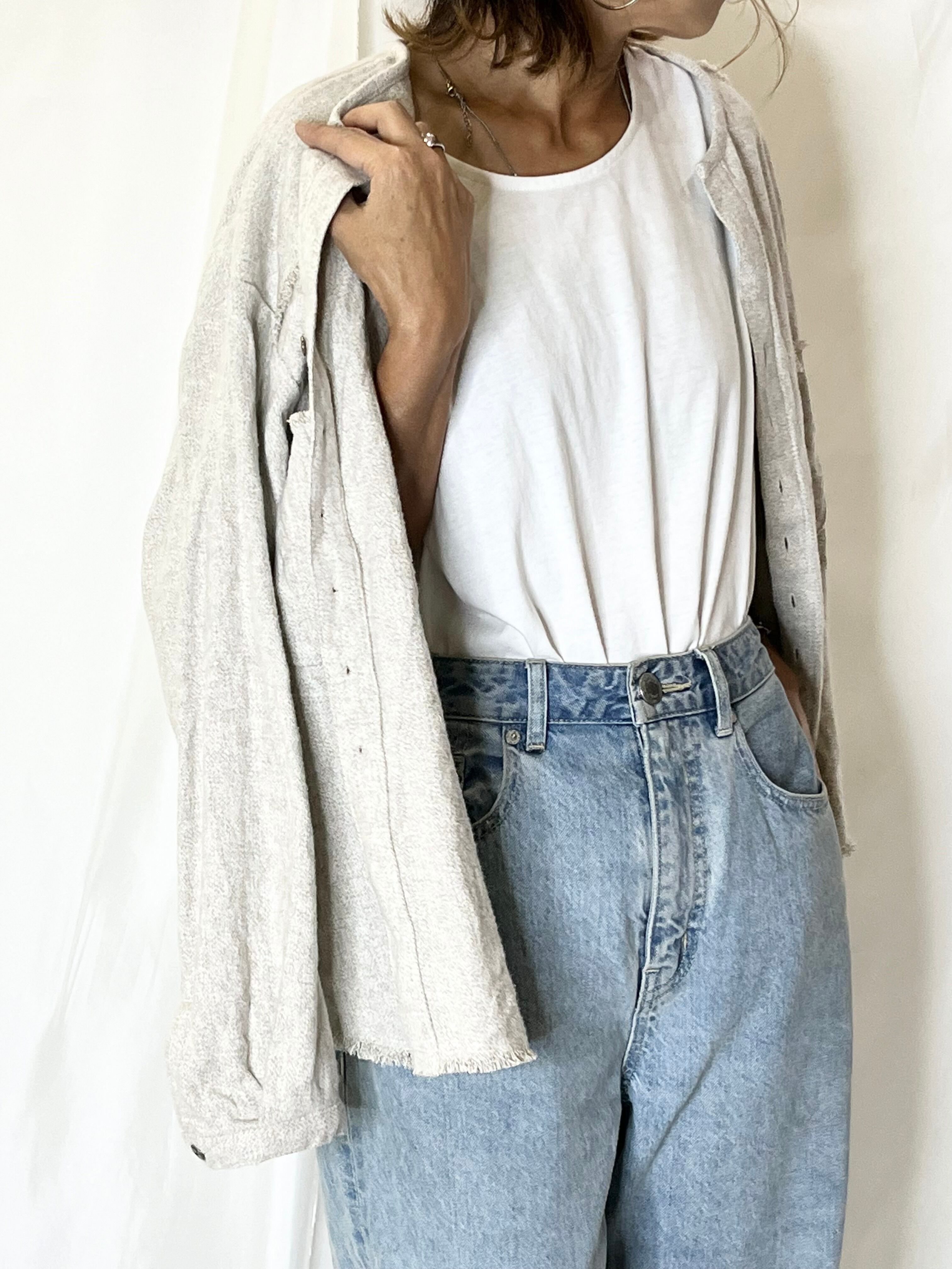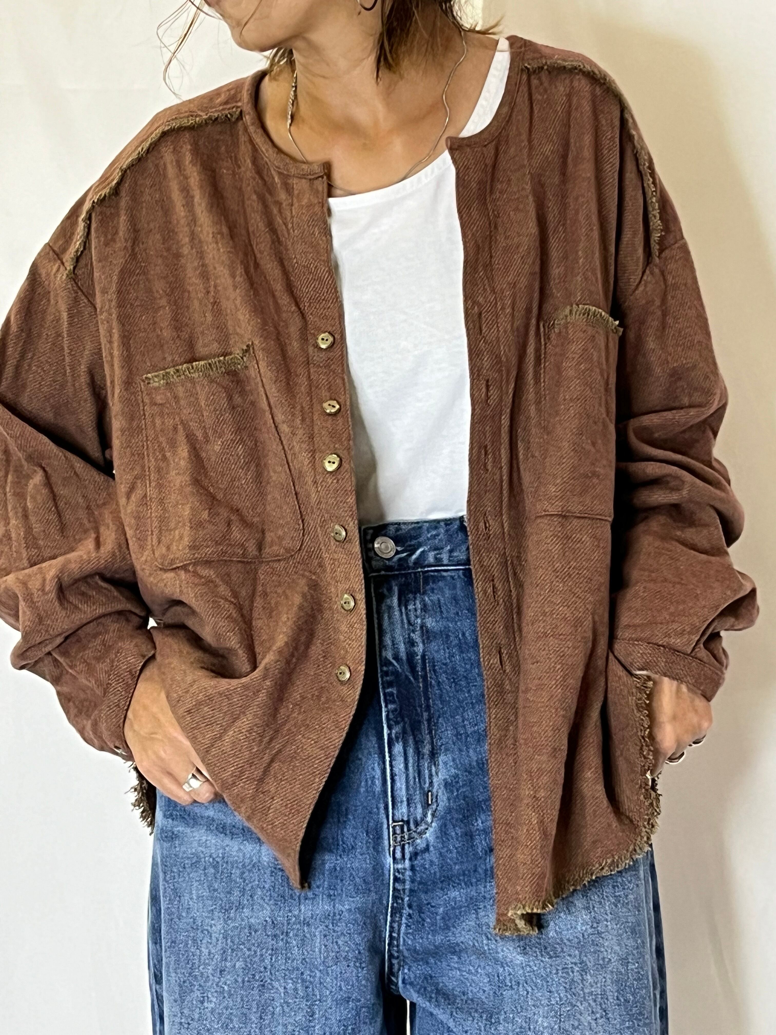 ざっくりと織られたツァーディな素材のノーカラージャケット。