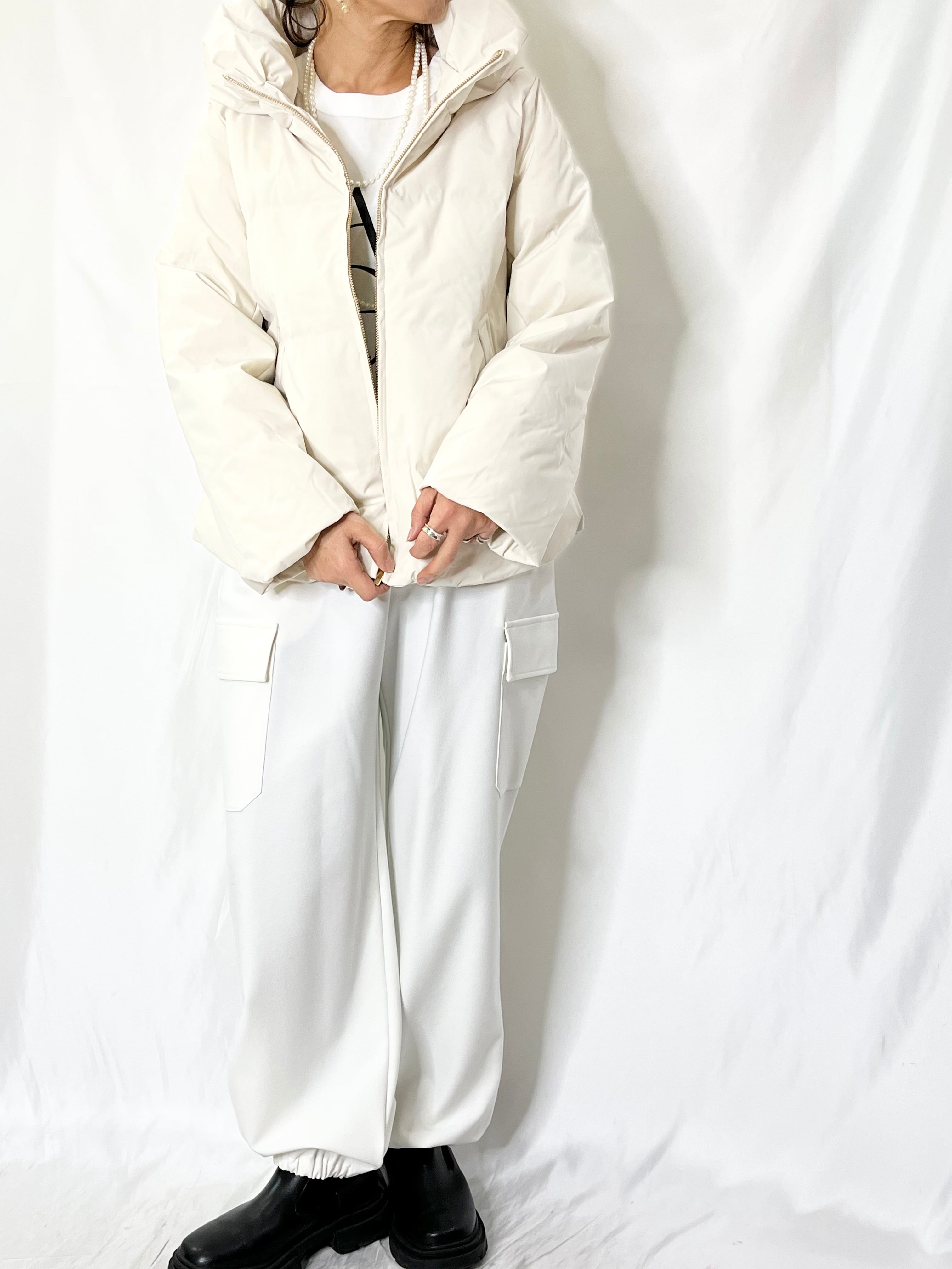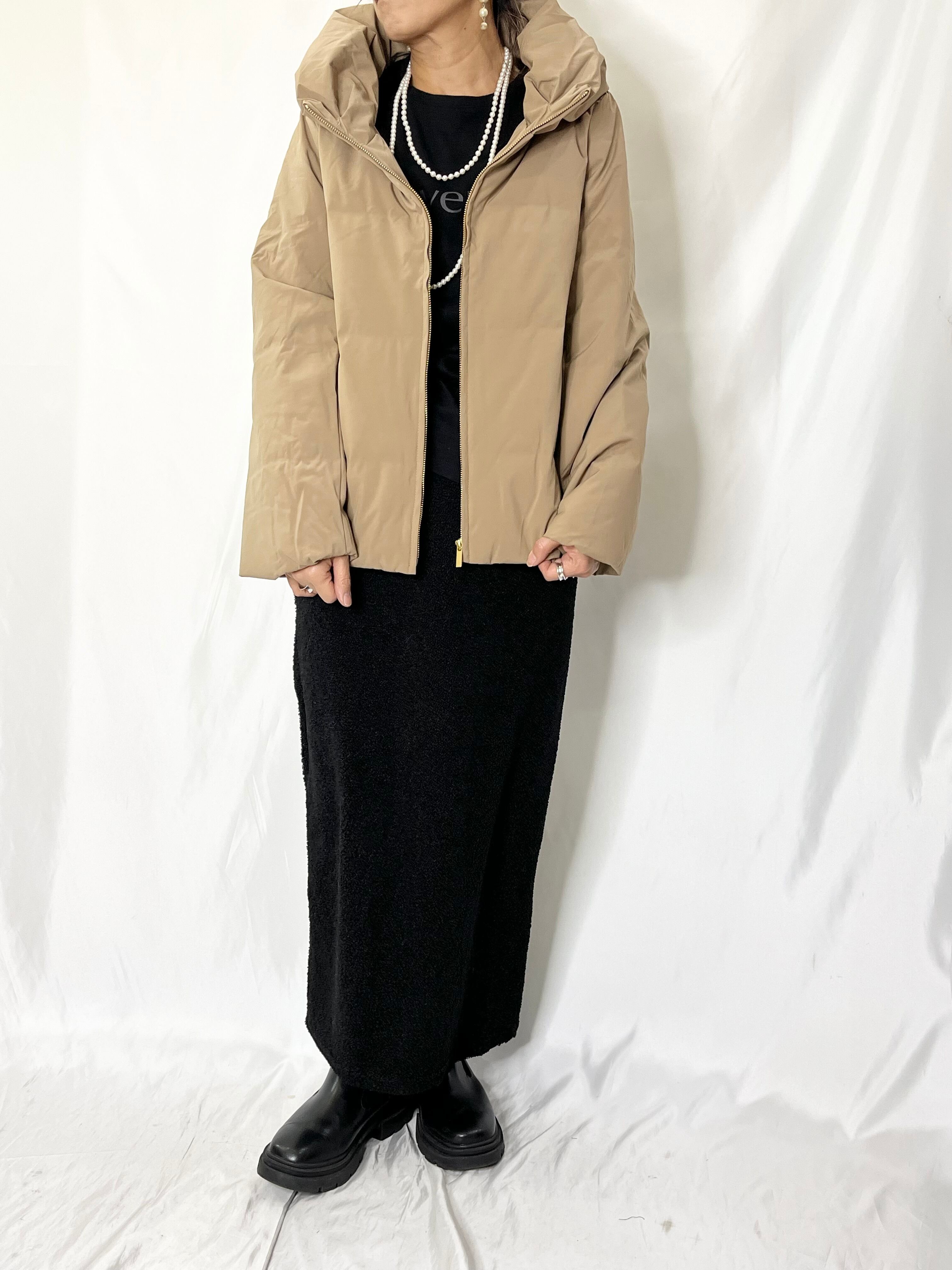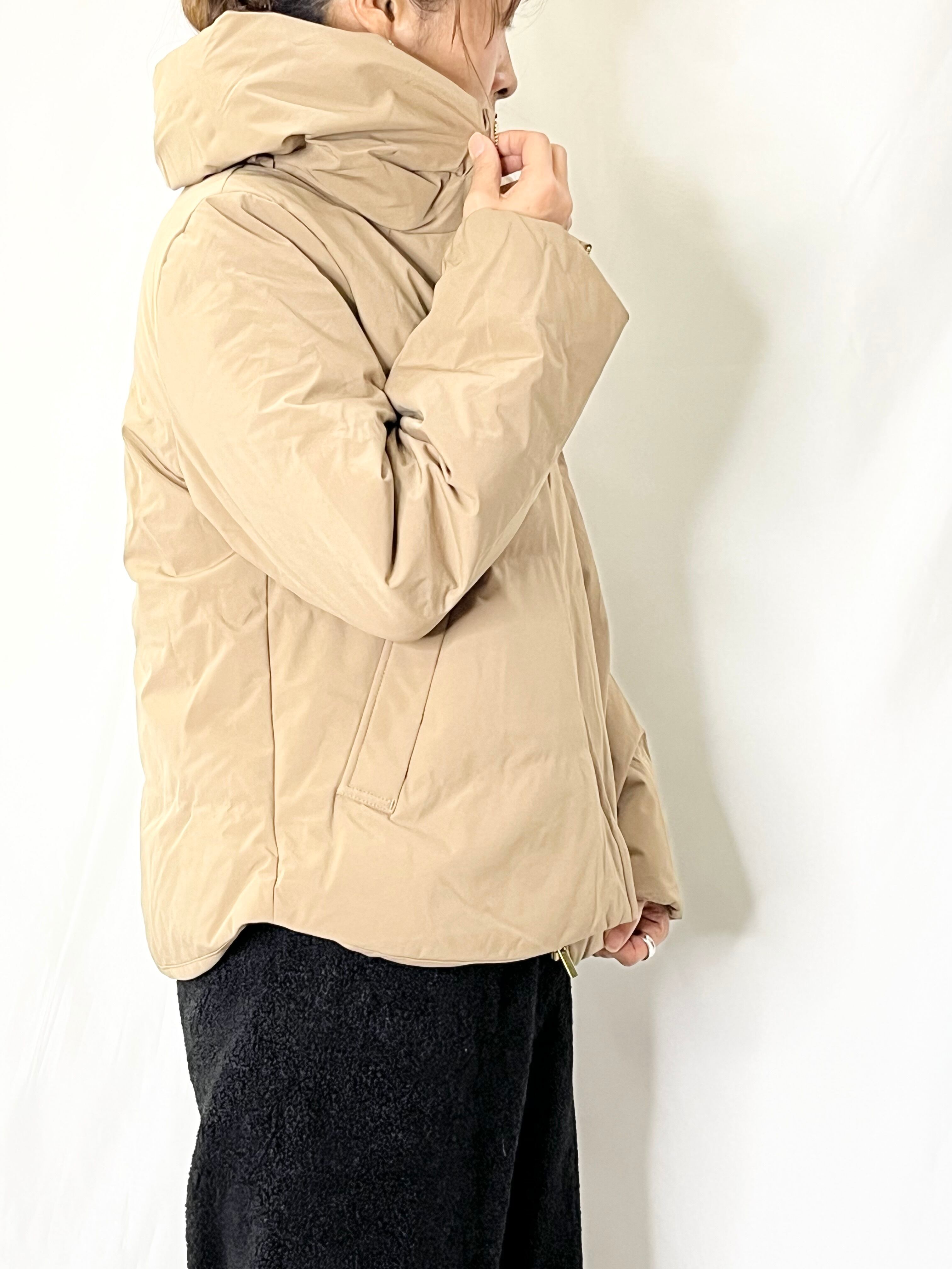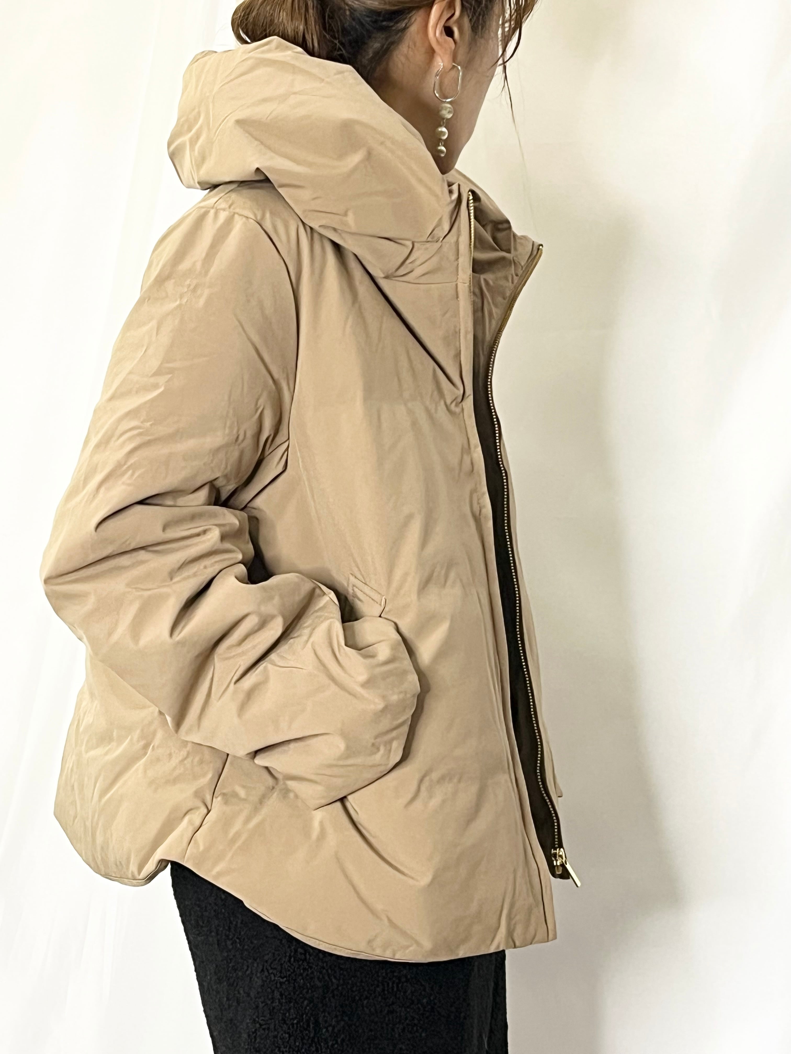 短丈で、シンプルなデザインなので、どんなインナーにも合うダウンです。