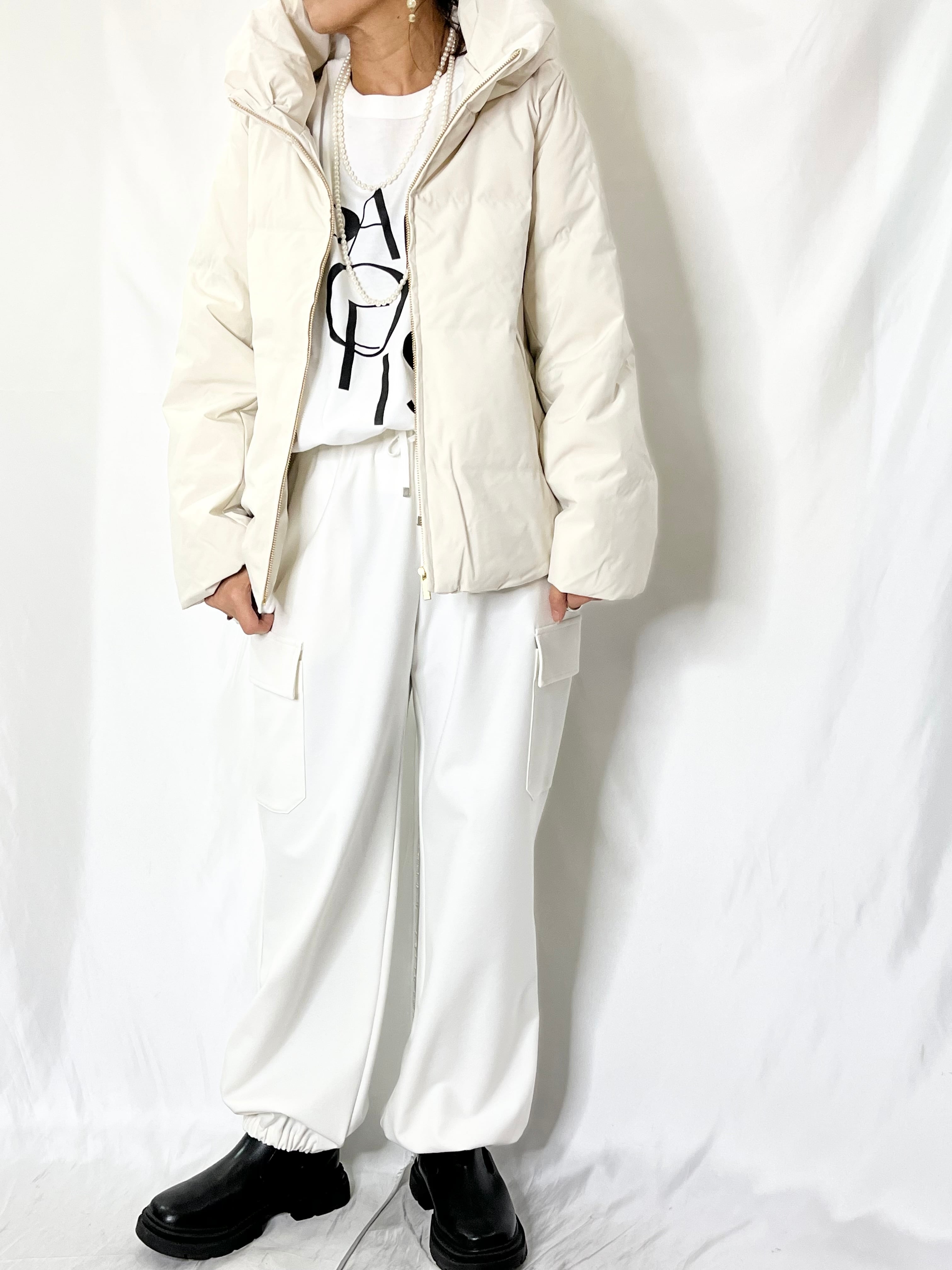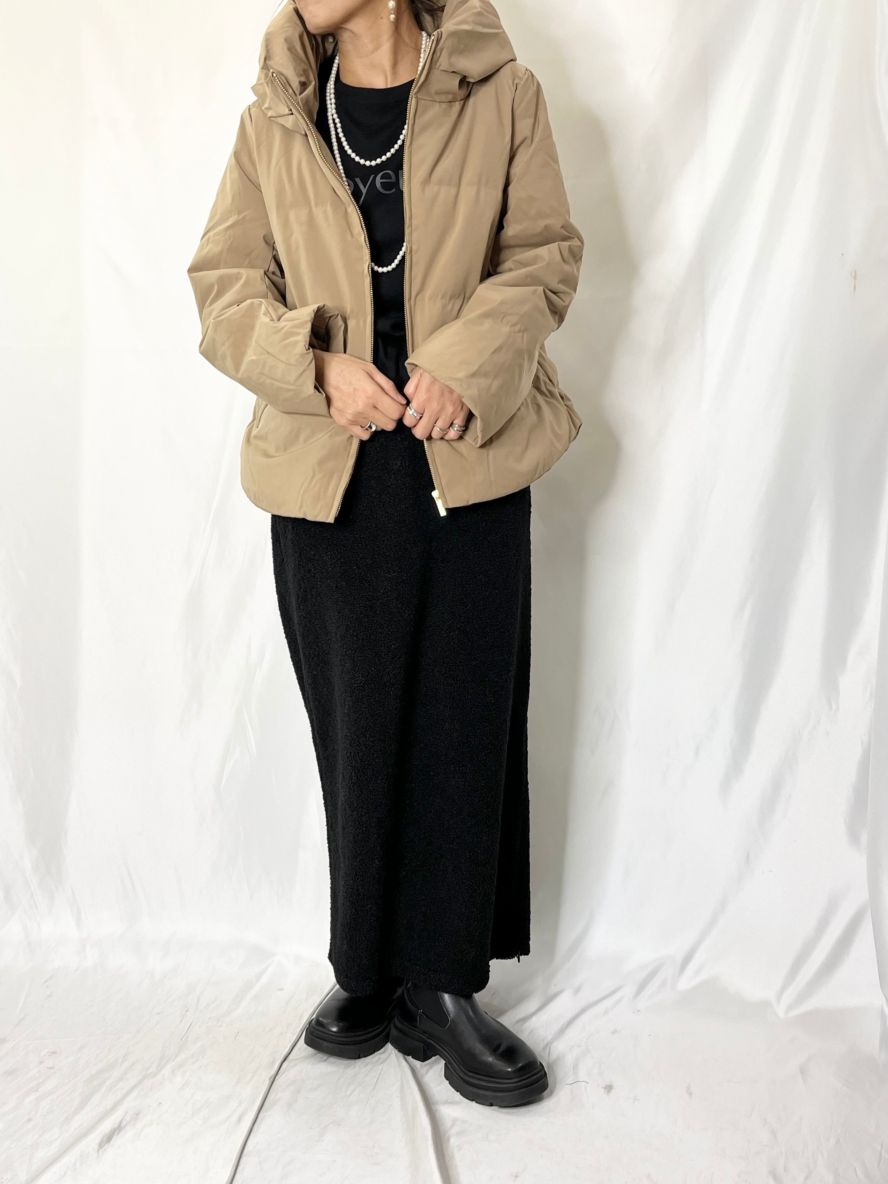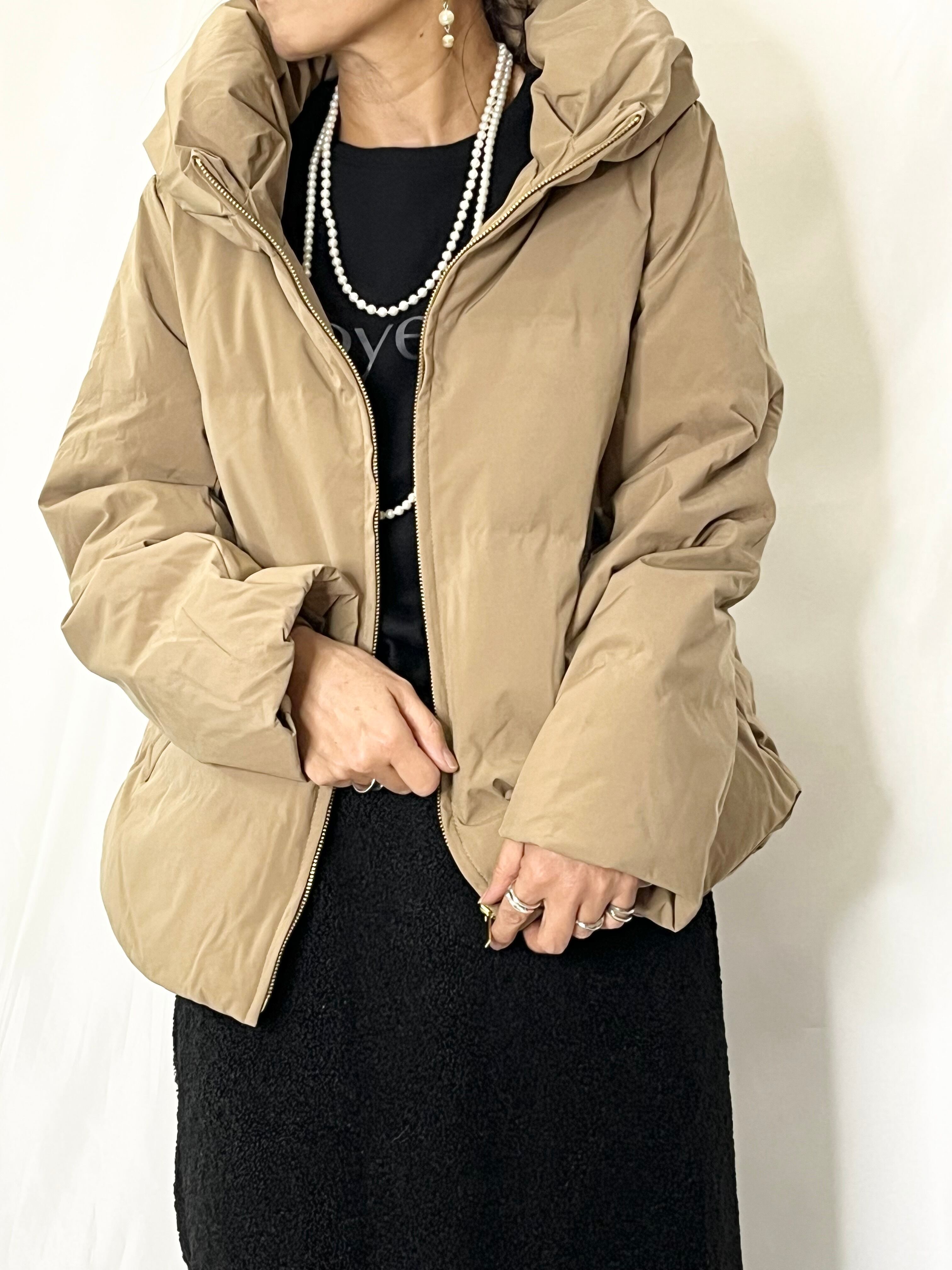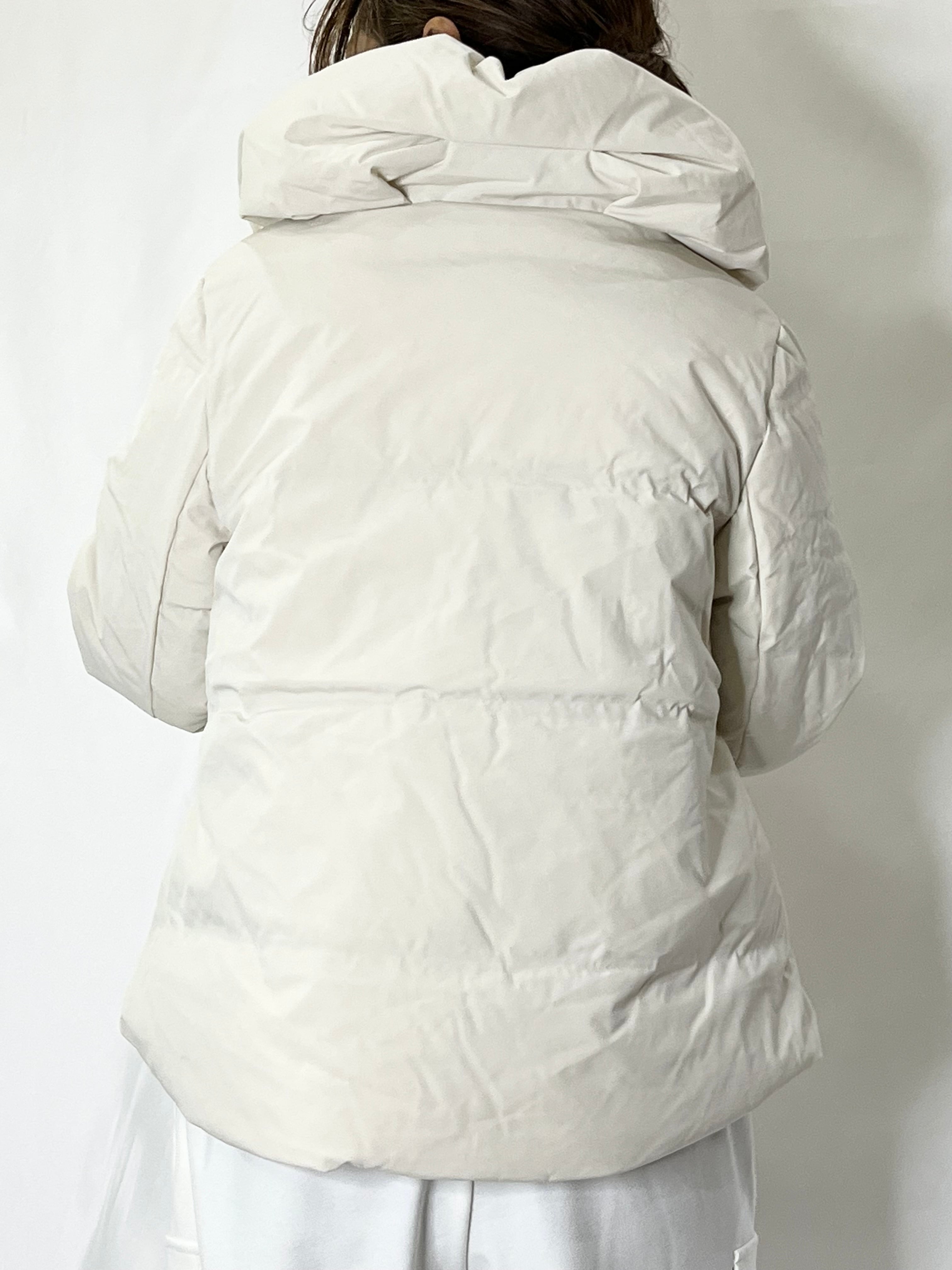 短丈で、シンプルなデザインなので、どんなインナーにも合うダウンです。
