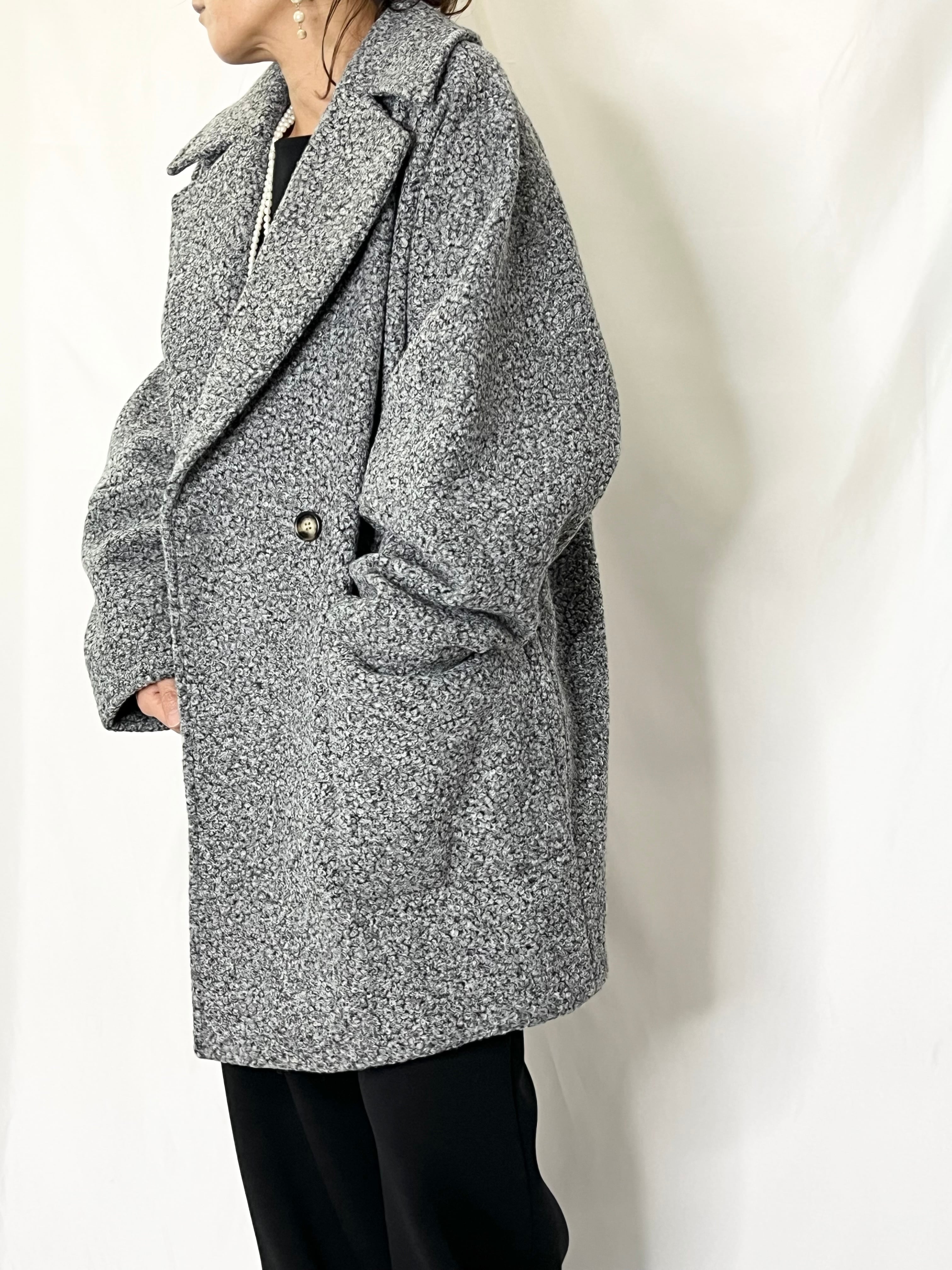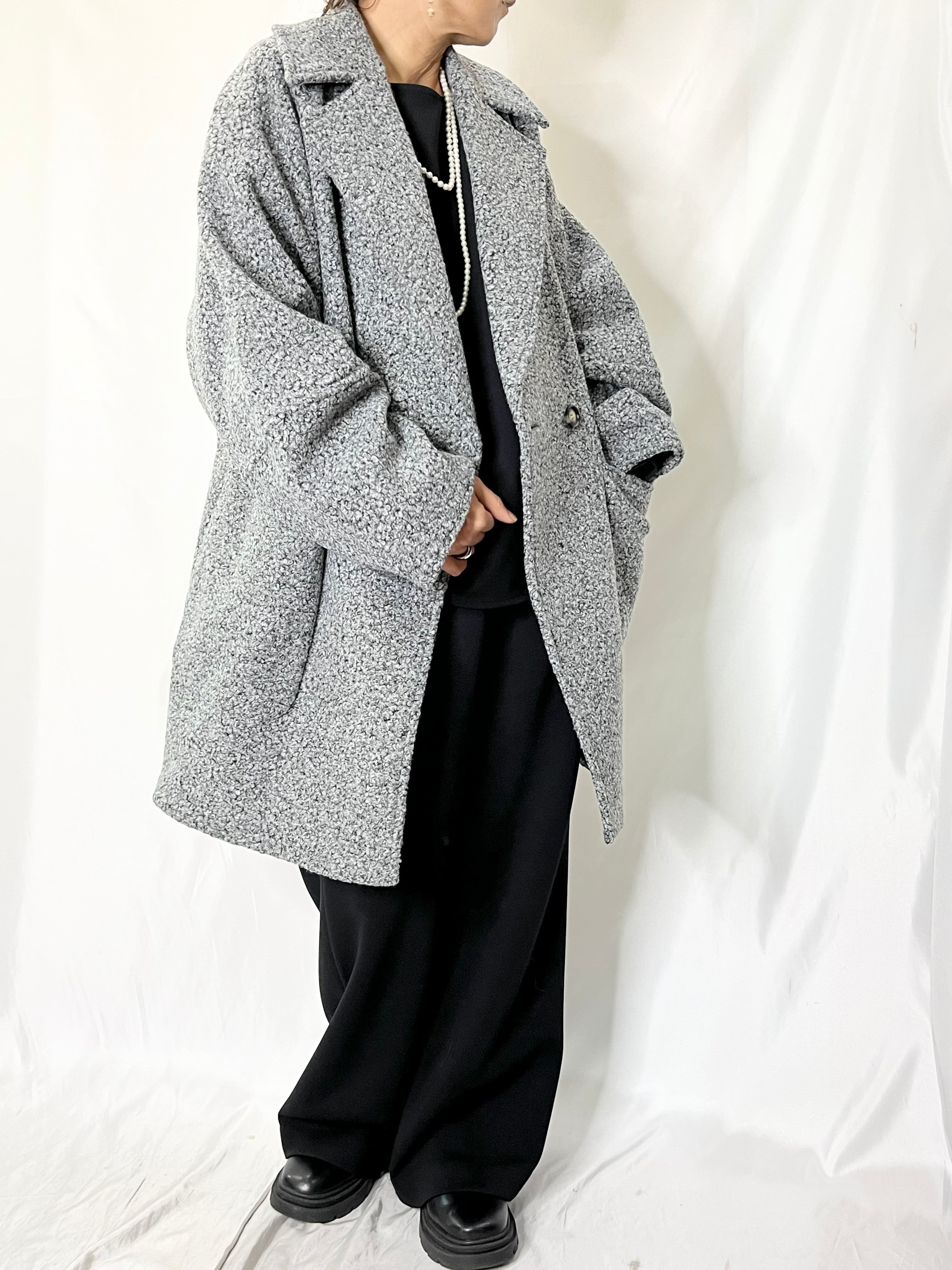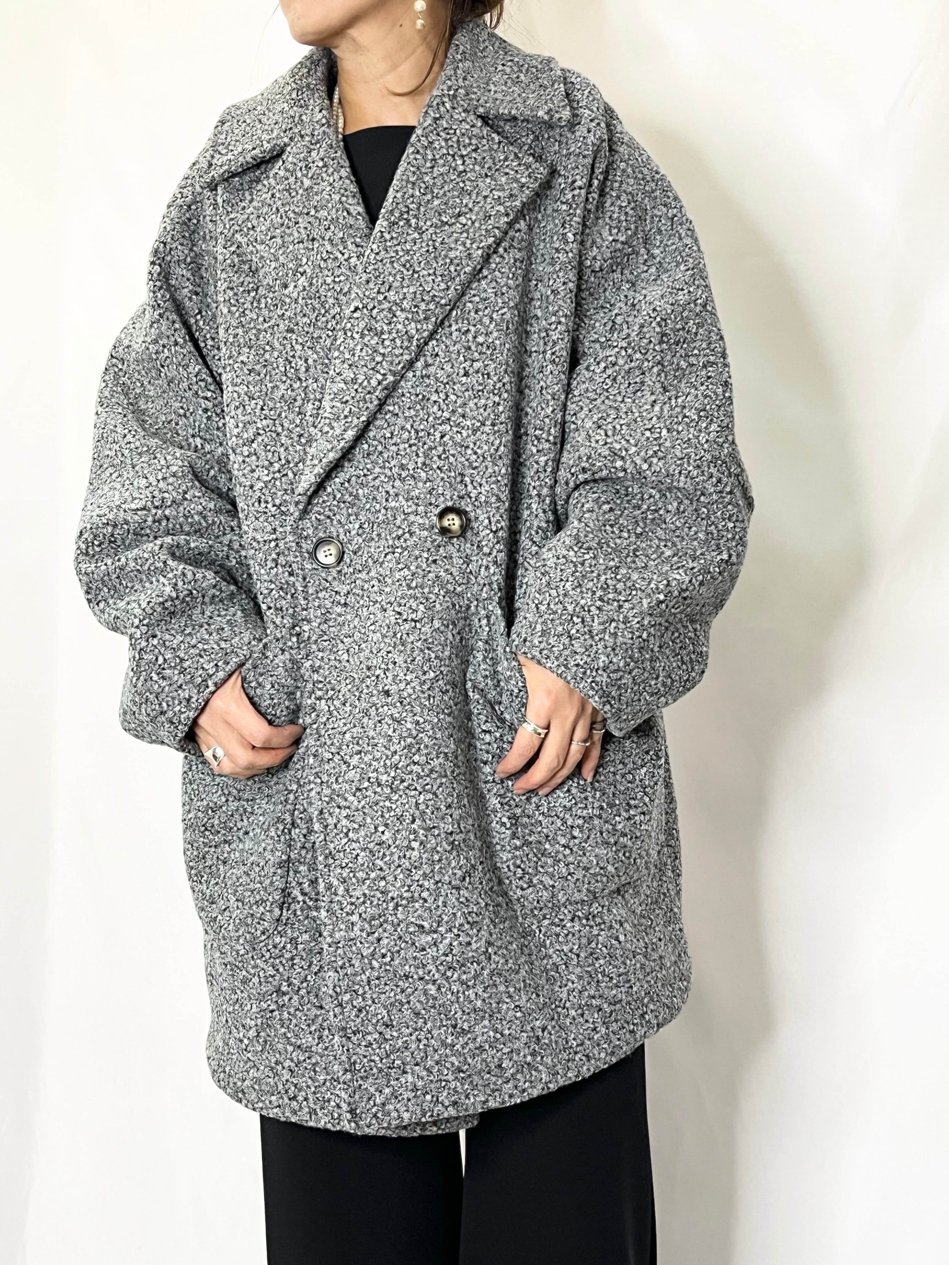 ブークレーの表情のある生地を使用したゆったりコートです。