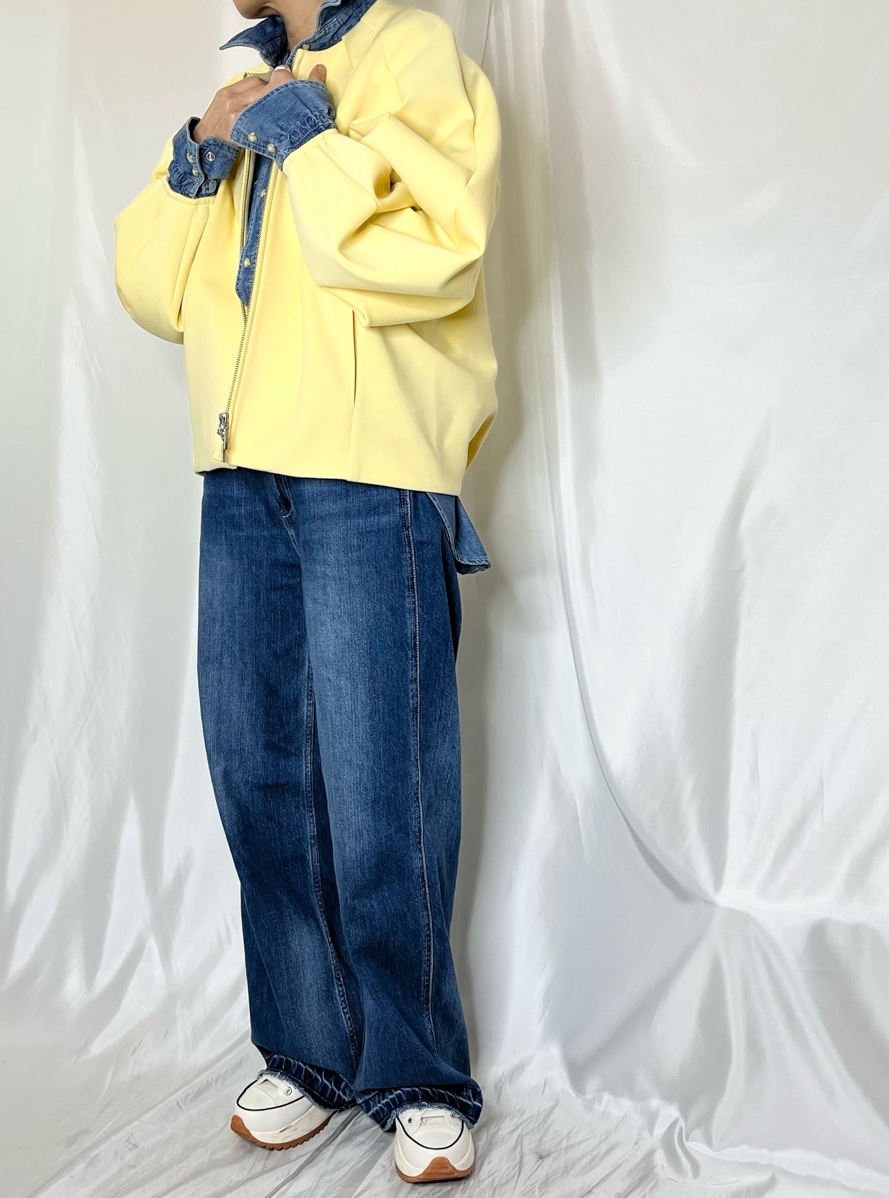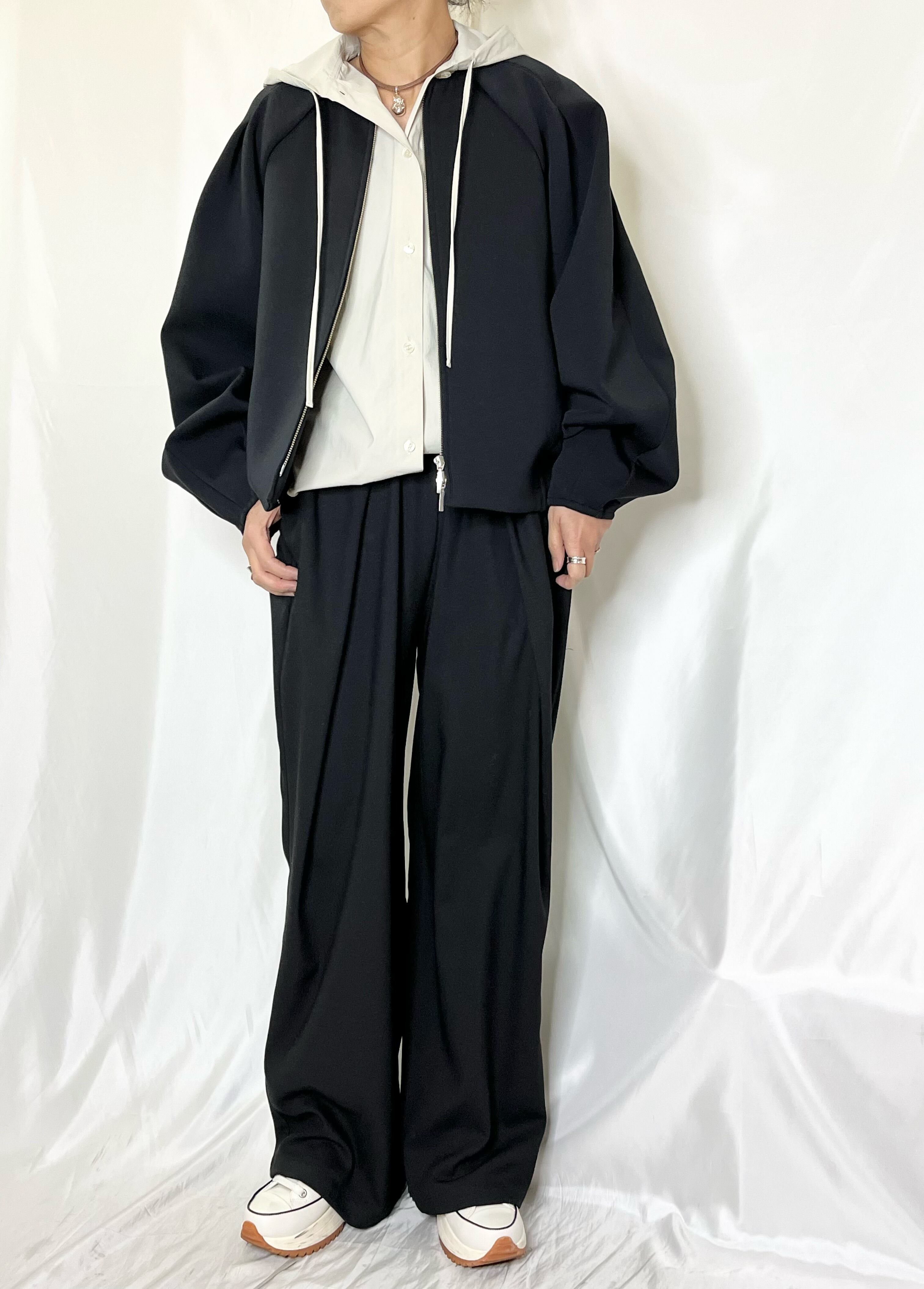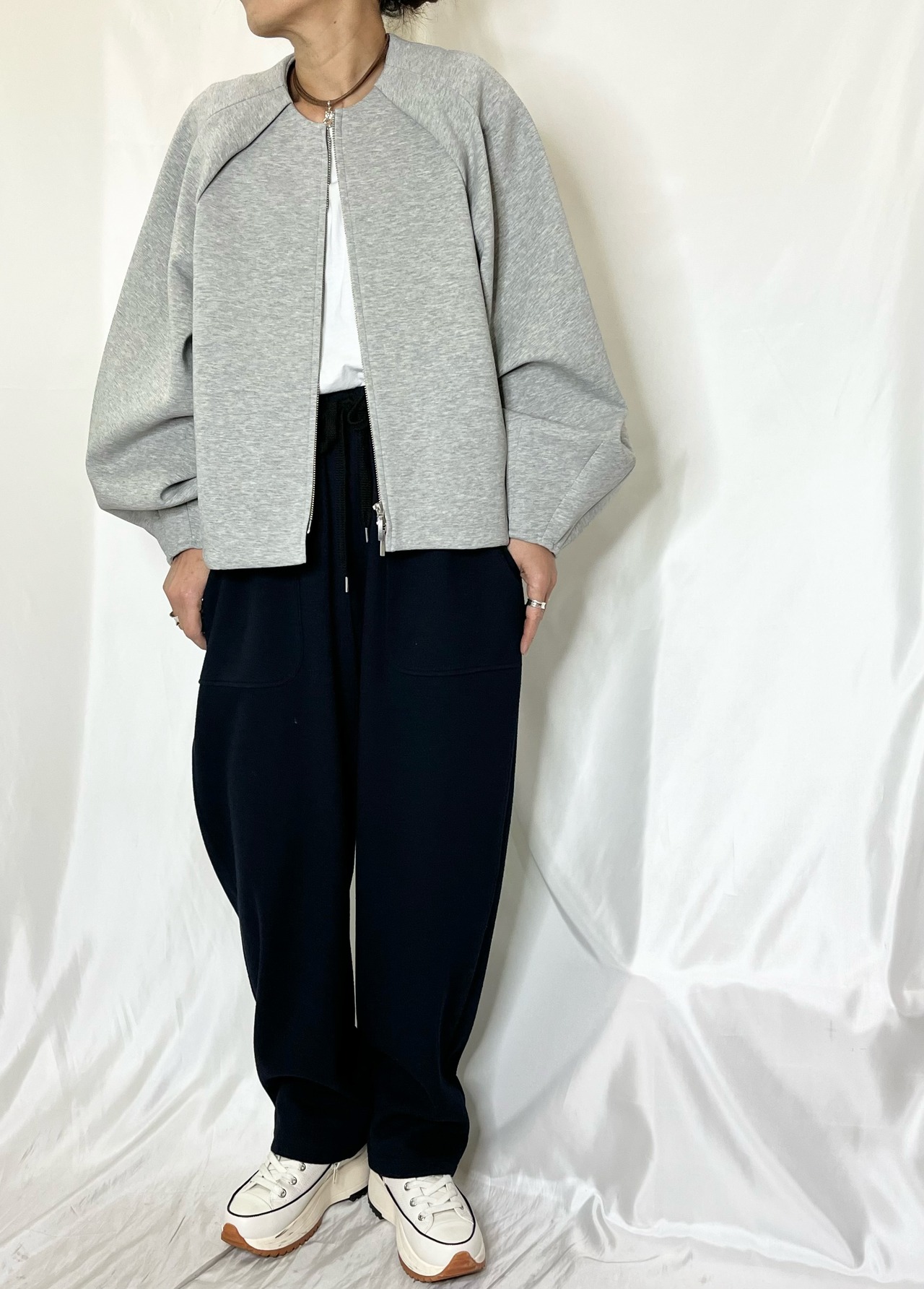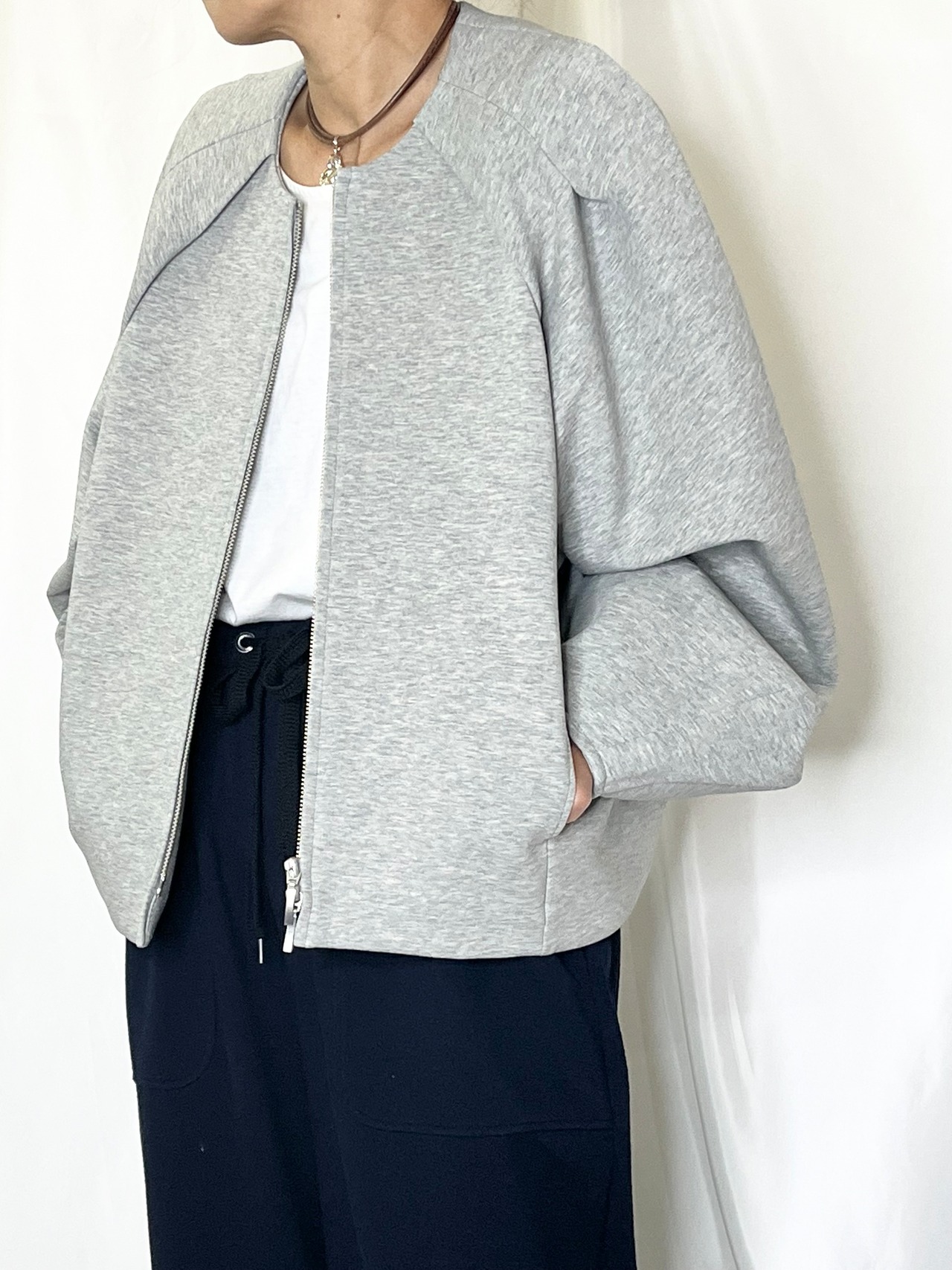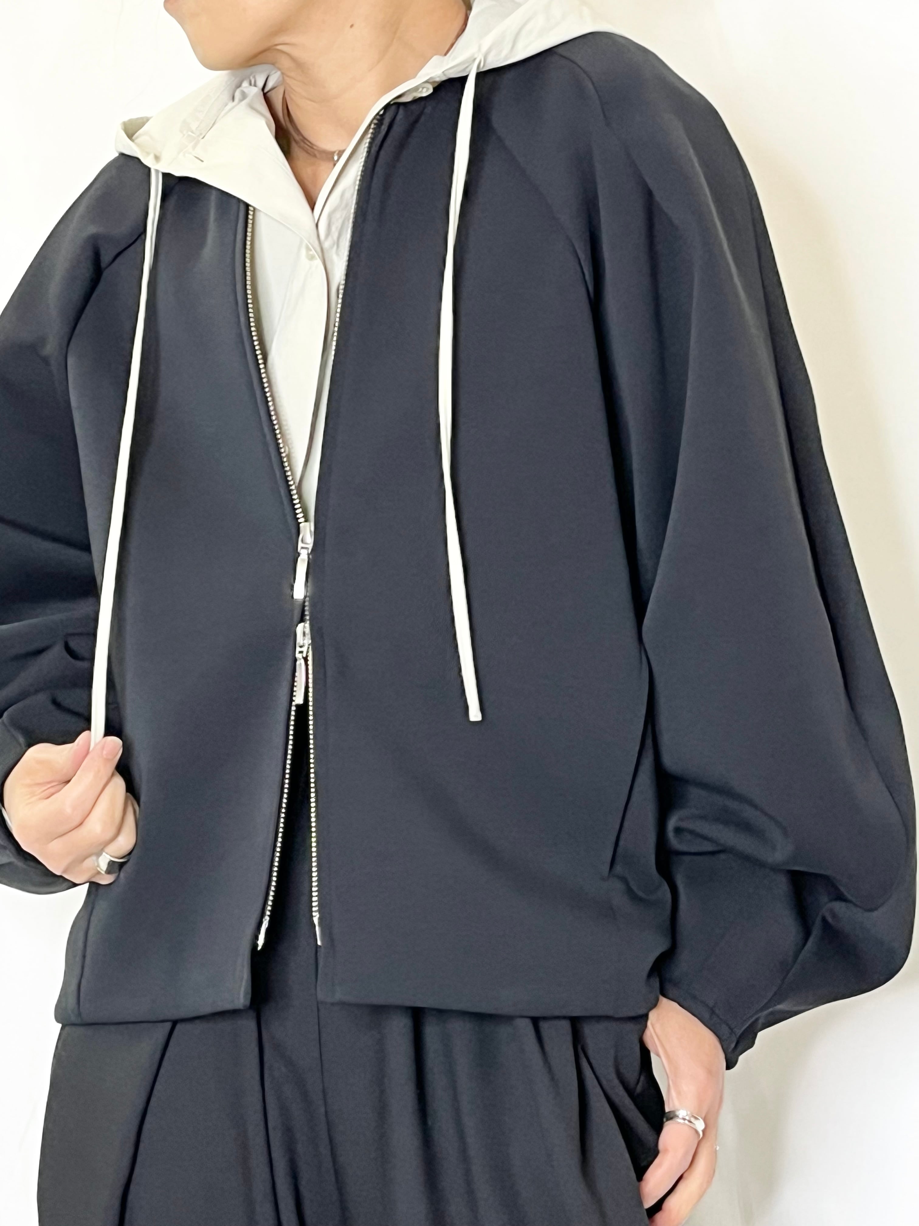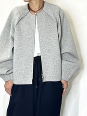 柔らかい素材と袖部分がボリュームのあるデザインはブルゾンでもカジュアルすぎない印象にしてくれます。